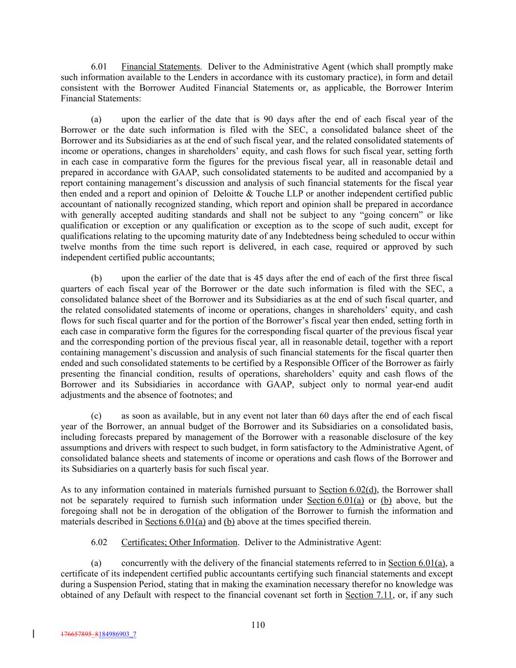 6.01 Financial Statements. Deliver to the Administrative Agent (which shall promptly make such information available to the Lenders in accordance with its customary practice), in form and detail consistent with the Borrower Audited Financial Statements or, as applicable, the Borrower Interim Financial Statements: (a) upon the earlier of the date that is 90 days after the end of each fiscal year of the Borrower or the date such information is filed with the SEC, a consolidated balance sheet of the Borrower and its Subsidiaries as at the end of such fiscal year, and the related consolidated statements of income or operations, changes in shareholders’ equity, and cash flows for such fiscal year, setting forth in each case in comparative form the figures for the previous fiscal year, all in reasonable detail and prepared in accordance with GAAP, such consolidated statements to be audited and accompanied by a report containing management’s discussion and analysis of such financial statements for the fiscal year then ended and a report and opinion of Deloitte & Touche LLP or another independent certified public accountant of nationally recognized standing, which report and opinion shall be prepared in accordance with generally accepted auditing standards and shall not be subject to any “going concern” or like qualification or exception or any qualification or exception as to the scope of such audit, except for qualifications relating to the upcoming maturity date of any Indebtedness being scheduled to occur within twelve months from the time such report is delivered, in each case, required or approved by such independent certified public accountants; (b) upon the earlier of the date that is 45 days after the end of each of the first three fiscal quarters of each fiscal year of the Borrower or the date such information is filed with the SEC, a consolidated balance sheet of the Borrower and its Subsidiaries as at the end of such fiscal quarter, and the related consolidated statements of income or operations, changes in shareholders’ equity, and cash flows for such fiscal quarter and for the portion of the Borrower’s fiscal year then ended, setting forth in each case in comparative form the figures for the corresponding fiscal quarter of the previous fiscal year and the corresponding portion of the previous fiscal year, all in reasonable detail, together with a report containing management’s discussion and analysis of such financial statements for the fiscal quarter then ended and such consolidated statements to be certified by a Responsible Officer of the Borrower as fairly presenting the financial condition, results of operations, shareholders’ equity and cash flows of the Borrower and its Subsidiaries in accordance with GAAP, subject only to normal year-end audit adjustments and the absence of footnotes; and (c) as soon as available, but in any event not later than 60 days after the end of each fiscal year of the Borrower, an annual budget of the Borrower and its Subsidiaries on a consolidated basis, including forecasts prepared by management of the Borrower with a reasonable disclosure of the key assumptions and drivers with respect to such budget, in form satisfactory to the Administrative Agent, of consolidated balance sheets and statements of income or operations and cash flows of the Borrower and its Subsidiaries on a quarterly basis for such fiscal year. As to any information contained in materials furnished pursuant to Section 6.02(d), the Borrower shall not be separately required to furnish such information under Section 6.01(a) or (b) above, but the foregoing shall not be in derogation of the obligation of the Borrower to furnish the information and materials described in Sections 6.01(a) and (b) above at the times specified therein. 6.02 Certificates; Other Information. Deliver to the Administrative Agent: (a) concurrently with the delivery of the financial statements referred to in Section 6.01(a), a certificate of its independent certified public accountants certifying such financial statements and except during a Suspension Period, stating that in making the examination necessary therefor no knowledge was obtained of any Default with respect to the financial covenant set forth in Section 7.11, or, if any such 110 176657895_8184986903_7