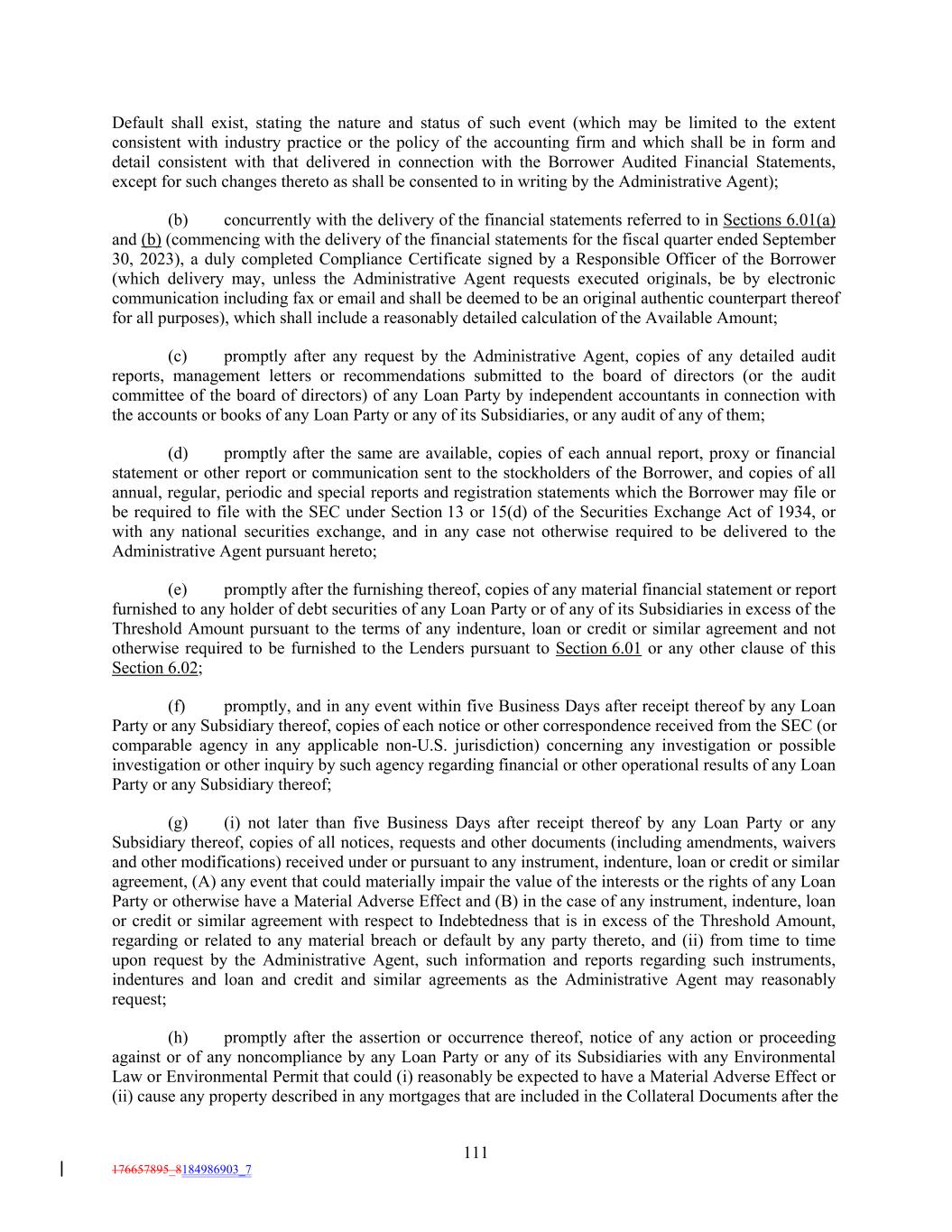 Default shall exist, stating the nature and status of such event (which may be limited to the extent consistent with industry practice or the policy of the accounting firm and which shall be in form and detail consistent with that delivered in connection with the Borrower Audited Financial Statements, except for such changes thereto as shall be consented to in writing by the Administrative Agent); (b) concurrently with the delivery of the financial statements referred to in Sections 6.01(a) and (b) (commencing with the delivery of the financial statements for the fiscal quarter ended September 30, 2023), a duly completed Compliance Certificate signed by a Responsible Officer of the Borrower (which delivery may, unless the Administrative Agent requests executed originals, be by electronic communication including fax or email and shall be deemed to be an original authentic counterpart thereof for all purposes), which shall include a reasonably detailed calculation of the Available Amount; (c) promptly after any request by the Administrative Agent, copies of any detailed audit reports, management letters or recommendations submitted to the board of directors (or the audit committee of the board of directors) of any Loan Party by independent accountants in connection with the accounts or books of any Loan Party or any of its Subsidiaries, or any audit of any of them; (d) promptly after the same are available, copies of each annual report, proxy or financial statement or other report or communication sent to the stockholders of the Borrower, and copies of all annual, regular, periodic and special reports and registration statements which the Borrower may file or be required to file with the SEC under Section 13 or 15(d) of the Securities Exchange Act of 1934, or with any national securities exchange, and in any case not otherwise required to be delivered to the Administrative Agent pursuant hereto; (e) promptly after the furnishing thereof, copies of any material financial statement or report furnished to any holder of debt securities of any Loan Party or of any of its Subsidiaries in excess of the Threshold Amount pursuant to the terms of any indenture, loan or credit or similar agreement and not otherwise required to be furnished to the Lenders pursuant to Section 6.01 or any other clause of this Section 6.02; (f) promptly, and in any event within five Business Days after receipt thereof by any Loan Party or any Subsidiary thereof, copies of each notice or other correspondence received from the SEC (or comparable agency in any applicable non-U.S. jurisdiction) concerning any investigation or possible investigation or other inquiry by such agency regarding financial or other operational results of any Loan Party or any Subsidiary thereof; (g) (i) not later than five Business Days after receipt thereof by any Loan Party or any Subsidiary thereof, copies of all notices, requests and other documents (including amendments, waivers and other modifications) received under or pursuant to any instrument, indenture, loan or credit or similar agreement, (A) any event that could materially impair the value of the interests or the rights of any Loan Party or otherwise have a Material Adverse Effect and (B) in the case of any instrument, indenture, loan or credit or similar agreement with respect to Indebtedness that is in excess of the Threshold Amount, regarding or related to any material breach or default by any party thereto, and (ii) from time to time upon request by the Administrative Agent, such information and reports regarding such instruments, indentures and loan and credit and similar agreements as the Administrative Agent may reasonably request; (h) promptly after the assertion or occurrence thereof, notice of any action or proceeding against or of any noncompliance by any Loan Party or any of its Subsidiaries with any Environmental Law or Environmental Permit that could (i) reasonably be expected to have a Material Adverse Effect or (ii) cause any property described in any mortgages that are included in the Collateral Documents after the 111 176657895_8184986903_7