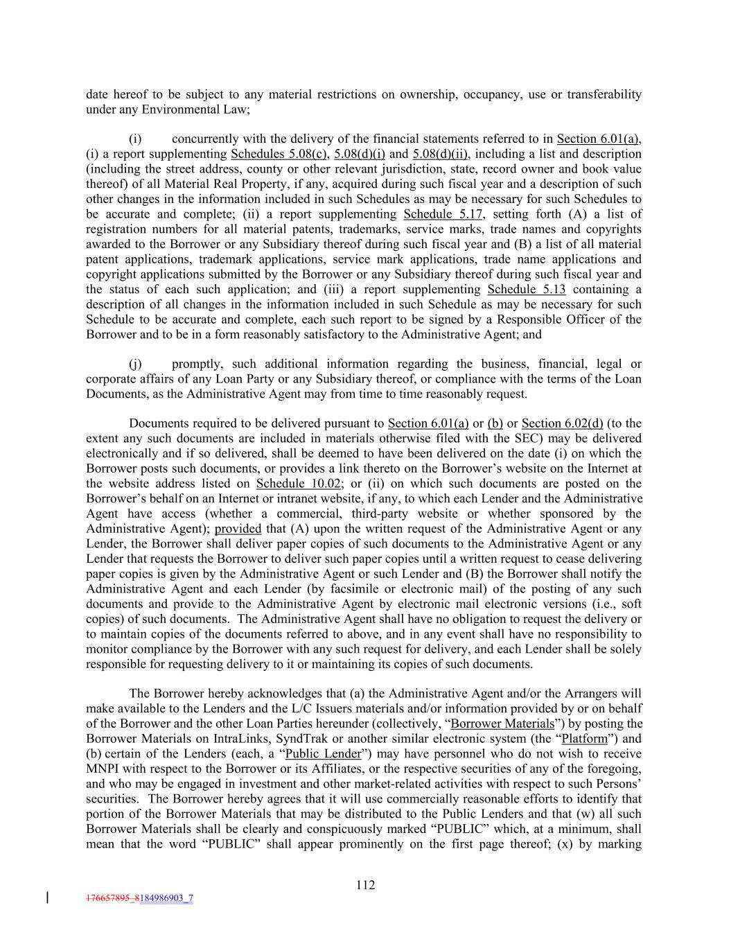 date hereof to be subject to any material restrictions on ownership, occupancy, use or transferability under any Environmental Law; (i) concurrently with the delivery of the financial statements referred to in Section 6.01(a), (i) a report supplementing Schedules 5.08(c), 5.08(d)(i) and 5.08(d)(ii), including a list and description (including the street address, county or other relevant jurisdiction, state, record owner and book value thereof) of all Material Real Property, if any, acquired during such fiscal year and a description of such other changes in the information included in such Schedules as may be necessary for such Schedules to be accurate and complete; (ii) a report supplementing Schedule 5.17, setting forth (A) a list of registration numbers for all material patents, trademarks, service marks, trade names and copyrights awarded to the Borrower or any Subsidiary thereof during such fiscal year and (B) a list of all material patent applications, trademark applications, service mark applications, trade name applications and copyright applications submitted by the Borrower or any Subsidiary thereof during such fiscal year and the status of each such application; and (iii) a report supplementing Schedule 5.13 containing a description of all changes in the information included in such Schedule as may be necessary for such Schedule to be accurate and complete, each such report to be signed by a Responsible Officer of the Borrower and to be in a form reasonably satisfactory to the Administrative Agent; and (j) promptly, such additional information regarding the business, financial, legal or corporate affairs of any Loan Party or any Subsidiary thereof, or compliance with the terms of the Loan Documents, as the Administrative Agent may from time to time reasonably request. Documents required to be delivered pursuant to Section 6.01(a) or (b) or Section 6.02(d) (to the extent any such documents are included in materials otherwise filed with the SEC) may be delivered electronically and if so delivered, shall be deemed to have been delivered on the date (i) on which the Borrower posts such documents, or provides a link thereto on the Borrower’s website on the Internet at the website address listed on Schedule 10.02; or (ii) on which such documents are posted on the Borrower’s behalf on an Internet or intranet website, if any, to which each Lender and the Administrative Agent have access (whether a commercial, third-party website or whether sponsored by the Administrative Agent); provided that (A) upon the written request of the Administrative Agent or any Lender, the Borrower shall deliver paper copies of such documents to the Administrative Agent or any Lender that requests the Borrower to deliver such paper copies until a written request to cease delivering paper copies is given by the Administrative Agent or such Lender and (B) the Borrower shall notify the Administrative Agent and each Lender (by facsimile or electronic mail) of the posting of any such documents and provide to the Administrative Agent by electronic mail electronic versions (i.e., soft copies) of such documents. The Administrative Agent shall have no obligation to request the delivery or to maintain copies of the documents referred to above, and in any event shall have no responsibility to monitor compliance by the Borrower with any such request for delivery, and each Lender shall be solely responsible for requesting delivery to it or maintaining its copies of such documents. The Borrower hereby acknowledges that (a) the Administrative Agent and/or the Arrangers will make available to the Lenders and the L/C Issuers materials and/or information provided by or on behalf of the Borrower and the other Loan Parties hereunder (collectively, “Borrower Materials”) by posting the Borrower Materials on IntraLinks, SyndTrak or another similar electronic system (the “Platform”) and (b) certain of the Lenders (each, a “Public Lender”) may have personnel who do not wish to receive MNPI with respect to the Borrower or its Affiliates, or the respective securities of any of the foregoing, and who may be engaged in investment and other market-related activities with respect to such Persons’ securities. The Borrower hereby agrees that it will use commercially reasonable efforts to identify that portion of the Borrower Materials that may be distributed to the Public Lenders and that (w) all such Borrower Materials shall be clearly and conspicuously marked “PUBLIC” which, at a minimum, shall mean that the word “PUBLIC” shall appear prominently on the first page thereof; (x) by marking 112 176657895_8184986903_7