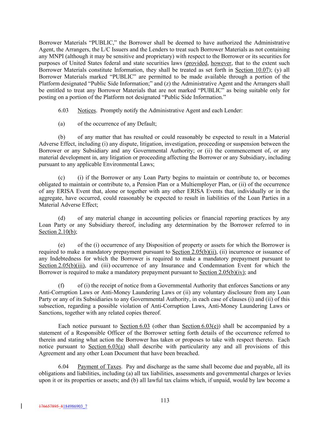 Borrower Materials “PUBLIC,” the Borrower shall be deemed to have authorized the Administrative Agent, the Arrangers, the L/C Issuers and the Lenders to treat such Borrower Materials as not containing any MNPI (although it may be sensitive and proprietary) with respect to the Borrower or its securities for purposes of United States federal and state securities laws (provided, however, that to the extent such Borrower Materials constitute Information, they shall be treated as set forth in Section 10.07); (y) all Borrower Materials marked “PUBLIC” are permitted to be made available through a portion of the Platform designated “Public Side Information;” and (z) the Administrative Agent and the Arrangers shall be entitled to treat any Borrower Materials that are not marked “PUBLIC” as being suitable only for posting on a portion of the Platform not designated “Public Side Information.” 6.03 Notices. Promptly notify the Administrative Agent and each Lender: (a) of the occurrence of any Default; (b) of any matter that has resulted or could reasonably be expected to result in a Material Adverse Effect, including (i) any dispute, litigation, investigation, proceeding or suspension between the Borrower or any Subsidiary and any Governmental Authority; or (ii) the commencement of, or any material development in, any litigation or proceeding affecting the Borrower or any Subsidiary, including pursuant to any applicable Environmental Laws; (c) (i) if the Borrower or any Loan Party begins to maintain or contribute to, or becomes obligated to maintain or contribute to, a Pension Plan or a Multiemployer Plan, or (ii) of the occurrence of any ERISA Event that, alone or together with any other ERISA Events that, individually or in the aggregate, have occurred, could reasonably be expected to result in liabilities of the Loan Parties in a Material Adverse Effect; (d) of any material change in accounting policies or financial reporting practices by any Loan Party or any Subsidiary thereof, including any determination by the Borrower referred to in Section 2.10(b); (e) of the (i) occurrence of any Disposition of property or assets for which the Borrower is required to make a mandatory prepayment pursuant to Section 2.05(b)(ii), (ii) incurrence or issuance of any Indebtedness for which the Borrower is required to make a mandatory prepayment pursuant to Section 2.05(b)(iii), and (iii) occurrence of any Insurance and Condemnation Event for which the Borrower is required to make a mandatory prepayment pursuant to Section 2.05(b)(iv); and (f) of (i) the receipt of notice from a Governmental Authority that enforces Sanctions or any Anti-Corruption Laws or Anti-Money Laundering Laws or (ii) any voluntary disclosure from any Loan Party or any of its Subsidiaries to any Governmental Authority, in each case of clauses (i) and (ii) of this subsection, regarding a possible violation of Anti-Corruption Laws, Anti-Money Laundering Laws or Sanctions, together with any related copies thereof. Each notice pursuant to Section 6.03 (other than Section 6.03(e)) shall be accompanied by a statement of a Responsible Officer of the Borrower setting forth details of the occurrence referred to therein and stating what action the Borrower has taken or proposes to take with respect thereto. Each notice pursuant to Section 6.03(a) shall describe with particularity any and all provisions of this Agreement and any other Loan Document that have been breached. 6.04 Payment of Taxes. Pay and discharge as the same shall become due and payable, all its obligations and liabilities, including (a) all tax liabilities, assessments and governmental charges or levies upon it or its properties or assets; and (b) all lawful tax claims which, if unpaid, would by law become a 113 176657895_8184986903_7