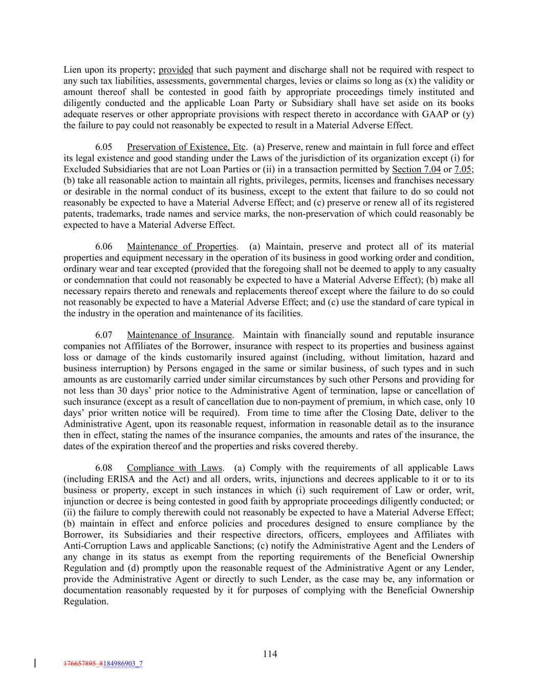 Lien upon its property; provided that such payment and discharge shall not be required with respect to any such tax liabilities, assessments, governmental charges, levies or claims so long as (x) the validity or amount thereof shall be contested in good faith by appropriate proceedings timely instituted and diligently conducted and the applicable Loan Party or Subsidiary shall have set aside on its books adequate reserves or other appropriate provisions with respect thereto in accordance with GAAP or (y) the failure to pay could not reasonably be expected to result in a Material Adverse Effect. 6.05 Preservation of Existence, Etc. (a) Preserve, renew and maintain in full force and effect its legal existence and good standing under the Laws of the jurisdiction of its organization except (i) for Excluded Subsidiaries that are not Loan Parties or (ii) in a transaction permitted by Section 7.04 or 7.05; (b) take all reasonable action to maintain all rights, privileges, permits, licenses and franchises necessary or desirable in the normal conduct of its business, except to the extent that failure to do so could not reasonably be expected to have a Material Adverse Effect; and (c) preserve or renew all of its registered patents, trademarks, trade names and service marks, the non-preservation of which could reasonably be expected to have a Material Adverse Effect. 6.06 Maintenance of Properties. (a) Maintain, preserve and protect all of its material properties and equipment necessary in the operation of its business in good working order and condition, ordinary wear and tear excepted (provided that the foregoing shall not be deemed to apply to any casualty or condemnation that could not reasonably be expected to have a Material Adverse Effect); (b) make all necessary repairs thereto and renewals and replacements thereof except where the failure to do so could not reasonably be expected to have a Material Adverse Effect; and (c) use the standard of care typical in the industry in the operation and maintenance of its facilities. 6.07 Maintenance of Insurance. Maintain with financially sound and reputable insurance companies not Affiliates of the Borrower, insurance with respect to its properties and business against loss or damage of the kinds customarily insured against (including, without limitation, hazard and business interruption) by Persons engaged in the same or similar business, of such types and in such amounts as are customarily carried under similar circumstances by such other Persons and providing for not less than 30 days’ prior notice to the Administrative Agent of termination, lapse or cancellation of such insurance (except as a result of cancellation due to non-payment of premium, in which case, only 10 days’ prior written notice will be required). From time to time after the Closing Date, deliver to the Administrative Agent, upon its reasonable request, information in reasonable detail as to the insurance then in effect, stating the names of the insurance companies, the amounts and rates of the insurance, the dates of the expiration thereof and the properties and risks covered thereby. 6.08 Compliance with Laws. (a) Comply with the requirements of all applicable Laws (including ERISA and the Act) and all orders, writs, injunctions and decrees applicable to it or to its business or property, except in such instances in which (i) such requirement of Law or order, writ, injunction or decree is being contested in good faith by appropriate proceedings diligently conducted; or (ii) the failure to comply therewith could not reasonably be expected to have a Material Adverse Effect; (b) maintain in effect and enforce policies and procedures designed to ensure compliance by the Borrower, its Subsidiaries and their respective directors, officers, employees and Affiliates with Anti-Corruption Laws and applicable Sanctions; (c) notify the Administrative Agent and the Lenders of any change in its status as exempt from the reporting requirements of the Beneficial Ownership Regulation and (d) promptly upon the reasonable request of the Administrative Agent or any Lender, provide the Administrative Agent or directly to such Lender, as the case may be, any information or documentation reasonably requested by it for purposes of complying with the Beneficial Ownership Regulation. 114 176657895_8184986903_7