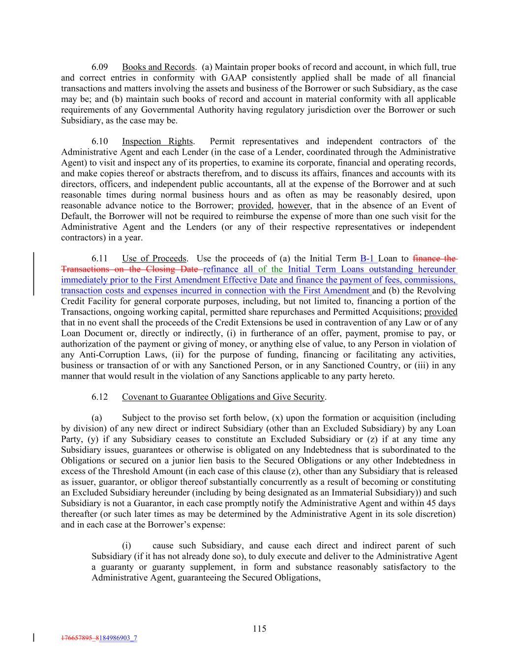 6.09 Books and Records. (a) Maintain proper books of record and account, in which full, true and correct entries in conformity with GAAP consistently applied shall be made of all financial transactions and matters involving the assets and business of the Borrower or such Subsidiary, as the case may be; and (b) maintain such books of record and account in material conformity with all applicable requirements of any Governmental Authority having regulatory jurisdiction over the Borrower or such Subsidiary, as the case may be. 6.10 Inspection Rights. Permit representatives and independent contractors of the Administrative Agent and each Lender (in the case of a Lender, coordinated through the Administrative Agent) to visit and inspect any of its properties, to examine its corporate, financial and operating records, and make copies thereof or abstracts therefrom, and to discuss its affairs, finances and accounts with its directors, officers, and independent public accountants, all at the expense of the Borrower and at such reasonable times during normal business hours and as often as may be reasonably desired, upon reasonable advance notice to the Borrower; provided, however, that in the absence of an Event of Default, the Borrower will not be required to reimburse the expense of more than one such visit for the Administrative Agent and the Lenders (or any of their respective representatives or independent contractors) in a year. 6.11 Use of Proceeds. Use the proceeds of (a) the Initial Term B-1 Loan to finance the Transactions on the Closing Date refinance all of the Initial Term Loans outstanding hereunder immediately prior to the First Amendment Effective Date and finance the payment of fees, commissions, transaction costs and expenses incurred in connection with the First Amendment and (b) the Revolving Credit Facility for general corporate purposes, including, but not limited to, financing a portion of the Transactions, ongoing working capital, permitted share repurchases and Permitted Acquisitions; provided that in no event shall the proceeds of the Credit Extensions be used in contravention of any Law or of any Loan Document or, directly or indirectly, (i) in furtherance of an offer, payment, promise to pay, or authorization of the payment or giving of money, or anything else of value, to any Person in violation of any Anti-Corruption Laws, (ii) for the purpose of funding, financing or facilitating any activities, business or transaction of or with any Sanctioned Person, or in any Sanctioned Country, or (iii) in any manner that would result in the violation of any Sanctions applicable to any party hereto. 6.12 Covenant to Guarantee Obligations and Give Security. (a) Subject to the proviso set forth below, (x) upon the formation or acquisition (including by division) of any new direct or indirect Subsidiary (other than an Excluded Subsidiary) by any Loan Party, (y) if any Subsidiary ceases to constitute an Excluded Subsidiary or (z) if at any time any Subsidiary issues, guarantees or otherwise is obligated on any Indebtedness that is subordinated to the Obligations or secured on a junior lien basis to the Secured Obligations or any other Indebtedness in excess of the Threshold Amount (in each case of this clause (z), other than any Subsidiary that is released as issuer, guarantor, or obligor thereof substantially concurrently as a result of becoming or constituting an Excluded Subsidiary hereunder (including by being designated as an Immaterial Subsidiary)) and such Subsidiary is not a Guarantor, in each case promptly notify the Administrative Agent and within 45 days thereafter (or such later times as may be determined by the Administrative Agent in its sole discretion) and in each case at the Borrower’s expense: (i) cause such Subsidiary, and cause each direct and indirect parent of such Subsidiary (if it has not already done so), to duly execute and deliver to the Administrative Agent a guaranty or guaranty supplement, in form and substance reasonably satisfactory to the Administrative Agent, guaranteeing the Secured Obligations, 115 176657895_8184986903_7