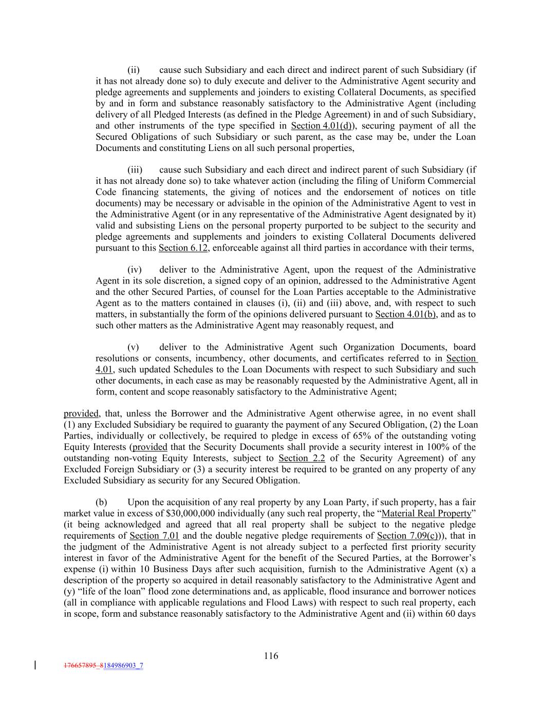 (ii) cause such Subsidiary and each direct and indirect parent of such Subsidiary (if it has not already done so) to duly execute and deliver to the Administrative Agent security and pledge agreements and supplements and joinders to existing Collateral Documents, as specified by and in form and substance reasonably satisfactory to the Administrative Agent (including delivery of all Pledged Interests (as defined in the Pledge Agreement) in and of such Subsidiary, and other instruments of the type specified in Section 4.01(d)), securing payment of all the Secured Obligations of such Subsidiary or such parent, as the case may be, under the Loan Documents and constituting Liens on all such personal properties, (iii) cause such Subsidiary and each direct and indirect parent of such Subsidiary (if it has not already done so) to take whatever action (including the filing of Uniform Commercial Code financing statements, the giving of notices and the endorsement of notices on title documents) may be necessary or advisable in the opinion of the Administrative Agent to vest in the Administrative Agent (or in any representative of the Administrative Agent designated by it) valid and subsisting Liens on the personal property purported to be subject to the security and pledge agreements and supplements and joinders to existing Collateral Documents delivered pursuant to this Section 6.12, enforceable against all third parties in accordance with their terms, (iv) deliver to the Administrative Agent, upon the request of the Administrative Agent in its sole discretion, a signed copy of an opinion, addressed to the Administrative Agent and the other Secured Parties, of counsel for the Loan Parties acceptable to the Administrative Agent as to the matters contained in clauses (i), (ii) and (iii) above, and, with respect to such matters, in substantially the form of the opinions delivered pursuant to Section 4.01(b), and as to such other matters as the Administrative Agent may reasonably request, and (v) deliver to the Administrative Agent such Organization Documents, board resolutions or consents, incumbency, other documents, and certificates referred to in Section 4.01, such updated Schedules to the Loan Documents with respect to such Subsidiary and such other documents, in each case as may be reasonably requested by the Administrative Agent, all in form, content and scope reasonably satisfactory to the Administrative Agent; provided, that, unless the Borrower and the Administrative Agent otherwise agree, in no event shall (1) any Excluded Subsidiary be required to guaranty the payment of any Secured Obligation, (2) the Loan Parties, individually or collectively, be required to pledge in excess of 65% of the outstanding voting Equity Interests (provided that the Security Documents shall provide a security interest in 100% of the outstanding non-voting Equity Interests, subject to Section 2.2 of the Security Agreement) of any Excluded Foreign Subsidiary or (3) a security interest be required to be granted on any property of any Excluded Subsidiary as security for any Secured Obligation. (b) Upon the acquisition of any real property by any Loan Party, if such property, has a fair market value in excess of $30,000,000 individually (any such real property, the “Material Real Property” (it being acknowledged and agreed that all real property shall be subject to the negative pledge requirements of Section 7.01 and the double negative pledge requirements of Section 7.09(c))), that in the judgment of the Administrative Agent is not already subject to a perfected first priority security interest in favor of the Administrative Agent for the benefit of the Secured Parties, at the Borrower’s expense (i) within 10 Business Days after such acquisition, furnish to the Administrative Agent (x) a description of the property so acquired in detail reasonably satisfactory to the Administrative Agent and (y) “life of the loan” flood zone determinations and, as applicable, flood insurance and borrower notices (all in compliance with applicable regulations and Flood Laws) with respect to such real property, each in scope, form and substance reasonably satisfactory to the Administrative Agent and (ii) within 60 days 116 176657895_8184986903_7