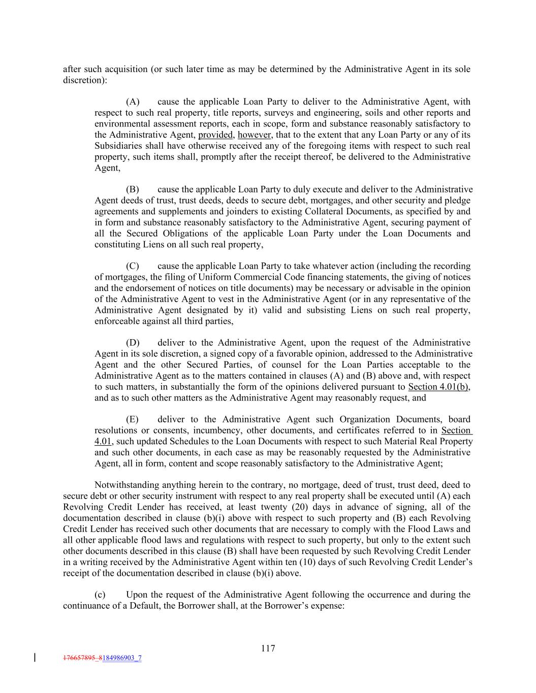 after such acquisition (or such later time as may be determined by the Administrative Agent in its sole discretion): (A) cause the applicable Loan Party to deliver to the Administrative Agent, with respect to such real property, title reports, surveys and engineering, soils and other reports and environmental assessment reports, each in scope, form and substance reasonably satisfactory to the Administrative Agent, provided, however, that to the extent that any Loan Party or any of its Subsidiaries shall have otherwise received any of the foregoing items with respect to such real property, such items shall, promptly after the receipt thereof, be delivered to the Administrative Agent, (B) cause the applicable Loan Party to duly execute and deliver to the Administrative Agent deeds of trust, trust deeds, deeds to secure debt, mortgages, and other security and pledge agreements and supplements and joinders to existing Collateral Documents, as specified by and in form and substance reasonably satisfactory to the Administrative Agent, securing payment of all the Secured Obligations of the applicable Loan Party under the Loan Documents and constituting Liens on all such real property, (C) cause the applicable Loan Party to take whatever action (including the recording of mortgages, the filing of Uniform Commercial Code financing statements, the giving of notices and the endorsement of notices on title documents) may be necessary or advisable in the opinion of the Administrative Agent to vest in the Administrative Agent (or in any representative of the Administrative Agent designated by it) valid and subsisting Liens on such real property, enforceable against all third parties, (D) deliver to the Administrative Agent, upon the request of the Administrative Agent in its sole discretion, a signed copy of a favorable opinion, addressed to the Administrative Agent and the other Secured Parties, of counsel for the Loan Parties acceptable to the Administrative Agent as to the matters contained in clauses (A) and (B) above and, with respect to such matters, in substantially the form of the opinions delivered pursuant to Section 4.01(b), and as to such other matters as the Administrative Agent may reasonably request, and (E) deliver to the Administrative Agent such Organization Documents, board resolutions or consents, incumbency, other documents, and certificates referred to in Section 4.01, such updated Schedules to the Loan Documents with respect to such Material Real Property and such other documents, in each case as may be reasonably requested by the Administrative Agent, all in form, content and scope reasonably satisfactory to the Administrative Agent; Notwithstanding anything herein to the contrary, no mortgage, deed of trust, trust deed, deed to secure debt or other security instrument with respect to any real property shall be executed until (A) each Revolving Credit Lender has received, at least twenty (20) days in advance of signing, all of the documentation described in clause (b)(i) above with respect to such property and (B) each Revolving Credit Lender has received such other documents that are necessary to comply with the Flood Laws and all other applicable flood laws and regulations with respect to such property, but only to the extent such other documents described in this clause (B) shall have been requested by such Revolving Credit Lender in a writing received by the Administrative Agent within ten (10) days of such Revolving Credit Lender’s receipt of the documentation described in clause (b)(i) above. (c) Upon the request of the Administrative Agent following the occurrence and during the continuance of a Default, the Borrower shall, at the Borrower’s expense: 117 176657895_8184986903_7