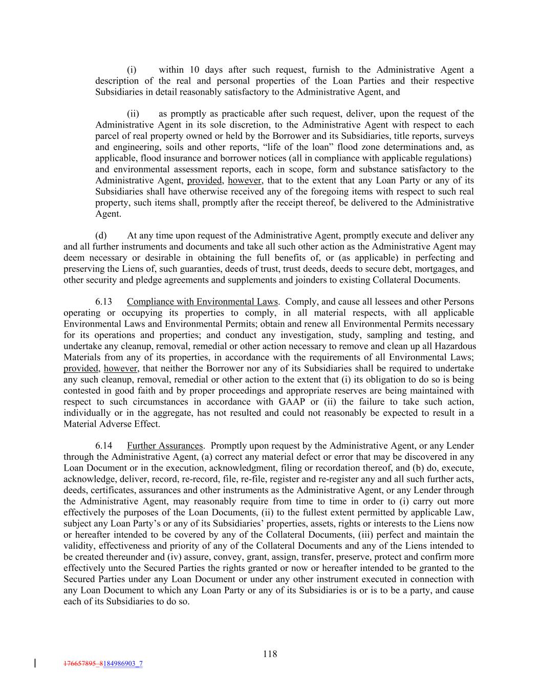 (i) within 10 days after such request, furnish to the Administrative Agent a description of the real and personal properties of the Loan Parties and their respective Subsidiaries in detail reasonably satisfactory to the Administrative Agent, and (ii) as promptly as practicable after such request, deliver, upon the request of the Administrative Agent in its sole discretion, to the Administrative Agent with respect to each parcel of real property owned or held by the Borrower and its Subsidiaries, title reports, surveys and engineering, soils and other reports, “life of the loan” flood zone determinations and, as applicable, flood insurance and borrower notices (all in compliance with applicable regulations) and environmental assessment reports, each in scope, form and substance satisfactory to the Administrative Agent, provided, however, that to the extent that any Loan Party or any of its Subsidiaries shall have otherwise received any of the foregoing items with respect to such real property, such items shall, promptly after the receipt thereof, be delivered to the Administrative Agent. (d) At any time upon request of the Administrative Agent, promptly execute and deliver any and all further instruments and documents and take all such other action as the Administrative Agent may deem necessary or desirable in obtaining the full benefits of, or (as applicable) in perfecting and preserving the Liens of, such guaranties, deeds of trust, trust deeds, deeds to secure debt, mortgages, and other security and pledge agreements and supplements and joinders to existing Collateral Documents. 6.13 Compliance with Environmental Laws. Comply, and cause all lessees and other Persons operating or occupying its properties to comply, in all material respects, with all applicable Environmental Laws and Environmental Permits; obtain and renew all Environmental Permits necessary for its operations and properties; and conduct any investigation, study, sampling and testing, and undertake any cleanup, removal, remedial or other action necessary to remove and clean up all Hazardous Materials from any of its properties, in accordance with the requirements of all Environmental Laws; provided, however, that neither the Borrower nor any of its Subsidiaries shall be required to undertake any such cleanup, removal, remedial or other action to the extent that (i) its obligation to do so is being contested in good faith and by proper proceedings and appropriate reserves are being maintained with respect to such circumstances in accordance with GAAP or (ii) the failure to take such action, individually or in the aggregate, has not resulted and could not reasonably be expected to result in a Material Adverse Effect. 6.14 Further Assurances. Promptly upon request by the Administrative Agent, or any Lender through the Administrative Agent, (a) correct any material defect or error that may be discovered in any Loan Document or in the execution, acknowledgment, filing or recordation thereof, and (b) do, execute, acknowledge, deliver, record, re-record, file, re-file, register and re-register any and all such further acts, deeds, certificates, assurances and other instruments as the Administrative Agent, or any Lender through the Administrative Agent, may reasonably require from time to time in order to (i) carry out more effectively the purposes of the Loan Documents, (ii) to the fullest extent permitted by applicable Law, subject any Loan Party’s or any of its Subsidiaries’ properties, assets, rights or interests to the Liens now or hereafter intended to be covered by any of the Collateral Documents, (iii) perfect and maintain the validity, effectiveness and priority of any of the Collateral Documents and any of the Liens intended to be created thereunder and (iv) assure, convey, grant, assign, transfer, preserve, protect and confirm more effectively unto the Secured Parties the rights granted or now or hereafter intended to be granted to the Secured Parties under any Loan Document or under any other instrument executed in connection with any Loan Document to which any Loan Party or any of its Subsidiaries is or is to be a party, and cause each of its Subsidiaries to do so. 118 176657895_8184986903_7