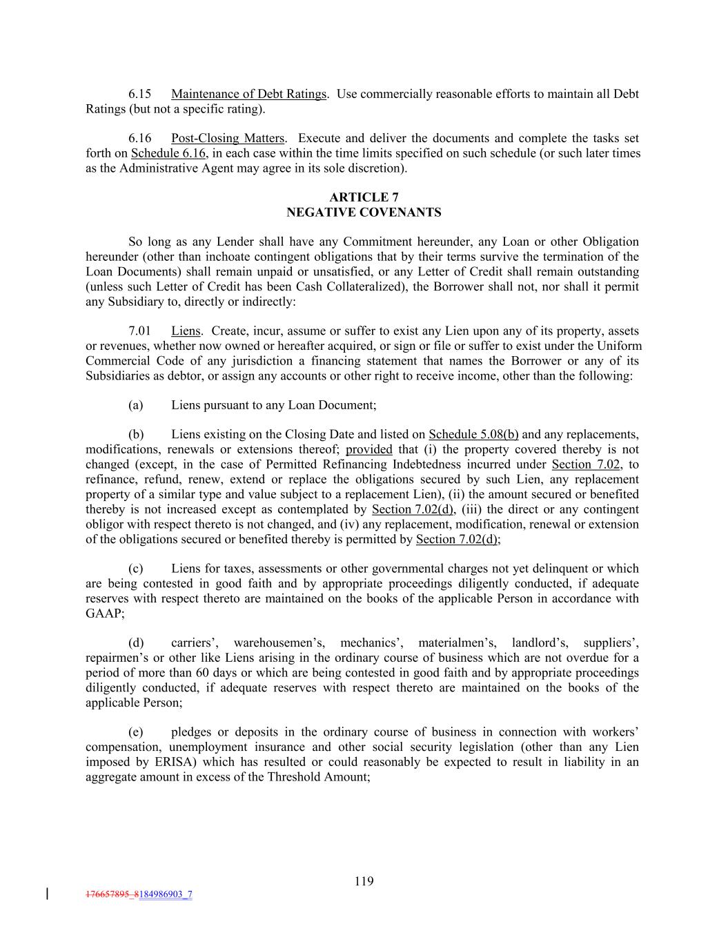 6.15 Maintenance of Debt Ratings. Use commercially reasonable efforts to maintain all Debt Ratings (but not a specific rating). 6.16 Post-Closing Matters. Execute and deliver the documents and complete the tasks set forth on Schedule 6.16, in each case within the time limits specified on such schedule (or such later times as the Administrative Agent may agree in its sole discretion). ARTICLE 7 NEGATIVE COVENANTS So long as any Lender shall have any Commitment hereunder, any Loan or other Obligation hereunder (other than inchoate contingent obligations that by their terms survive the termination of the Loan Documents) shall remain unpaid or unsatisfied, or any Letter of Credit shall remain outstanding (unless such Letter of Credit has been Cash Collateralized), the Borrower shall not, nor shall it permit any Subsidiary to, directly or indirectly: 7.01 Liens. Create, incur, assume or suffer to exist any Lien upon any of its property, assets or revenues, whether now owned or hereafter acquired, or sign or file or suffer to exist under the Uniform Commercial Code of any jurisdiction a financing statement that names the Borrower or any of its Subsidiaries as debtor, or assign any accounts or other right to receive income, other than the following: (a) Liens pursuant to any Loan Document; (b) Liens existing on the Closing Date and listed on Schedule 5.08(b) and any replacements, modifications, renewals or extensions thereof; provided that (i) the property covered thereby is not changed (except, in the case of Permitted Refinancing Indebtedness incurred under Section 7.02, to refinance, refund, renew, extend or replace the obligations secured by such Lien, any replacement property of a similar type and value subject to a replacement Lien), (ii) the amount secured or benefited thereby is not increased except as contemplated by Section 7.02(d), (iii) the direct or any contingent obligor with respect thereto is not changed, and (iv) any replacement, modification, renewal or extension of the obligations secured or benefited thereby is permitted by Section 7.02(d); (c) Liens for taxes, assessments or other governmental charges not yet delinquent or which are being contested in good faith and by appropriate proceedings diligently conducted, if adequate reserves with respect thereto are maintained on the books of the applicable Person in accordance with GAAP; (d) carriers’, warehousemen’s, mechanics’, materialmen’s, landlord’s, suppliers’, repairmen’s or other like Liens arising in the ordinary course of business which are not overdue for a period of more than 60 days or which are being contested in good faith and by appropriate proceedings diligently conducted, if adequate reserves with respect thereto are maintained on the books of the applicable Person; (e) pledges or deposits in the ordinary course of business in connection with workers’ compensation, unemployment insurance and other social security legislation (other than any Lien imposed by ERISA) which has resulted or could reasonably be expected to result in liability in an aggregate amount in excess of the Threshold Amount; 119 176657895_8184986903_7