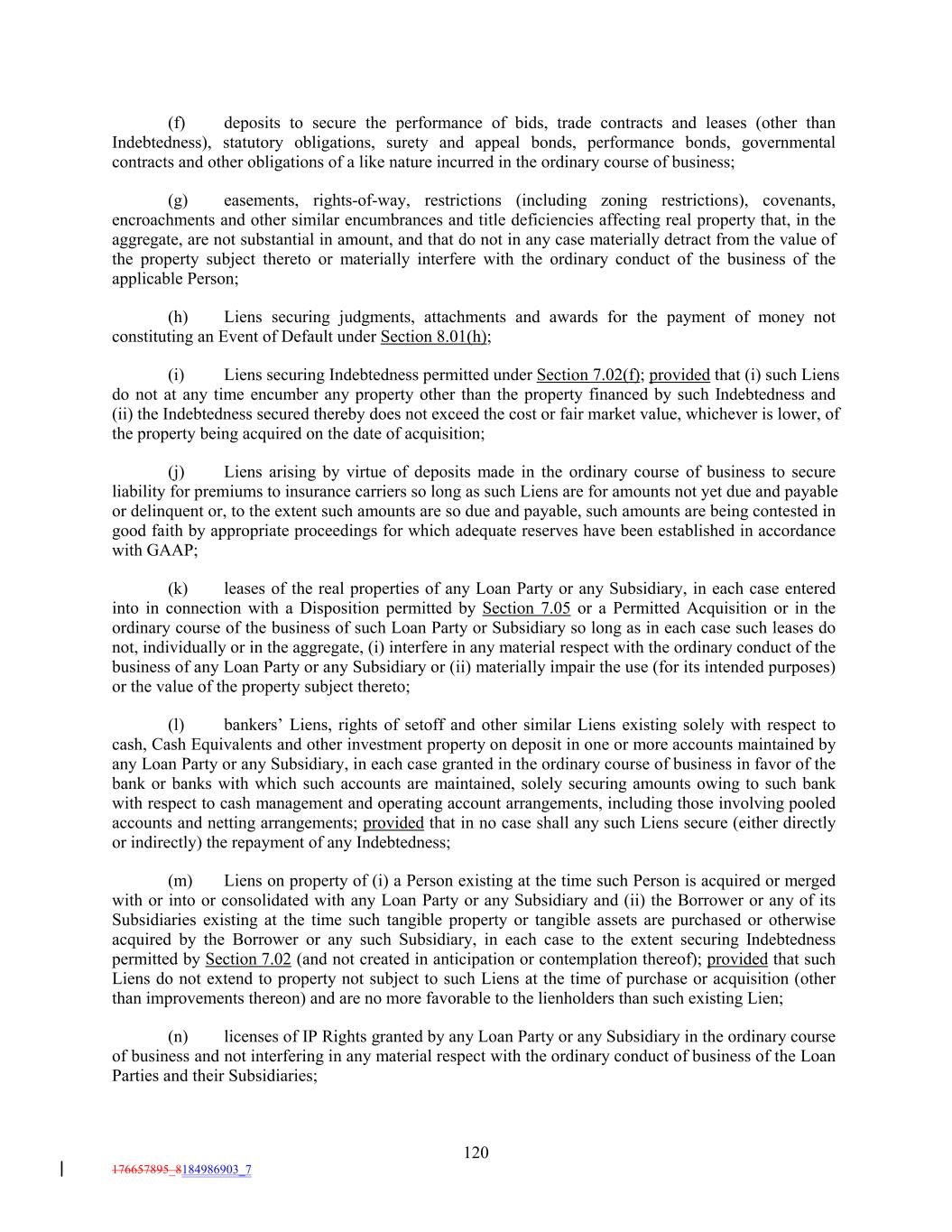 (f) deposits to secure the performance of bids, trade contracts and leases (other than Indebtedness), statutory obligations, surety and appeal bonds, performance bonds, governmental contracts and other obligations of a like nature incurred in the ordinary course of business; (g) easements, rights-of-way, restrictions (including zoning restrictions), covenants, encroachments and other similar encumbrances and title deficiencies affecting real property that, in the aggregate, are not substantial in amount, and that do not in any case materially detract from the value of the property subject thereto or materially interfere with the ordinary conduct of the business of the applicable Person; (h) Liens securing judgments, attachments and awards for the payment of money not constituting an Event of Default under Section 8.01(h); (i) Liens securing Indebtedness permitted under Section 7.02(f); provided that (i) such Liens do not at any time encumber any property other than the property financed by such Indebtedness and (ii) the Indebtedness secured thereby does not exceed the cost or fair market value, whichever is lower, of the property being acquired on the date of acquisition; (j) Liens arising by virtue of deposits made in the ordinary course of business to secure liability for premiums to insurance carriers so long as such Liens are for amounts not yet due and payable or delinquent or, to the extent such amounts are so due and payable, such amounts are being contested in good faith by appropriate proceedings for which adequate reserves have been established in accordance with GAAP; (k) leases of the real properties of any Loan Party or any Subsidiary, in each case entered into in connection with a Disposition permitted by Section 7.05 or a Permitted Acquisition or in the ordinary course of the business of such Loan Party or Subsidiary so long as in each case such leases do not, individually or in the aggregate, (i) interfere in any material respect with the ordinary conduct of the business of any Loan Party or any Subsidiary or (ii) materially impair the use (for its intended purposes) or the value of the property subject thereto; (l) bankers’ Liens, rights of setoff and other similar Liens existing solely with respect to cash, Cash Equivalents and other investment property on deposit in one or more accounts maintained by any Loan Party or any Subsidiary, in each case granted in the ordinary course of business in favor of the bank or banks with which such accounts are maintained, solely securing amounts owing to such bank with respect to cash management and operating account arrangements, including those involving pooled accounts and netting arrangements; provided that in no case shall any such Liens secure (either directly or indirectly) the repayment of any Indebtedness; (m) Liens on property of (i) a Person existing at the time such Person is acquired or merged with or into or consolidated with any Loan Party or any Subsidiary and (ii) the Borrower or any of its Subsidiaries existing at the time such tangible property or tangible assets are purchased or otherwise acquired by the Borrower or any such Subsidiary, in each case to the extent securing Indebtedness permitted by Section 7.02 (and not created in anticipation or contemplation thereof); provided that such Liens do not extend to property not subject to such Liens at the time of purchase or acquisition (other than improvements thereon) and are no more favorable to the lienholders than such existing Lien; (n) licenses of IP Rights granted by any Loan Party or any Subsidiary in the ordinary course of business and not interfering in any material respect with the ordinary conduct of business of the Loan Parties and their Subsidiaries; 120 176657895_8184986903_7