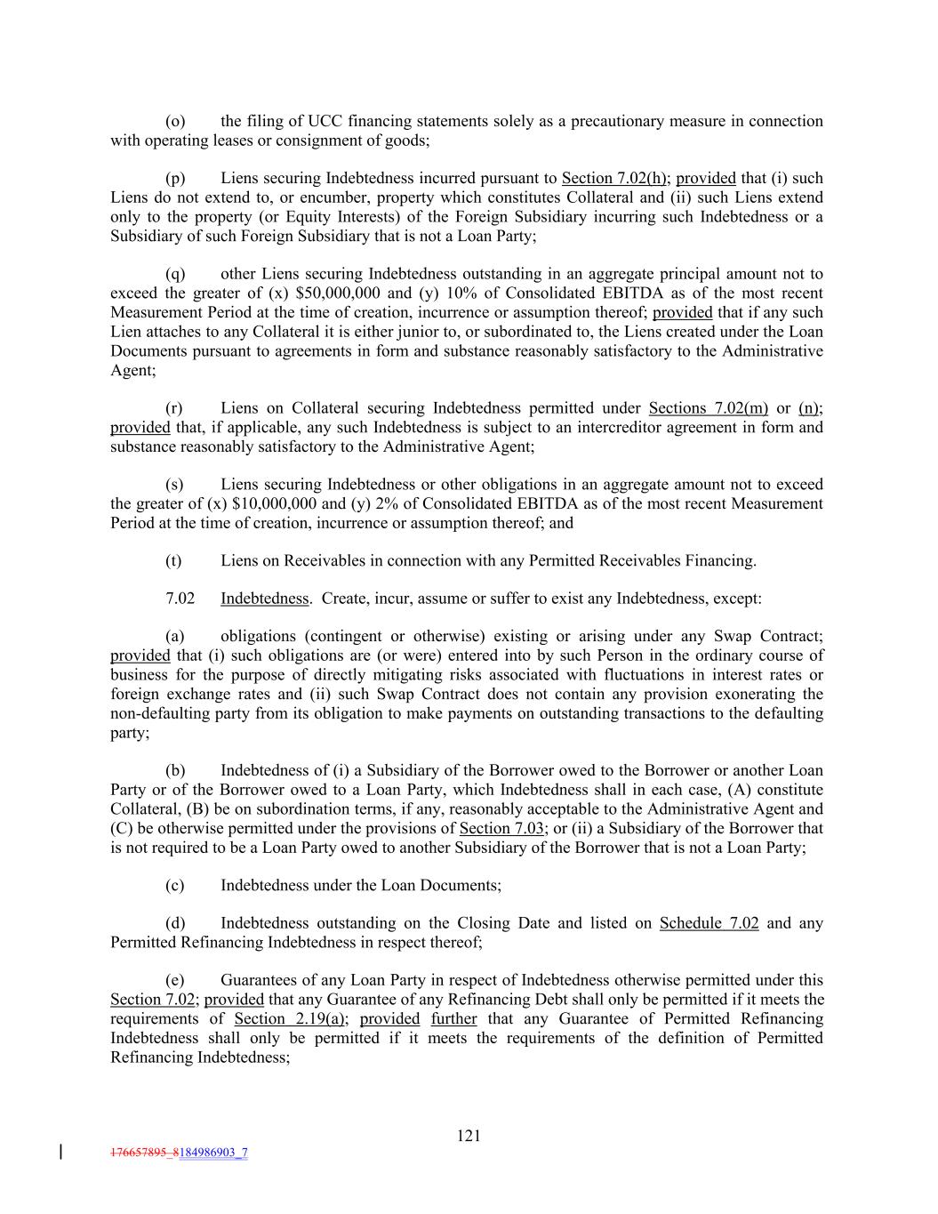(o) the filing of UCC financing statements solely as a precautionary measure in connection with operating leases or consignment of goods; (p) Liens securing Indebtedness incurred pursuant to Section 7.02(h); provided that (i) such Liens do not extend to, or encumber, property which constitutes Collateral and (ii) such Liens extend only to the property (or Equity Interests) of the Foreign Subsidiary incurring such Indebtedness or a Subsidiary of such Foreign Subsidiary that is not a Loan Party; (q) other Liens securing Indebtedness outstanding in an aggregate principal amount not to exceed the greater of (x) $50,000,000 and (y) 10% of Consolidated EBITDA as of the most recent Measurement Period at the time of creation, incurrence or assumption thereof; provided that if any such Lien attaches to any Collateral it is either junior to, or subordinated to, the Liens created under the Loan Documents pursuant to agreements in form and substance reasonably satisfactory to the Administrative Agent; (r) Liens on Collateral securing Indebtedness permitted under Sections 7.02(m) or (n); provided that, if applicable, any such Indebtedness is subject to an intercreditor agreement in form and substance reasonably satisfactory to the Administrative Agent; (s) Liens securing Indebtedness or other obligations in an aggregate amount not to exceed the greater of (x) $10,000,000 and (y) 2% of Consolidated EBITDA as of the most recent Measurement Period at the time of creation, incurrence or assumption thereof; and (t) Liens on Receivables in connection with any Permitted Receivables Financing. 7.02 Indebtedness. Create, incur, assume or suffer to exist any Indebtedness, except: (a) obligations (contingent or otherwise) existing or arising under any Swap Contract; provided that (i) such obligations are (or were) entered into by such Person in the ordinary course of business for the purpose of directly mitigating risks associated with fluctuations in interest rates or foreign exchange rates and (ii) such Swap Contract does not contain any provision exonerating the non-defaulting party from its obligation to make payments on outstanding transactions to the defaulting party; (b) Indebtedness of (i) a Subsidiary of the Borrower owed to the Borrower or another Loan Party or of the Borrower owed to a Loan Party, which Indebtedness shall in each case, (A) constitute Collateral, (B) be on subordination terms, if any, reasonably acceptable to the Administrative Agent and (C) be otherwise permitted under the provisions of Section 7.03; or (ii) a Subsidiary of the Borrower that is not required to be a Loan Party owed to another Subsidiary of the Borrower that is not a Loan Party; (c) Indebtedness under the Loan Documents; (d) Indebtedness outstanding on the Closing Date and listed on Schedule 7.02 and any Permitted Refinancing Indebtedness in respect thereof; (e) Guarantees of any Loan Party in respect of Indebtedness otherwise permitted under this Section 7.02; provided that any Guarantee of any Refinancing Debt shall only be permitted if it meets the requirements of Section 2.19(a); provided further that any Guarantee of Permitted Refinancing Indebtedness shall only be permitted if it meets the requirements of the definition of Permitted Refinancing Indebtedness; 121 176657895_8184986903_7