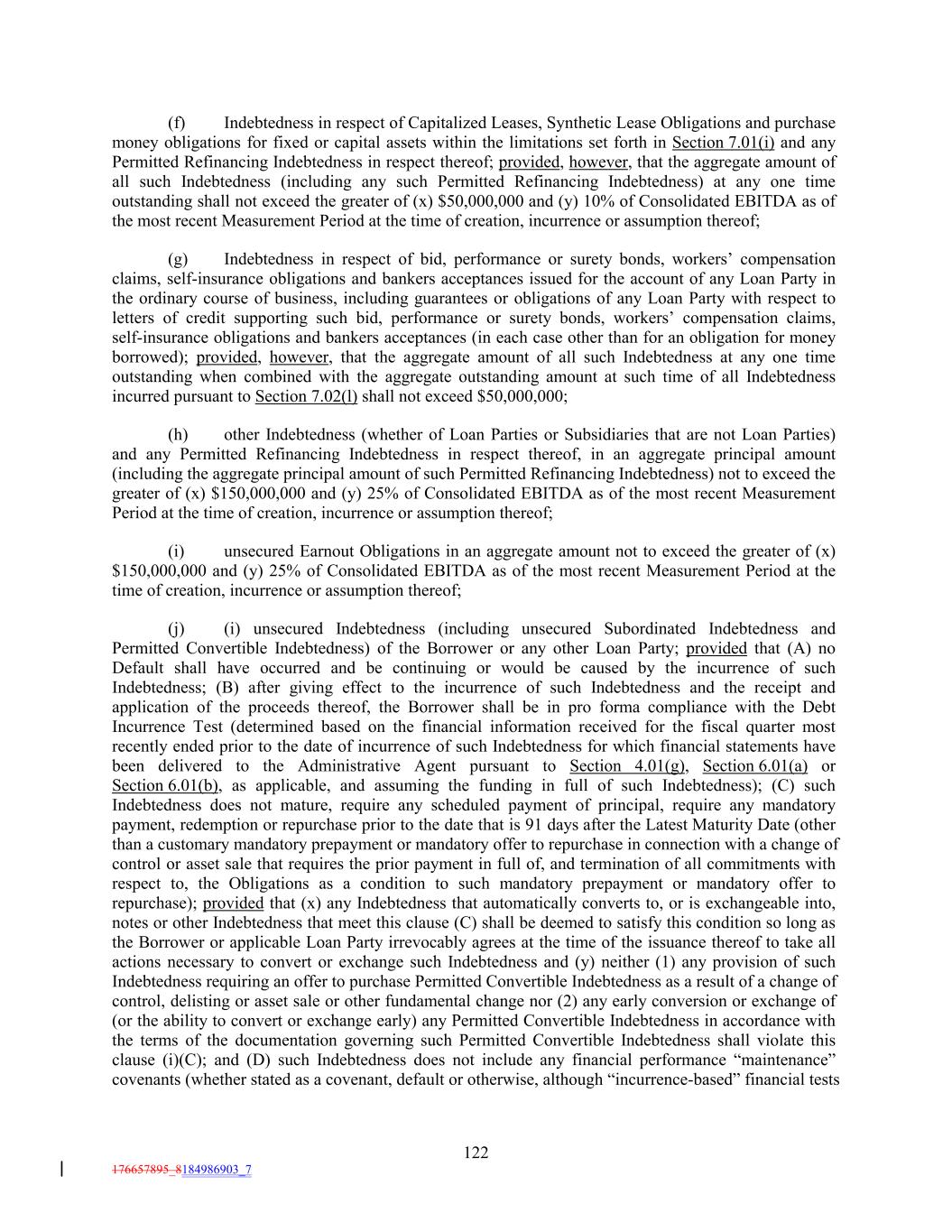 (f) Indebtedness in respect of Capitalized Leases, Synthetic Lease Obligations and purchase money obligations for fixed or capital assets within the limitations set forth in Section 7.01(i) and any Permitted Refinancing Indebtedness in respect thereof; provided, however, that the aggregate amount of all such Indebtedness (including any such Permitted Refinancing Indebtedness) at any one time outstanding shall not exceed the greater of (x) $50,000,000 and (y) 10% of Consolidated EBITDA as of the most recent Measurement Period at the time of creation, incurrence or assumption thereof; (g) Indebtedness in respect of bid, performance or surety bonds, workers’ compensation claims, self-insurance obligations and bankers acceptances issued for the account of any Loan Party in the ordinary course of business, including guarantees or obligations of any Loan Party with respect to letters of credit supporting such bid, performance or surety bonds, workers’ compensation claims, self-insurance obligations and bankers acceptances (in each case other than for an obligation for money borrowed); provided, however, that the aggregate amount of all such Indebtedness at any one time outstanding when combined with the aggregate outstanding amount at such time of all Indebtedness incurred pursuant to Section 7.02(l) shall not exceed $50,000,000; (h) other Indebtedness (whether of Loan Parties or Subsidiaries that are not Loan Parties) and any Permitted Refinancing Indebtedness in respect thereof, in an aggregate principal amount (including the aggregate principal amount of such Permitted Refinancing Indebtedness) not to exceed the greater of (x) $150,000,000 and (y) 25% of Consolidated EBITDA as of the most recent Measurement Period at the time of creation, incurrence or assumption thereof; (i) unsecured Earnout Obligations in an aggregate amount not to exceed the greater of (x) $150,000,000 and (y) 25% of Consolidated EBITDA as of the most recent Measurement Period at the time of creation, incurrence or assumption thereof; (j) (i) unsecured Indebtedness (including unsecured Subordinated Indebtedness and Permitted Convertible Indebtedness) of the Borrower or any other Loan Party; provided that (A) no Default shall have occurred and be continuing or would be caused by the incurrence of such Indebtedness; (B) after giving effect to the incurrence of such Indebtedness and the receipt and application of the proceeds thereof, the Borrower shall be in pro forma compliance with the Debt Incurrence Test (determined based on the financial information received for the fiscal quarter most recently ended prior to the date of incurrence of such Indebtedness for which financial statements have been delivered to the Administrative Agent pursuant to Section 4.01(g), Section 6.01(a) or Section 6.01(b), as applicable, and assuming the funding in full of such Indebtedness); (C) such Indebtedness does not mature, require any scheduled payment of principal, require any mandatory payment, redemption or repurchase prior to the date that is 91 days after the Latest Maturity Date (other than a customary mandatory prepayment or mandatory offer to repurchase in connection with a change of control or asset sale that requires the prior payment in full of, and termination of all commitments with respect to, the Obligations as a condition to such mandatory prepayment or mandatory offer to repurchase); provided that (x) any Indebtedness that automatically converts to, or is exchangeable into, notes or other Indebtedness that meet this clause (C) shall be deemed to satisfy this condition so long as the Borrower or applicable Loan Party irrevocably agrees at the time of the issuance thereof to take all actions necessary to convert or exchange such Indebtedness and (y) neither (1) any provision of such Indebtedness requiring an offer to purchase Permitted Convertible Indebtedness as a result of a change of control, delisting or asset sale or other fundamental change nor (2) any early conversion or exchange of (or the ability to convert or exchange early) any Permitted Convertible Indebtedness in accordance with the terms of the documentation governing such Permitted Convertible Indebtedness shall violate this clause (i)(C); and (D) such Indebtedness does not include any financial performance “maintenance” covenants (whether stated as a covenant, default or otherwise, although “incurrence-based” financial tests 122 176657895_8184986903_7