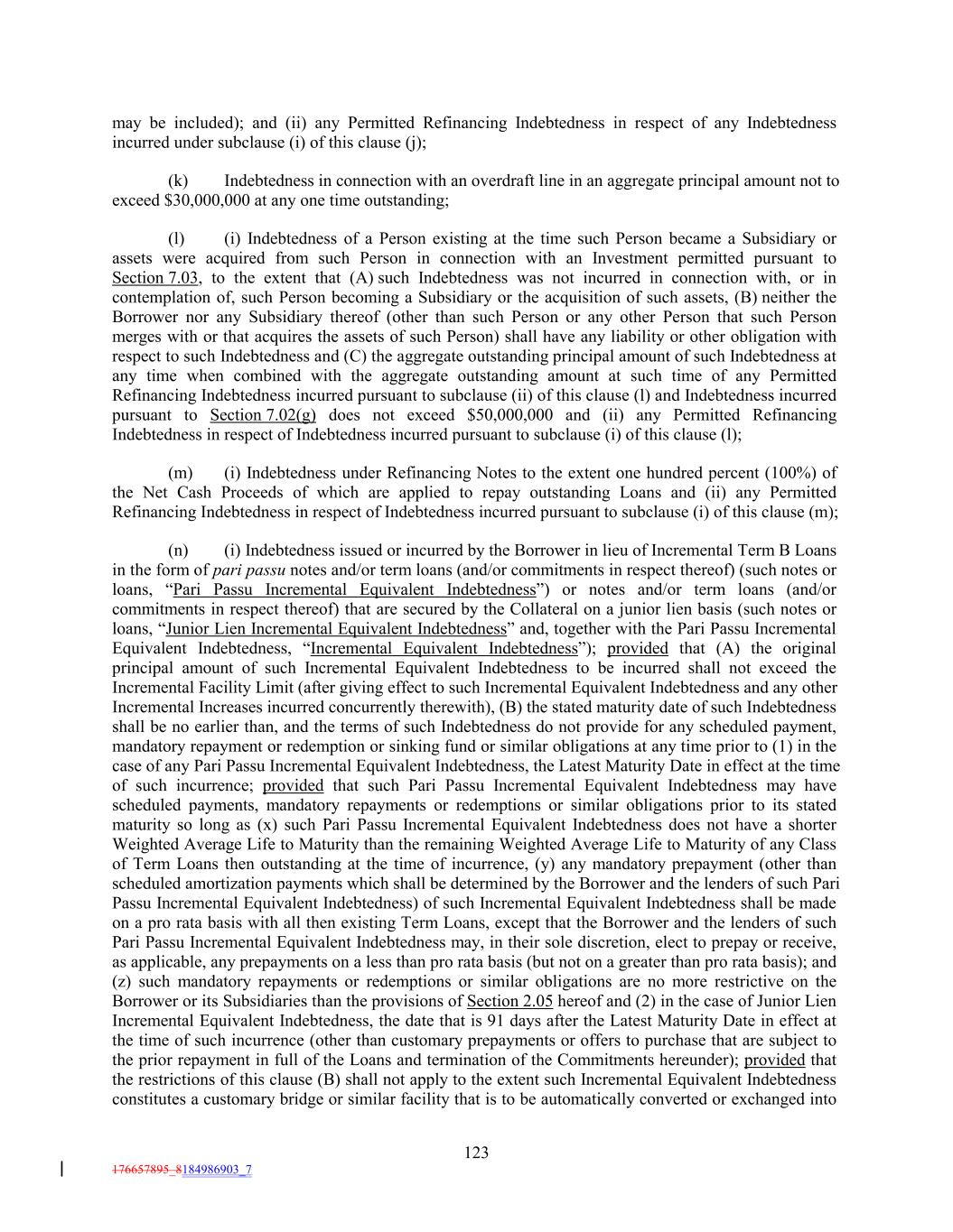 may be included); and (ii) any Permitted Refinancing Indebtedness in respect of any Indebtedness incurred under subclause (i) of this clause (j); (k) Indebtedness in connection with an overdraft line in an aggregate principal amount not to exceed $30,000,000 at any one time outstanding; (l) (i) Indebtedness of a Person existing at the time such Person became a Subsidiary or assets were acquired from such Person in connection with an Investment permitted pursuant to Section 7.03, to the extent that (A) such Indebtedness was not incurred in connection with, or in contemplation of, such Person becoming a Subsidiary or the acquisition of such assets, (B) neither the Borrower nor any Subsidiary thereof (other than such Person or any other Person that such Person merges with or that acquires the assets of such Person) shall have any liability or other obligation with respect to such Indebtedness and (C) the aggregate outstanding principal amount of such Indebtedness at any time when combined with the aggregate outstanding amount at such time of any Permitted Refinancing Indebtedness incurred pursuant to subclause (ii) of this clause (l) and Indebtedness incurred pursuant to Section 7.02(g) does not exceed $50,000,000 and (ii) any Permitted Refinancing Indebtedness in respect of Indebtedness incurred pursuant to subclause (i) of this clause (l); (m) (i) Indebtedness under Refinancing Notes to the extent one hundred percent (100%) of the Net Cash Proceeds of which are applied to repay outstanding Loans and (ii) any Permitted Refinancing Indebtedness in respect of Indebtedness incurred pursuant to subclause (i) of this clause (m); (n) (i) Indebtedness issued or incurred by the Borrower in lieu of Incremental Term B Loans in the form of pari passu notes and/or term loans (and/or commitments in respect thereof) (such notes or loans, “Pari Passu Incremental Equivalent Indebtedness”) or notes and/or term loans (and/or commitments in respect thereof) that are secured by the Collateral on a junior lien basis (such notes or loans, “Junior Lien Incremental Equivalent Indebtedness” and, together with the Pari Passu Incremental Equivalent Indebtedness, “Incremental Equivalent Indebtedness”); provided that (A) the original principal amount of such Incremental Equivalent Indebtedness to be incurred shall not exceed the Incremental Facility Limit (after giving effect to such Incremental Equivalent Indebtedness and any other Incremental Increases incurred concurrently therewith), (B) the stated maturity date of such Indebtedness shall be no earlier than, and the terms of such Indebtedness do not provide for any scheduled payment, mandatory repayment or redemption or sinking fund or similar obligations at any time prior to (1) in the case of any Pari Passu Incremental Equivalent Indebtedness, the Latest Maturity Date in effect at the time of such incurrence; provided that such Pari Passu Incremental Equivalent Indebtedness may have scheduled payments, mandatory repayments or redemptions or similar obligations prior to its stated maturity so long as (x) such Pari Passu Incremental Equivalent Indebtedness does not have a shorter Weighted Average Life to Maturity than the remaining Weighted Average Life to Maturity of any Class of Term Loans then outstanding at the time of incurrence, (y) any mandatory prepayment (other than scheduled amortization payments which shall be determined by the Borrower and the lenders of such Pari Passu Incremental Equivalent Indebtedness) of such Incremental Equivalent Indebtedness shall be made on a pro rata basis with all then existing Term Loans, except that the Borrower and the lenders of such Pari Passu Incremental Equivalent Indebtedness may, in their sole discretion, elect to prepay or receive, as applicable, any prepayments on a less than pro rata basis (but not on a greater than pro rata basis); and (z) such mandatory repayments or redemptions or similar obligations are no more restrictive on the Borrower or its Subsidiaries than the provisions of Section 2.05 hereof and (2) in the case of Junior Lien Incremental Equivalent Indebtedness, the date that is 91 days after the Latest Maturity Date in effect at the time of such incurrence (other than customary prepayments or offers to purchase that are subject to the prior repayment in full of the Loans and termination of the Commitments hereunder); provided that the restrictions of this clause (B) shall not apply to the extent such Incremental Equivalent Indebtedness constitutes a customary bridge or similar facility that is to be automatically converted or exchanged into 123 176657895_8184986903_7