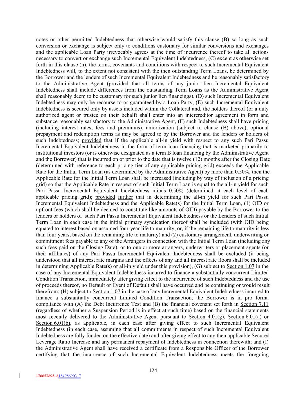 notes or other permitted Indebtedness that otherwise would satisfy this clause (B) so long as such conversion or exchange is subject only to conditions customary for similar conversions and exchanges and the applicable Loan Party irrevocably agrees at the time of incurrence thereof to take all actions necessary to convert or exchange such Incremental Equivalent Indebtedness, (C) except as otherwise set forth in this clause (n), the terms, covenants and conditions with respect to such Incremental Equivalent Indebtedness will, to the extent not consistent with the then outstanding Term Loans, be determined by the Borrower and the lenders of such Incremental Equivalent Indebtedness and be reasonably satisfactory to the Administrative Agent (provided that all terms of any junior lien Incremental Equivalent Indebtedness shall include differences from the outstanding Term Loans as the Administrative Agent shall reasonably deem to be customary for such junior lien financings), (D) such Incremental Equivalent Indebtedness may only be recourse to or guaranteed by a Loan Party, (E) such Incremental Equivalent Indebtedness is secured only by assets included within the Collateral and, the holders thereof (or a duly authorized agent or trustee on their behalf) shall enter into an intercreditor agreement in form and substance reasonably satisfactory to the Administrative Agent, (F) such Indebtedness shall have pricing (including interest rates, fees and premiums), amortization (subject to clause (B) above), optional prepayment and redemption terms as may be agreed to by the Borrower and the lenders or holders of such Indebtedness; provided that if the applicable all-in yield with respect to any such Pari Passu Incremental Equivalent Indebtedness in the form of term loan financing that is marketed primarily to institutional investors (or is otherwise designated as a term B loan financing by the Administrative Agent and the Borrower) that is incurred on or prior to the date that is twelve (12) months after the Closing Date (determined with reference to each pricing tier of any applicable pricing grid) exceeds the Applicable Rate for the Initial Term Loan (as determined by the Administrative Agent) by more than 0.50%, then the Applicable Rate for the Initial Term Loan shall be increased (including by way of inclusion of a pricing grid) so that the Applicable Rate in respect of such Initial Term Loan is equal to the all-in yield for such Pari Passu Incremental Equivalent Indebtedness minus 0.50% (determined at each level of each applicable pricing grid); provided further that in determining the all-in yield for such Pari Passu Incremental Equivalent Indebtedness and the Applicable Rate(s) for the Initial Term Loan, (1) OID or upfront fees (which shall be deemed to constitute like amounts of OID) payable by the Borrower to the lenders or holders of such Pari Passu Incremental Equivalent Indebtedness or the Lenders of such Initial Term Loan in each case in the initial primary syndication thereof shall be included (with OID being equated to interest based on assumed four-year life to maturity, or, if the remaining life to maturity is less than four years, based on the remaining life to maturity) and (2) customary arrangement, underwriting or commitment fees payable to any of the Arrangers in connection with the Initial Term Loan (including any such fees paid on the Closing Date), or to one or more arrangers, underwriters or placement agents (or their affiliates) of any Pari Passu Incremental Equivalent Indebtedness shall be excluded (it being understood that all interest rate margins and the effects of any and all interest rate floors shall be included in determining Applicable Rate(s) or all-in yield under this provision), (G) subject to Section 1.07 in the case of any Incremental Equivalent Indebtedness incurred to finance a substantially concurrent Limited Condition Transaction, immediately after giving effect to the incurrence of such Indebtedness and the use of proceeds thereof, no Default or Event of Default shall have occurred and be continuing or would result therefrom; (H) subject to Section 1.07 in the case of any Incremental Equivalent Indebtedness incurred to finance a substantially concurrent Limited Condition Transaction, the Borrower is in pro forma compliance with (A) the Debt Incurrence Test and (B) the financial covenant set forth in Section 7.11 (regardless of whether a Suspension Period is in effect at such time) based on the financial statements most recently delivered to the Administrative Agent pursuant to Section 4.01(g), Section 6.01(a) or Section 6.01(b), as applicable, in each case after giving effect to such Incremental Equivalent Indebtedness (in each case, assuming that all commitments in respect of such Incremental Equivalent Indebtedness are fully funded on the effective date) and after giving effect to any then applicable Secured Leverage Ratio Increase and any permanent repayment of Indebtedness in connection therewith; and (I) the Administrative Agent shall have received a certificate from a Responsible Officer of the Borrower certifying that the incurrence of such Incremental Equivalent Indebtedness meets the foregoing 124 176657895_8184986903_7