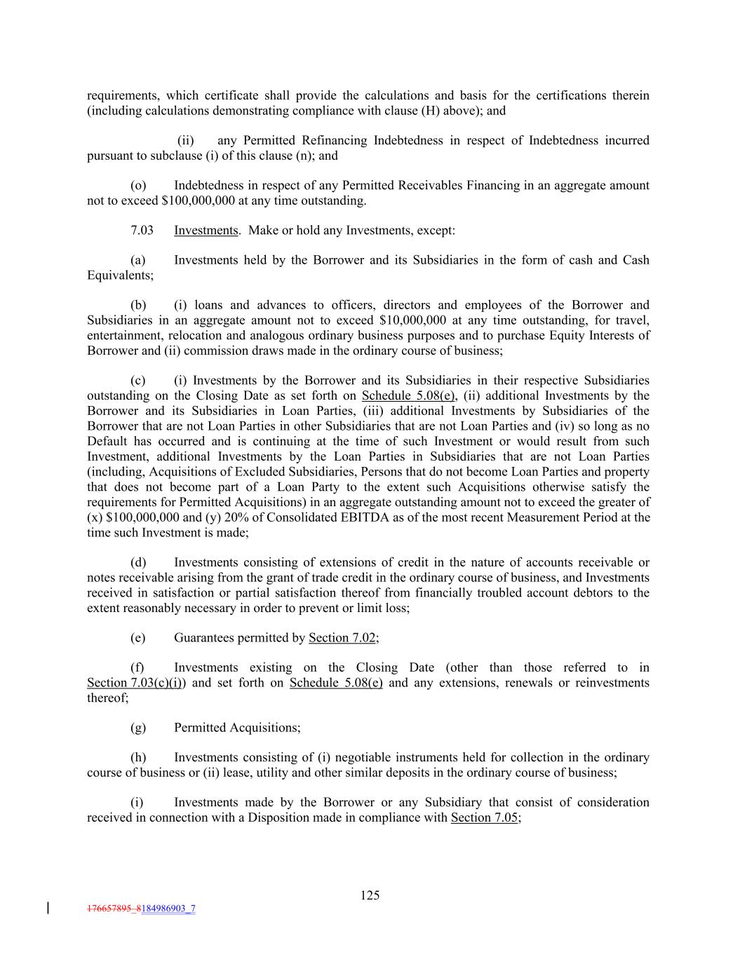 requirements, which certificate shall provide the calculations and basis for the certifications therein (including calculations demonstrating compliance with clause (H) above); and (ii) any Permitted Refinancing Indebtedness in respect of Indebtedness incurred pursuant to subclause (i) of this clause (n); and (o) Indebtedness in respect of any Permitted Receivables Financing in an aggregate amount not to exceed $100,000,000 at any time outstanding. 7.03 Investments. Make or hold any Investments, except: (a) Investments held by the Borrower and its Subsidiaries in the form of cash and Cash Equivalents; (b) (i) loans and advances to officers, directors and employees of the Borrower and Subsidiaries in an aggregate amount not to exceed $10,000,000 at any time outstanding, for travel, entertainment, relocation and analogous ordinary business purposes and to purchase Equity Interests of Borrower and (ii) commission draws made in the ordinary course of business; (c) (i) Investments by the Borrower and its Subsidiaries in their respective Subsidiaries outstanding on the Closing Date as set forth on Schedule 5.08(e), (ii) additional Investments by the Borrower and its Subsidiaries in Loan Parties, (iii) additional Investments by Subsidiaries of the Borrower that are not Loan Parties in other Subsidiaries that are not Loan Parties and (iv) so long as no Default has occurred and is continuing at the time of such Investment or would result from such Investment, additional Investments by the Loan Parties in Subsidiaries that are not Loan Parties (including, Acquisitions of Excluded Subsidiaries, Persons that do not become Loan Parties and property that does not become part of a Loan Party to the extent such Acquisitions otherwise satisfy the requirements for Permitted Acquisitions) in an aggregate outstanding amount not to exceed the greater of (x) $100,000,000 and (y) 20% of Consolidated EBITDA as of the most recent Measurement Period at the time such Investment is made; (d) Investments consisting of extensions of credit in the nature of accounts receivable or notes receivable arising from the grant of trade credit in the ordinary course of business, and Investments received in satisfaction or partial satisfaction thereof from financially troubled account debtors to the extent reasonably necessary in order to prevent or limit loss; (e) Guarantees permitted by Section 7.02; (f) Investments existing on the Closing Date (other than those referred to in Section 7.03(c)(i)) and set forth on Schedule 5.08(e) and any extensions, renewals or reinvestments thereof; (g) Permitted Acquisitions; (h) Investments consisting of (i) negotiable instruments held for collection in the ordinary course of business or (ii) lease, utility and other similar deposits in the ordinary course of business; (i) Investments made by the Borrower or any Subsidiary that consist of consideration received in connection with a Disposition made in compliance with Section 7.05; 125 176657895_8184986903_7