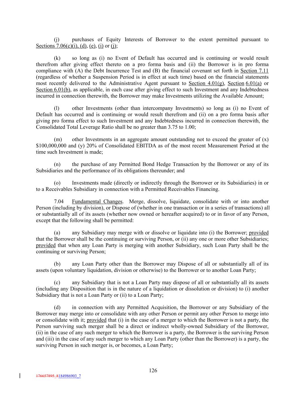(j) purchases of Equity Interests of Borrower to the extent permitted pursuant to Sections 7.06(c)(i), (d), (e), (i) or (j); (k) so long as (i) no Event of Default has occurred and is continuing or would result therefrom after giving effect thereto on a pro forma basis and (ii) the Borrower is in pro forma compliance with (A) the Debt Incurrence Test and (B) the financial covenant set forth in Section 7.11 (regardless of whether a Suspension Period is in effect at such time) based on the financial statements most recently delivered to the Administrative Agent pursuant to Section 4.01(g), Section 6.01(a) or Section 6.01(b), as applicable, in each case after giving effect to such Investment and any Indebtedness incurred in connection therewith, the Borrower may make Investments utilizing the Available Amount; (l) other Investments (other than intercompany Investments) so long as (i) no Event of Default has occurred and is continuing or would result therefrom and (ii) on a pro forma basis after giving pro forma effect to such Investment and any Indebtedness incurred in connection therewith, the Consolidated Total Leverage Ratio shall be no greater than 3.75 to 1.00; (m) other Investments in an aggregate amount outstanding not to exceed the greater of (x) $100,000,000 and (y) 20% of Consolidated EBITDA as of the most recent Measurement Period at the time such Investment is made; (n) the purchase of any Permitted Bond Hedge Transaction by the Borrower or any of its Subsidiaries and the performance of its obligations thereunder; and (o) Investments made (directly or indirectly through the Borrower or its Subsidiaries) in or to a Receivables Subsidiary in connection with a Permitted Receivables Financing. 7.04 Fundamental Changes. Merge, dissolve, liquidate, consolidate with or into another Person (including by division), or Dispose of (whether in one transaction or in a series of transactions) all or substantially all of its assets (whether now owned or hereafter acquired) to or in favor of any Person, except that the following shall be permitted: (a) any Subsidiary may merge with or dissolve or liquidate into (i) the Borrower; provided that the Borrower shall be the continuing or surviving Person, or (ii) any one or more other Subsidiaries; provided that when any Loan Party is merging with another Subsidiary, such Loan Party shall be the continuing or surviving Person; (b) any Loan Party other than the Borrower may Dispose of all or substantially all of its assets (upon voluntary liquidation, division or otherwise) to the Borrower or to another Loan Party; (c) any Subsidiary that is not a Loan Party may dispose of all or substantially all its assets (including any Disposition that is in the nature of a liquidation or dissolution or division) to (i) another Subsidiary that is not a Loan Party or (ii) to a Loan Party; (d) in connection with any Permitted Acquisition, the Borrower or any Subsidiary of the Borrower may merge into or consolidate with any other Person or permit any other Person to merge into or consolidate with it; provided that (i) in the case of a merger to which the Borrower is not a party, the Person surviving such merger shall be a direct or indirect wholly-owned Subsidiary of the Borrower, (ii) in the case of any such merger to which the Borrower is a party, the Borrower is the surviving Person and (iii) in the case of any such merger to which any Loan Party (other than the Borrower) is a party, the surviving Person in such merger is, or becomes, a Loan Party; 126 176657895_8184986903_7