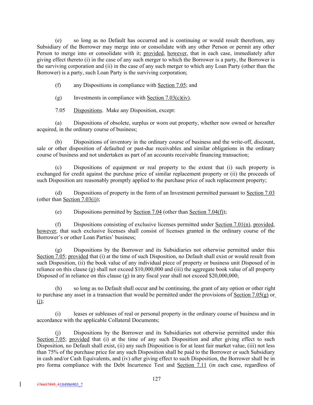 (e) so long as no Default has occurred and is continuing or would result therefrom, any Subsidiary of the Borrower may merge into or consolidate with any other Person or permit any other Person to merge into or consolidate with it; provided, however, that in each case, immediately after giving effect thereto (i) in the case of any such merger to which the Borrower is a party, the Borrower is the surviving corporation and (ii) in the case of any such merger to which any Loan Party (other than the Borrower) is a party, such Loan Party is the surviving corporation; (f) any Dispositions in compliance with Section 7.05; and (g) Investments in compliance with Section 7.03(c)(iv). 7.05 Dispositions. Make any Disposition, except: (a) Dispositions of obsolete, surplus or worn out property, whether now owned or hereafter acquired, in the ordinary course of business; (b) Dispositions of inventory in the ordinary course of business and the write-off, discount, sale or other disposition of defaulted or past-due receivables and similar obligations in the ordinary course of business and not undertaken as part of an accounts receivable financing transaction; (c) Dispositions of equipment or real property to the extent that (i) such property is exchanged for credit against the purchase price of similar replacement property or (ii) the proceeds of such Disposition are reasonably promptly applied to the purchase price of such replacement property; (d) Dispositions of property in the form of an Investment permitted pursuant to Section 7.03 (other than Section 7.03(i)); (e) Dispositions permitted by Section 7.04 (other than Section 7.04(f)); (f) Dispositions consisting of exclusive licenses permitted under Section 7.01(n), provided, however, that such exclusive licenses shall consist of licenses granted in the ordinary course of the Borrower’s or other Loan Parties’ business; (g) Dispositions by the Borrower and its Subsidiaries not otherwise permitted under this Section 7.05; provided that (i) at the time of such Disposition, no Default shall exist or would result from such Disposition, (ii) the book value of any individual piece of property or business unit Disposed of in reliance on this clause (g) shall not exceed $10,000,000 and (iii) the aggregate book value of all property Disposed of in reliance on this clause (g) in any fiscal year shall not exceed $20,000,000; (h) so long as no Default shall occur and be continuing, the grant of any option or other right to purchase any asset in a transaction that would be permitted under the provisions of Section 7.05(g) or (j); (i) leases or subleases of real or personal property in the ordinary course of business and in accordance with the applicable Collateral Documents; (j) Dispositions by the Borrower and its Subsidiaries not otherwise permitted under this Section 7.05; provided that (i) at the time of any such Disposition and after giving effect to such Disposition, no Default shall exist, (ii) any such Disposition is for at least fair market value, (iii) not less than 75% of the purchase price for any such Disposition shall be paid to the Borrower or such Subsidiary in cash and/or Cash Equivalents, and (iv) after giving effect to such Disposition, the Borrower shall be in pro forma compliance with the Debt Incurrence Test and Section 7.11 (in each case, regardless of 127 176657895_8184986903_7