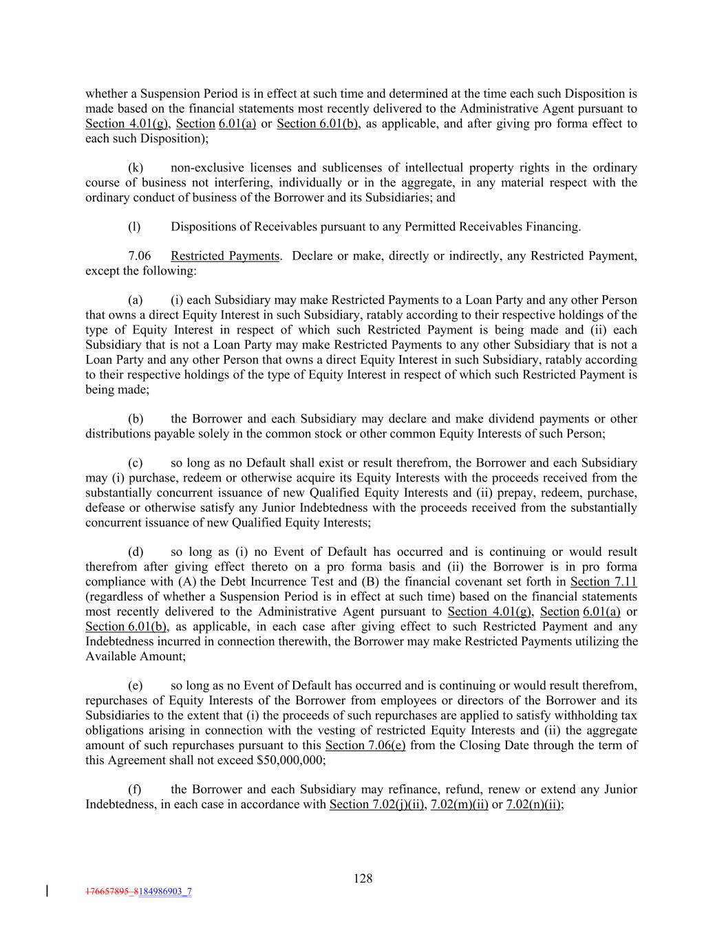 whether a Suspension Period is in effect at such time and determined at the time each such Disposition is made based on the financial statements most recently delivered to the Administrative Agent pursuant to Section 4.01(g), Section 6.01(a) or Section 6.01(b), as applicable, and after giving pro forma effect to each such Disposition); (k) non-exclusive licenses and sublicenses of intellectual property rights in the ordinary course of business not interfering, individually or in the aggregate, in any material respect with the ordinary conduct of business of the Borrower and its Subsidiaries; and (l) Dispositions of Receivables pursuant to any Permitted Receivables Financing. 7.06 Restricted Payments. Declare or make, directly or indirectly, any Restricted Payment, except the following: (a) (i) each Subsidiary may make Restricted Payments to a Loan Party and any other Person that owns a direct Equity Interest in such Subsidiary, ratably according to their respective holdings of the type of Equity Interest in respect of which such Restricted Payment is being made and (ii) each Subsidiary that is not a Loan Party may make Restricted Payments to any other Subsidiary that is not a Loan Party and any other Person that owns a direct Equity Interest in such Subsidiary, ratably according to their respective holdings of the type of Equity Interest in respect of which such Restricted Payment is being made; (b) the Borrower and each Subsidiary may declare and make dividend payments or other distributions payable solely in the common stock or other common Equity Interests of such Person; (c) so long as no Default shall exist or result therefrom, the Borrower and each Subsidiary may (i) purchase, redeem or otherwise acquire its Equity Interests with the proceeds received from the substantially concurrent issuance of new Qualified Equity Interests and (ii) prepay, redeem, purchase, defease or otherwise satisfy any Junior Indebtedness with the proceeds received from the substantially concurrent issuance of new Qualified Equity Interests; (d) so long as (i) no Event of Default has occurred and is continuing or would result therefrom after giving effect thereto on a pro forma basis and (ii) the Borrower is in pro forma compliance with (A) the Debt Incurrence Test and (B) the financial covenant set forth in Section 7.11 (regardless of whether a Suspension Period is in effect at such time) based on the financial statements most recently delivered to the Administrative Agent pursuant to Section 4.01(g), Section 6.01(a) or Section 6.01(b), as applicable, in each case after giving effect to such Restricted Payment and any Indebtedness incurred in connection therewith, the Borrower may make Restricted Payments utilizing the Available Amount; (e) so long as no Event of Default has occurred and is continuing or would result therefrom, repurchases of Equity Interests of the Borrower from employees or directors of the Borrower and its Subsidiaries to the extent that (i) the proceeds of such repurchases are applied to satisfy withholding tax obligations arising in connection with the vesting of restricted Equity Interests and (ii) the aggregate amount of such repurchases pursuant to this Section 7.06(e) from the Closing Date through the term of this Agreement shall not exceed $50,000,000; (f) the Borrower and each Subsidiary may refinance, refund, renew or extend any Junior Indebtedness, in each case in accordance with Section 7.02(j)(ii), 7.02(m)(ii) or 7.02(n)(ii); 128 176657895_8184986903_7