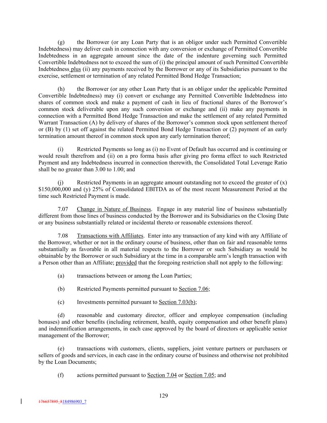 (g) the Borrower (or any Loan Party that is an obligor under such Permitted Convertible Indebtedness) may deliver cash in connection with any conversion or exchange of Permitted Convertible Indebtedness in an aggregate amount since the date of the indenture governing such Permitted Convertible Indebtedness not to exceed the sum of (i) the principal amount of such Permitted Convertible Indebtedness plus (ii) any payments received by the Borrower or any of its Subsidiaries pursuant to the exercise, settlement or termination of any related Permitted Bond Hedge Transaction; (h) the Borrower (or any other Loan Party that is an obligor under the applicable Permitted Convertible Indebtedness) may (i) convert or exchange any Permitted Convertible Indebtedness into shares of common stock and make a payment of cash in lieu of fractional shares of the Borrower’s common stock deliverable upon any such conversion or exchange and (ii) make any payments in connection with a Permitted Bond Hedge Transaction and make the settlement of any related Permitted Warrant Transaction (A) by delivery of shares of the Borrower’s common stock upon settlement thereof or (B) by (1) set off against the related Permitted Bond Hedge Transaction or (2) payment of an early termination amount thereof in common stock upon any early termination thereof; (i) Restricted Payments so long as (i) no Event of Default has occurred and is continuing or would result therefrom and (ii) on a pro forma basis after giving pro forma effect to such Restricted Payment and any Indebtedness incurred in connection therewith, the Consolidated Total Leverage Ratio shall be no greater than 3.00 to 1.00; and (j) Restricted Payments in an aggregate amount outstanding not to exceed the greater of (x) $150,000,000 and (y) 25% of Consolidated EBITDA as of the most recent Measurement Period at the time such Restricted Payment is made. 7.07 Change in Nature of Business. Engage in any material line of business substantially different from those lines of business conducted by the Borrower and its Subsidiaries on the Closing Date or any business substantially related or incidental thereto or reasonable extensions thereof. 7.08 Transactions with Affiliates. Enter into any transaction of any kind with any Affiliate of the Borrower, whether or not in the ordinary course of business, other than on fair and reasonable terms substantially as favorable in all material respects to the Borrower or such Subsidiary as would be obtainable by the Borrower or such Subsidiary at the time in a comparable arm’s length transaction with a Person other than an Affiliate; provided that the foregoing restriction shall not apply to the following: (a) transactions between or among the Loan Parties; (b) Restricted Payments permitted pursuant to Section 7.06; (c) Investments permitted pursuant to Section 7.03(b); (d) reasonable and customary director, officer and employee compensation (including bonuses) and other benefits (including retirement, health, equity compensation and other benefit plans) and indemnification arrangements, in each case approved by the board of directors or applicable senior management of the Borrower; (e) transactions with customers, clients, suppliers, joint venture partners or purchasers or sellers of goods and services, in each case in the ordinary course of business and otherwise not prohibited by the Loan Documents; (f) actions permitted pursuant to Section 7.04 or Section 7.05; and 129 176657895_8184986903_7