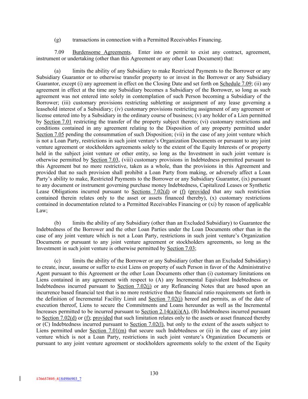(g) transactions in connection with a Permitted Receivables Financing. 7.09 Burdensome Agreements. Enter into or permit to exist any contract, agreement, instrument or undertaking (other than this Agreement or any other Loan Document) that: (a) limits the ability of any Subsidiary to make Restricted Payments to the Borrower or any Subsidiary Guarantor or to otherwise transfer property to or invest in the Borrower or any Subsidiary Guarantor, except (i) any agreement in effect on the Closing Date and set forth on Schedule 7.09; (ii) any agreement in effect at the time any Subsidiary becomes a Subsidiary of the Borrower, so long as such agreement was not entered into solely in contemplation of such Person becoming a Subsidiary of the Borrower; (iii) customary provisions restricting subletting or assignment of any lease governing a leasehold interest of a Subsidiary; (iv) customary provisions restricting assignment of any agreement or license entered into by a Subsidiary in the ordinary course of business; (v) any holder of a Lien permitted by Section 7.01 restricting the transfer of the property subject thereto; (vi) customary restrictions and conditions contained in any agreement relating to the Disposition of any property permitted under Section 7.05 pending the consummation of such Disposition; (vii) in the case of any joint venture which is not a Loan Party, restrictions in such joint venture’s Organization Documents or pursuant to any joint venture agreement or stockholders agreements solely to the extent of the Equity Interests of or property held in the subject joint venture or other entity, so long as the Investment in such joint venture is otherwise permitted by Section 7.03, (viii) customary provisions in Indebtedness permitted pursuant to this Agreement but no more restrictive, taken as a whole, than the provisions in this Agreement and provided that no such provision shall prohibit a Loan Party from making, or adversely affect a Loan Party’s ability to make, Restricted Payments to the Borrower or any Subsidiary Guarantor, (ix) pursuant to any document or instrument governing purchase money Indebtedness, Capitalized Leases or Synthetic Lease Obligations incurred pursuant to Sections 7.02(d) or (f) (provided that any such restriction contained therein relates only to the asset or assets financed thereby), (x) customary restrictions contained in documentation related to a Permitted Receivables Financing or (xi) by reason of applicable Law; (b) limits the ability of any Subsidiary (other than an Excluded Subsidiary) to Guarantee the Indebtedness of the Borrower and the other Loan Parties under the Loan Documents other than in the case of any joint venture which is not a Loan Party, restrictions in such joint venture’s Organization Documents or pursuant to any joint venture agreement or stockholders agreements, so long as the Investment in such joint venture is otherwise permitted by Section 7.03; (c) limits the ability of the Borrower or any Subsidiary (other than an Excluded Subsidiary) to create, incur, assume or suffer to exist Liens on property of such Person in favor of the Administrative Agent pursuant to this Agreement or the other Loan Documents other than (i) customary limitations on Liens contained in any agreement with respect to (A) any Incremental Equivalent Indebtedness or Indebtedness incurred pursuant to Section 7.02(j) or any Refinancing Notes that are based upon an incurrence based financial test that is no more restrictive than the financial ratio requirements set forth in the definition of Incremental Facility Limit and Section 7.02(j) hereof and permits, as of the date of execution thereof, Liens to secure the Commitments and Loans hereunder as well as the Incremental Increases permitted to be incurred pursuant to Section 2.14(a)(i)(A), (B) Indebtedness incurred pursuant to Section 7.02(d) or (f); provided that such limitation relates only to the assets or asset financed thereby or (C) Indebtedness incurred pursuant to Section 7.02(l), but only to the extent of the assets subject to Liens permitted under Section 7.01(m) that secure such Indebtedness or (ii) in the case of any joint venture which is not a Loan Party, restrictions in such joint venture’s Organization Documents or pursuant to any joint venture agreement or stockholders agreements solely to the extent of the Equity 130 176657895_8184986903_7