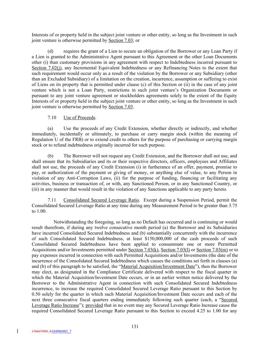 Interests of or property held in the subject joint venture or other entity, so long as the Investment in such joint venture is otherwise permitted by Section 7.03; or (d) requires the grant of a Lien to secure an obligation of the Borrower or any Loan Party if a Lien is granted to the Administrative Agent pursuant to this Agreement or the other Loan Documents other (i) than customary provisions in any agreement with respect to Indebtedness incurred pursuant to Section 7.02(j), any Incremental Equivalent Indebtedness or any Refinancing Notes to the extent that such requirement would occur only as a result of the violation by the Borrower or any Subsidiary (other than an Excluded Subsidiary) of a limitation on the creation, incurrence, assumption or suffering to exist of Liens on its property that is permitted under clause (c) of this Section or (ii) in the case of any joint venture which is not a Loan Party, restrictions in such joint venture’s Organization Documents or pursuant to any joint venture agreement or stockholders agreements solely to the extent of the Equity Interests of or property held in the subject joint venture or other entity, so long as the Investment in such joint venture is otherwise permitted by Section 7.03. 7.10 Use of Proceeds. (a) Use the proceeds of any Credit Extension, whether directly or indirectly, and whether immediately, incidentally or ultimately, to purchase or carry margin stock (within the meaning of Regulation U of the FRB) or to extend credit to others for the purpose of purchasing or carrying margin stock or to refund indebtedness originally incurred for such purpose. (b) The Borrower will not request any Credit Extension, and the Borrower shall not use, and shall ensure that its Subsidiaries and its or their respective directors, officers, employees and Affiliates shall not use, the proceeds of any Credit Extension (i) in furtherance of an offer, payment, promise to pay, or authorization of the payment or giving of money, or anything else of value, to any Person in violation of any Anti-Corruption Laws, (ii) for the purpose of funding, financing or facilitating any activities, business or transaction of, or with, any Sanctioned Person, or in any Sanctioned Country, or (iii) in any manner that would result in the violation of any Sanctions applicable to any party hereto. 7.11 Consolidated Secured Leverage Ratio. Except during a Suspension Period, permit the Consolidated Secured Leverage Ratio at any time during any Measurement Period to be greater than 3.75 to 1.00. Notwithstanding the foregoing, so long as no Default has occurred and is continuing or would result therefrom, if during any twelve consecutive month period (a) the Borrower and its Subsidiaries have incurred Consolidated Secured Indebtedness and (b) substantially concurrently with the incurrence of such Consolidated Secured Indebtedness, at least $150,000,000 of the cash proceeds of such Consolidated Secured Indebtedness have been applied to consummate one or more Permitted Acquisitions and/or Investments permitted under Section 7.03(k), Section 7.03(l) or Section 7.03(m) or to pay expenses incurred in connection with such Permitted Acquisitions and/or Investments (the date of the incurrence of the Consolidated Secured Indebtedness which causes the conditions set forth in clauses (a) and (b) of this paragraph to be satisfied, the “Material Acquisition/Investment Date”), then the Borrower may elect, as designated in the Compliance Certificate delivered with respect to the fiscal quarter in which the Material Acquisition/Investment Date occurs, or in an earlier written notice delivered by the Borrower to the Administrative Agent in connection with such Consolidated Secured Indebtedness incurrence, to increase the required Consolidated Secured Leverage Ratio pursuant to this Section by 0.50 solely for the quarter in which such Material Acquisition/Investment Date occurs and each of the next three consecutive fiscal quarters ending immediately following such quarter (each, a “Secured Leverage Ratio Increase”); provided that in no event may any Secured Leverage Ratio Increase cause the required Consolidated Secured Leverage Ratio pursuant to this Section to exceed 4.25 to 1.00 for any 131 176657895_8184986903_7