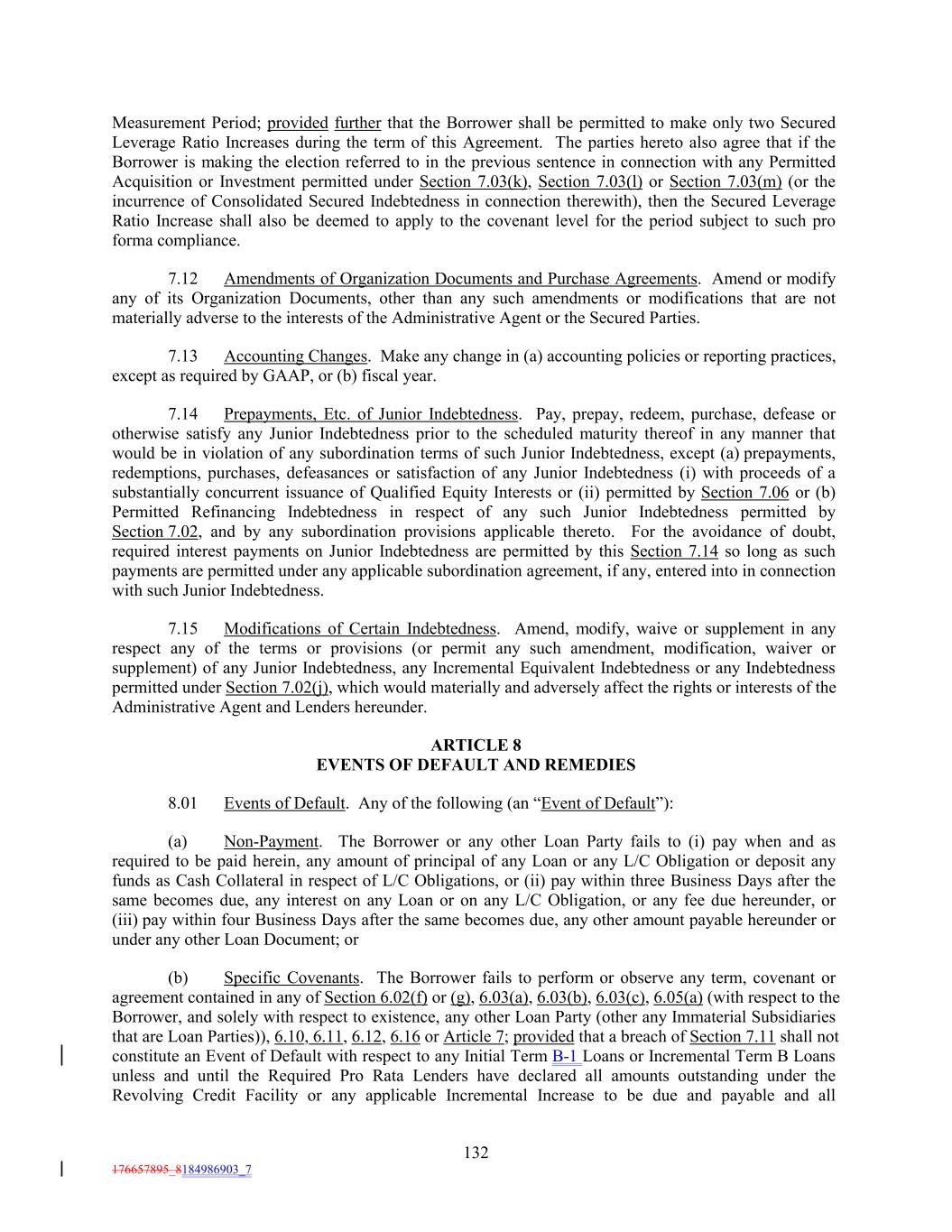 Measurement Period; provided further that the Borrower shall be permitted to make only two Secured Leverage Ratio Increases during the term of this Agreement. The parties hereto also agree that if the Borrower is making the election referred to in the previous sentence in connection with any Permitted Acquisition or Investment permitted under Section 7.03(k), Section 7.03(l) or Section 7.03(m) (or the incurrence of Consolidated Secured Indebtedness in connection therewith), then the Secured Leverage Ratio Increase shall also be deemed to apply to the covenant level for the period subject to such pro forma compliance. 7.12 Amendments of Organization Documents and Purchase Agreements. Amend or modify any of its Organization Documents, other than any such amendments or modifications that are not materially adverse to the interests of the Administrative Agent or the Secured Parties. 7.13 Accounting Changes. Make any change in (a) accounting policies or reporting practices, except as required by GAAP, or (b) fiscal year. 7.14 Prepayments, Etc. of Junior Indebtedness. Pay, prepay, redeem, purchase, defease or otherwise satisfy any Junior Indebtedness prior to the scheduled maturity thereof in any manner that would be in violation of any subordination terms of such Junior Indebtedness, except (a) prepayments, redemptions, purchases, defeasances or satisfaction of any Junior Indebtedness (i) with proceeds of a substantially concurrent issuance of Qualified Equity Interests or (ii) permitted by Section 7.06 or (b) Permitted Refinancing Indebtedness in respect of any such Junior Indebtedness permitted by Section 7.02, and by any subordination provisions applicable thereto. For the avoidance of doubt, required interest payments on Junior Indebtedness are permitted by this Section 7.14 so long as such payments are permitted under any applicable subordination agreement, if any, entered into in connection with such Junior Indebtedness. 7.15 Modifications of Certain Indebtedness. Amend, modify, waive or supplement in any respect any of the terms or provisions (or permit any such amendment, modification, waiver or supplement) of any Junior Indebtedness, any Incremental Equivalent Indebtedness or any Indebtedness permitted under Section 7.02(j), which would materially and adversely affect the rights or interests of the Administrative Agent and Lenders hereunder. ARTICLE 8 EVENTS OF DEFAULT AND REMEDIES 8.01 Events of Default. Any of the following (an “Event of Default”): (a) Non-Payment. The Borrower or any other Loan Party fails to (i) pay when and as required to be paid herein, any amount of principal of any Loan or any L/C Obligation or deposit any funds as Cash Collateral in respect of L/C Obligations, or (ii) pay within three Business Days after the same becomes due, any interest on any Loan or on any L/C Obligation, or any fee due hereunder, or (iii) pay within four Business Days after the same becomes due, any other amount payable hereunder or under any other Loan Document; or (b) Specific Covenants. The Borrower fails to perform or observe any term, covenant or agreement contained in any of Section 6.02(f) or (g), 6.03(a), 6.03(b), 6.03(c), 6.05(a) (with respect to the Borrower, and solely with respect to existence, any other Loan Party (other any Immaterial Subsidiaries that are Loan Parties)), 6.10, 6.11, 6.12, 6.16 or Article 7; provided that a breach of Section 7.11 shall not constitute an Event of Default with respect to any Initial Term B-1 Loans or Incremental Term B Loans unless and until the Required Pro Rata Lenders have declared all amounts outstanding under the Revolving Credit Facility or any applicable Incremental Increase to be due and payable and all 132 176657895_8184986903_7