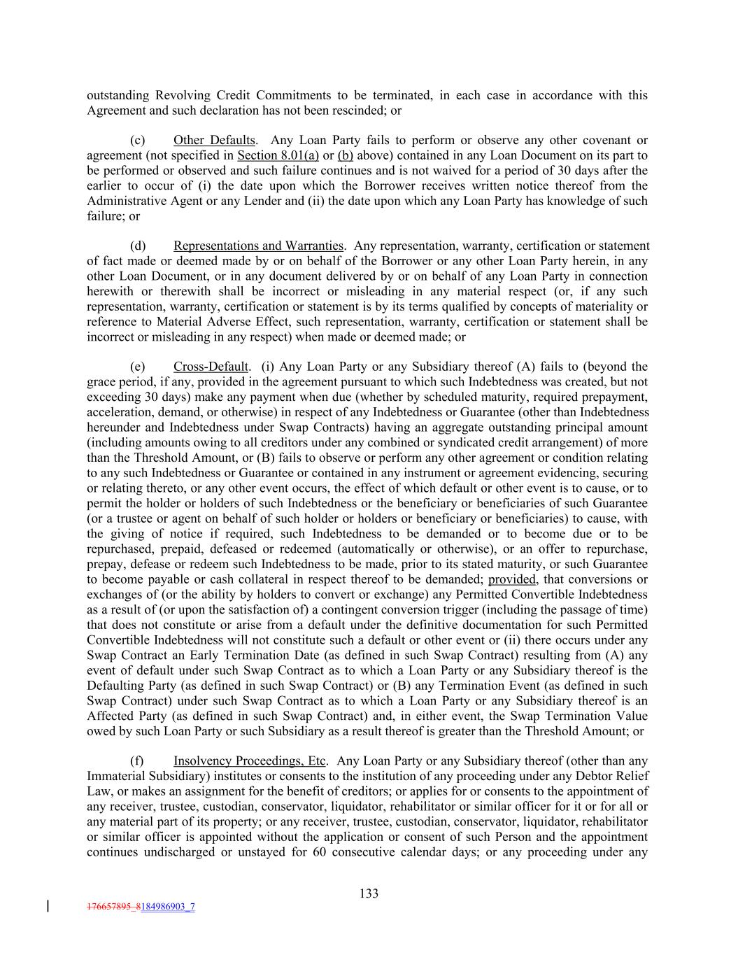 outstanding Revolving Credit Commitments to be terminated, in each case in accordance with this Agreement and such declaration has not been rescinded; or (c) Other Defaults. Any Loan Party fails to perform or observe any other covenant or agreement (not specified in Section 8.01(a) or (b) above) contained in any Loan Document on its part to be performed or observed and such failure continues and is not waived for a period of 30 days after the earlier to occur of (i) the date upon which the Borrower receives written notice thereof from the Administrative Agent or any Lender and (ii) the date upon which any Loan Party has knowledge of such failure; or (d) Representations and Warranties. Any representation, warranty, certification or statement of fact made or deemed made by or on behalf of the Borrower or any other Loan Party herein, in any other Loan Document, or in any document delivered by or on behalf of any Loan Party in connection herewith or therewith shall be incorrect or misleading in any material respect (or, if any such representation, warranty, certification or statement is by its terms qualified by concepts of materiality or reference to Material Adverse Effect, such representation, warranty, certification or statement shall be incorrect or misleading in any respect) when made or deemed made; or (e) Cross-Default. (i) Any Loan Party or any Subsidiary thereof (A) fails to (beyond the grace period, if any, provided in the agreement pursuant to which such Indebtedness was created, but not exceeding 30 days) make any payment when due (whether by scheduled maturity, required prepayment, acceleration, demand, or otherwise) in respect of any Indebtedness or Guarantee (other than Indebtedness hereunder and Indebtedness under Swap Contracts) having an aggregate outstanding principal amount (including amounts owing to all creditors under any combined or syndicated credit arrangement) of more than the Threshold Amount, or (B) fails to observe or perform any other agreement or condition relating to any such Indebtedness or Guarantee or contained in any instrument or agreement evidencing, securing or relating thereto, or any other event occurs, the effect of which default or other event is to cause, or to permit the holder or holders of such Indebtedness or the beneficiary or beneficiaries of such Guarantee (or a trustee or agent on behalf of such holder or holders or beneficiary or beneficiaries) to cause, with the giving of notice if required, such Indebtedness to be demanded or to become due or to be repurchased, prepaid, defeased or redeemed (automatically or otherwise), or an offer to repurchase, prepay, defease or redeem such Indebtedness to be made, prior to its stated maturity, or such Guarantee to become payable or cash collateral in respect thereof to be demanded; provided, that conversions or exchanges of (or the ability by holders to convert or exchange) any Permitted Convertible Indebtedness as a result of (or upon the satisfaction of) a contingent conversion trigger (including the passage of time) that does not constitute or arise from a default under the definitive documentation for such Permitted Convertible Indebtedness will not constitute such a default or other event or (ii) there occurs under any Swap Contract an Early Termination Date (as defined in such Swap Contract) resulting from (A) any event of default under such Swap Contract as to which a Loan Party or any Subsidiary thereof is the Defaulting Party (as defined in such Swap Contract) or (B) any Termination Event (as defined in such Swap Contract) under such Swap Contract as to which a Loan Party or any Subsidiary thereof is an Affected Party (as defined in such Swap Contract) and, in either event, the Swap Termination Value owed by such Loan Party or such Subsidiary as a result thereof is greater than the Threshold Amount; or (f) Insolvency Proceedings, Etc. Any Loan Party or any Subsidiary thereof (other than any Immaterial Subsidiary) institutes or consents to the institution of any proceeding under any Debtor Relief Law, or makes an assignment for the benefit of creditors; or applies for or consents to the appointment of any receiver, trustee, custodian, conservator, liquidator, rehabilitator or similar officer for it or for all or any material part of its property; or any receiver, trustee, custodian, conservator, liquidator, rehabilitator or similar officer is appointed without the application or consent of such Person and the appointment continues undischarged or unstayed for 60 consecutive calendar days; or any proceeding under any 133 176657895_8184986903_7