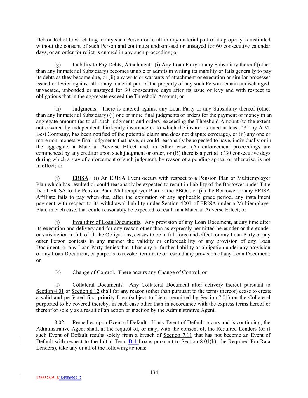 Debtor Relief Law relating to any such Person or to all or any material part of its property is instituted without the consent of such Person and continues undismissed or unstayed for 60 consecutive calendar days, or an order for relief is entered in any such proceeding; or (g) Inability to Pay Debts; Attachment. (i) Any Loan Party or any Subsidiary thereof (other than any Immaterial Subsidiary) becomes unable or admits in writing its inability or fails generally to pay its debts as they become due, or (ii) any writs or warrants of attachment or execution or similar processes issued or levied against all or any material part of the property of any such Person remain undischarged, unvacated, unbonded or unstayed for 30 consecutive days after its issue or levy and with respect to obligations that in the aggregate exceed the Threshold Amount; or (h) Judgments. There is entered against any Loan Party or any Subsidiary thereof (other than any Immaterial Subsidiary) (i) one or more final judgments or orders for the payment of money in an aggregate amount (as to all such judgments and orders) exceeding the Threshold Amount (to the extent not covered by independent third-party insurance as to which the insurer is rated at least “A” by A.M. Best Company, has been notified of the potential claim and does not dispute coverage), or (ii) any one or more non-monetary final judgments that have, or could reasonably be expected to have, individually or in the aggregate, a Material Adverse Effect and, in either case, (A) enforcement proceedings are commenced by any creditor upon such judgment or order, or (B) there is a period of 30 consecutive days during which a stay of enforcement of such judgment, by reason of a pending appeal or otherwise, is not in effect; or (i) ERISA. (i) An ERISA Event occurs with respect to a Pension Plan or Multiemployer Plan which has resulted or could reasonably be expected to result in liability of the Borrower under Title IV of ERISA to the Pension Plan, Multiemployer Plan or the PBGC, or (ii) the Borrower or any ERISA Affiliate fails to pay when due, after the expiration of any applicable grace period, any installment payment with respect to its withdrawal liability under Section 4201 of ERISA under a Multiemployer Plan, in each case, that could reasonably be expected to result in a Material Adverse Effect; or (j) Invalidity of Loan Documents. Any provision of any Loan Document, at any time after its execution and delivery and for any reason other than as expressly permitted hereunder or thereunder or satisfaction in full of all the Obligations, ceases to be in full force and effect; or any Loan Party or any other Person contests in any manner the validity or enforceability of any provision of any Loan Document; or any Loan Party denies that it has any or further liability or obligation under any provision of any Loan Document, or purports to revoke, terminate or rescind any provision of any Loan Document; or (k) Change of Control. There occurs any Change of Control; or (l) Collateral Documents. Any Collateral Document after delivery thereof pursuant to Section 4.01 or Section 6.12 shall for any reason (other than pursuant to the terms thereof) cease to create a valid and perfected first priority Lien (subject to Liens permitted by Section 7.01) on the Collateral purported to be covered thereby, in each case other than in accordance with the express terms hereof or thereof or solely as a result of an action or inaction by the Administrative Agent. 8.02 Remedies upon Event of Default. If any Event of Default occurs and is continuing, the Administrative Agent shall, at the request of, or may, with the consent of, the Required Lenders (or if such Event of Default results solely from a breach of Section 7.11 that has not become an Event of Default with respect to the Initial Term B-1 Loans pursuant to Section 8.01(b), the Required Pro Rata Lenders), take any or all of the following actions: 134 176657895_8184986903_7