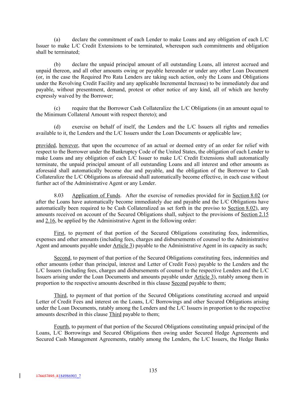 (a) declare the commitment of each Lender to make Loans and any obligation of each L/C Issuer to make L/C Credit Extensions to be terminated, whereupon such commitments and obligation shall be terminated; (b) declare the unpaid principal amount of all outstanding Loans, all interest accrued and unpaid thereon, and all other amounts owing or payable hereunder or under any other Loan Document (or, in the case the Required Pro Rata Lenders are taking such action, only the Loans and Obligations under the Revolving Credit Facility and any applicable Incremental Increase) to be immediately due and payable, without presentment, demand, protest or other notice of any kind, all of which are hereby expressly waived by the Borrower; (c) require that the Borrower Cash Collateralize the L/C Obligations (in an amount equal to the Minimum Collateral Amount with respect thereto); and (d) exercise on behalf of itself, the Lenders and the L/C Issuers all rights and remedies available to it, the Lenders and the L/C Issuers under the Loan Documents or applicable law; provided, however, that upon the occurrence of an actual or deemed entry of an order for relief with respect to the Borrower under the Bankruptcy Code of the United States, the obligation of each Lender to make Loans and any obligation of each L/C Issuer to make L/C Credit Extensions shall automatically terminate, the unpaid principal amount of all outstanding Loans and all interest and other amounts as aforesaid shall automatically become due and payable, and the obligation of the Borrower to Cash Collateralize the L/C Obligations as aforesaid shall automatically become effective, in each case without further act of the Administrative Agent or any Lender. 8.03 Application of Funds. After the exercise of remedies provided for in Section 8.02 (or after the Loans have automatically become immediately due and payable and the L/C Obligations have automatically been required to be Cash Collateralized as set forth in the proviso to Section 8.02), any amounts received on account of the Secured Obligations shall, subject to the provisions of Section 2.15 and 2.16, be applied by the Administrative Agent in the following order: First, to payment of that portion of the Secured Obligations constituting fees, indemnities, expenses and other amounts (including fees, charges and disbursements of counsel to the Administrative Agent and amounts payable under Article 3) payable to the Administrative Agent in its capacity as such; Second, to payment of that portion of the Secured Obligations constituting fees, indemnities and other amounts (other than principal, interest and Letter of Credit Fees) payable to the Lenders and the L/C Issuers (including fees, charges and disbursements of counsel to the respective Lenders and the L/C Issuers arising under the Loan Documents and amounts payable under Article 3), ratably among them in proportion to the respective amounts described in this clause Second payable to them; Third, to payment of that portion of the Secured Obligations constituting accrued and unpaid Letter of Credit Fees and interest on the Loans, L/C Borrowings and other Secured Obligations arising under the Loan Documents, ratably among the Lenders and the L/C Issuers in proportion to the respective amounts described in this clause Third payable to them; Fourth, to payment of that portion of the Secured Obligations constituting unpaid principal of the Loans, L/C Borrowings and Secured Obligations then owing under Secured Hedge Agreements and Secured Cash Management Agreements, ratably among the Lenders, the L/C Issuers, the Hedge Banks 135 176657895_8184986903_7