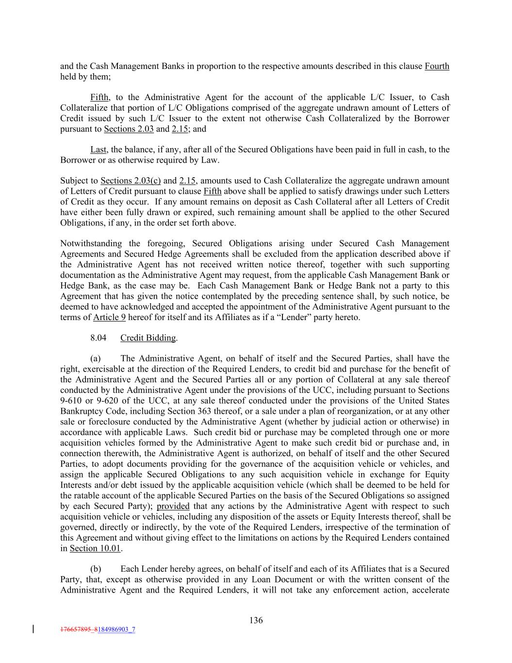 and the Cash Management Banks in proportion to the respective amounts described in this clause Fourth held by them; Fifth, to the Administrative Agent for the account of the applicable L/C Issuer, to Cash Collateralize that portion of L/C Obligations comprised of the aggregate undrawn amount of Letters of Credit issued by such L/C Issuer to the extent not otherwise Cash Collateralized by the Borrower pursuant to Sections 2.03 and 2.15; and Last, the balance, if any, after all of the Secured Obligations have been paid in full in cash, to the Borrower or as otherwise required by Law. Subject to Sections 2.03(c) and 2.15, amounts used to Cash Collateralize the aggregate undrawn amount of Letters of Credit pursuant to clause Fifth above shall be applied to satisfy drawings under such Letters of Credit as they occur. If any amount remains on deposit as Cash Collateral after all Letters of Credit have either been fully drawn or expired, such remaining amount shall be applied to the other Secured Obligations, if any, in the order set forth above. Notwithstanding the foregoing, Secured Obligations arising under Secured Cash Management Agreements and Secured Hedge Agreements shall be excluded from the application described above if the Administrative Agent has not received written notice thereof, together with such supporting documentation as the Administrative Agent may request, from the applicable Cash Management Bank or Hedge Bank, as the case may be. Each Cash Management Bank or Hedge Bank not a party to this Agreement that has given the notice contemplated by the preceding sentence shall, by such notice, be deemed to have acknowledged and accepted the appointment of the Administrative Agent pursuant to the terms of Article 9 hereof for itself and its Affiliates as if a “Lender” party hereto. 8.04 Credit Bidding. (a) The Administrative Agent, on behalf of itself and the Secured Parties, shall have the right, exercisable at the direction of the Required Lenders, to credit bid and purchase for the benefit of the Administrative Agent and the Secured Parties all or any portion of Collateral at any sale thereof conducted by the Administrative Agent under the provisions of the UCC, including pursuant to Sections 9-610 or 9-620 of the UCC, at any sale thereof conducted under the provisions of the United States Bankruptcy Code, including Section 363 thereof, or a sale under a plan of reorganization, or at any other sale or foreclosure conducted by the Administrative Agent (whether by judicial action or otherwise) in accordance with applicable Laws. Such credit bid or purchase may be completed through one or more acquisition vehicles formed by the Administrative Agent to make such credit bid or purchase and, in connection therewith, the Administrative Agent is authorized, on behalf of itself and the other Secured Parties, to adopt documents providing for the governance of the acquisition vehicle or vehicles, and assign the applicable Secured Obligations to any such acquisition vehicle in exchange for Equity Interests and/or debt issued by the applicable acquisition vehicle (which shall be deemed to be held for the ratable account of the applicable Secured Parties on the basis of the Secured Obligations so assigned by each Secured Party); provided that any actions by the Administrative Agent with respect to such acquisition vehicle or vehicles, including any disposition of the assets or Equity Interests thereof, shall be governed, directly or indirectly, by the vote of the Required Lenders, irrespective of the termination of this Agreement and without giving effect to the limitations on actions by the Required Lenders contained in Section 10.01. (b) Each Lender hereby agrees, on behalf of itself and each of its Affiliates that is a Secured Party, that, except as otherwise provided in any Loan Document or with the written consent of the Administrative Agent and the Required Lenders, it will not take any enforcement action, accelerate 136 176657895_8184986903_7
