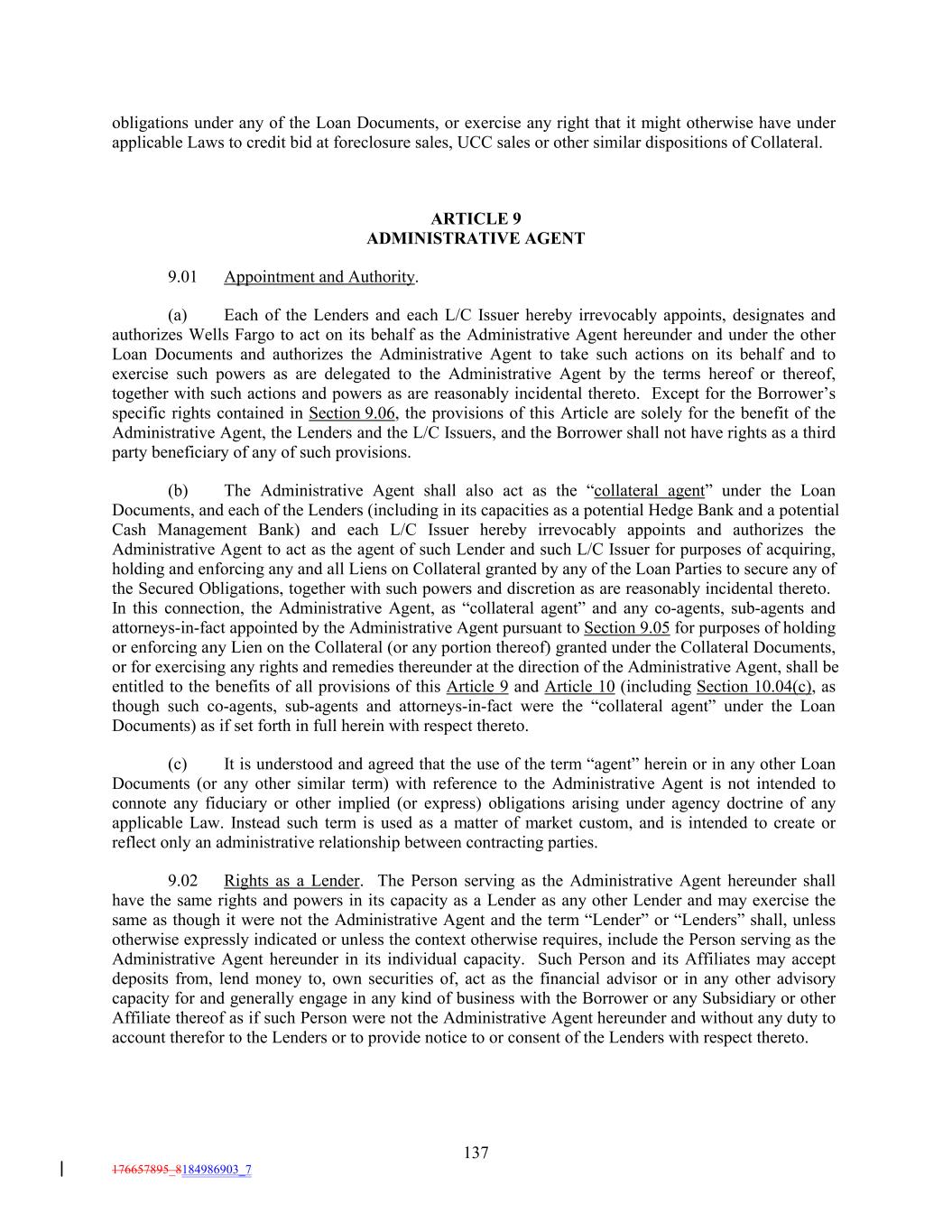 obligations under any of the Loan Documents, or exercise any right that it might otherwise have under applicable Laws to credit bid at foreclosure sales, UCC sales or other similar dispositions of Collateral. ARTICLE 9 ADMINISTRATIVE AGENT 9.01 Appointment and Authority. (a) Each of the Lenders and each L/C Issuer hereby irrevocably appoints, designates and authorizes Wells Fargo to act on its behalf as the Administrative Agent hereunder and under the other Loan Documents and authorizes the Administrative Agent to take such actions on its behalf and to exercise such powers as are delegated to the Administrative Agent by the terms hereof or thereof, together with such actions and powers as are reasonably incidental thereto. Except for the Borrower’s specific rights contained in Section 9.06, the provisions of this Article are solely for the benefit of the Administrative Agent, the Lenders and the L/C Issuers, and the Borrower shall not have rights as a third party beneficiary of any of such provisions. (b) The Administrative Agent shall also act as the “collateral agent” under the Loan Documents, and each of the Lenders (including in its capacities as a potential Hedge Bank and a potential Cash Management Bank) and each L/C Issuer hereby irrevocably appoints and authorizes the Administrative Agent to act as the agent of such Lender and such L/C Issuer for purposes of acquiring, holding and enforcing any and all Liens on Collateral granted by any of the Loan Parties to secure any of the Secured Obligations, together with such powers and discretion as are reasonably incidental thereto. In this connection, the Administrative Agent, as “collateral agent” and any co-agents, sub-agents and attorneys-in-fact appointed by the Administrative Agent pursuant to Section 9.05 for purposes of holding or enforcing any Lien on the Collateral (or any portion thereof) granted under the Collateral Documents, or for exercising any rights and remedies thereunder at the direction of the Administrative Agent, shall be entitled to the benefits of all provisions of this Article 9 and Article 10 (including Section 10.04(c), as though such co-agents, sub-agents and attorneys-in-fact were the “collateral agent” under the Loan Documents) as if set forth in full herein with respect thereto. (c) It is understood and agreed that the use of the term “agent” herein or in any other Loan Documents (or any other similar term) with reference to the Administrative Agent is not intended to connote any fiduciary or other implied (or express) obligations arising under agency doctrine of any applicable Law. Instead such term is used as a matter of market custom, and is intended to create or reflect only an administrative relationship between contracting parties. 9.02 Rights as a Lender. The Person serving as the Administrative Agent hereunder shall have the same rights and powers in its capacity as a Lender as any other Lender and may exercise the same as though it were not the Administrative Agent and the term “Lender” or “Lenders” shall, unless otherwise expressly indicated or unless the context otherwise requires, include the Person serving as the Administrative Agent hereunder in its individual capacity. Such Person and its Affiliates may accept deposits from, lend money to, own securities of, act as the financial advisor or in any other advisory capacity for and generally engage in any kind of business with the Borrower or any Subsidiary or other Affiliate thereof as if such Person were not the Administrative Agent hereunder and without any duty to account therefor to the Lenders or to provide notice to or consent of the Lenders with respect thereto. 137 176657895_8184986903_7