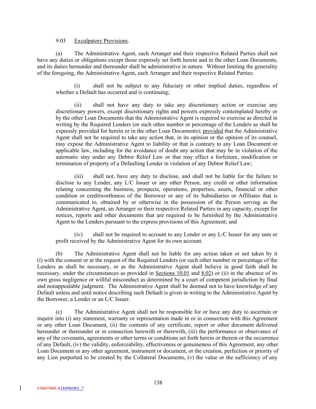 9.03 Exculpatory Provisions. (a) The Administrative Agent, each Arranger and their respective Related Parties shall not have any duties or obligations except those expressly set forth herein and in the other Loan Documents, and its duties hereunder and thereunder shall be administrative in nature. Without limiting the generality of the foregoing, the Administrative Agent, each Arranger and their respective Related Parties: (i) shall not be subject to any fiduciary or other implied duties, regardless of whether a Default has occurred and is continuing; (ii) shall not have any duty to take any discretionary action or exercise any discretionary powers, except discretionary rights and powers expressly contemplated hereby or by the other Loan Documents that the Administrative Agent is required to exercise as directed in writing by the Required Lenders (or such other number or percentage of the Lenders as shall be expressly provided for herein or in the other Loan Documents); provided that the Administrative Agent shall not be required to take any action that, in its opinion or the opinion of its counsel, may expose the Administrative Agent to liability or that is contrary to any Loan Document or applicable law, including for the avoidance of doubt any action that may be in violation of the automatic stay under any Debtor Relief Law or that may effect a forfeiture, modification or termination of property of a Defaulting Lender in violation of any Debtor Relief Law; (iii) shall not, have any duty to disclose, and shall not be liable for the failure to disclose to any Lender, any L/C Issuer or any other Person, any credit or other information relating concerning the business, prospects, operations, properties, assets, financial or other condition or creditworthiness of the Borrower or any of its Subsidiaries or Affiliates that is communicated to, obtained by or otherwise in the possession of the Person serving as the Administrative Agent, an Arranger or their respective Related Parties in any capacity, except for notices, reports and other documents that are required to be furnished by the Administrative Agent to the Lenders pursuant to the express provisions of this Agreement; and (iv) shall not be required to account to any Lender or any L/C Issuer for any sum or profit received by the Administrative Agent for its own account. (b) The Administrative Agent shall not be liable for any action taken or not taken by it (i) with the consent or at the request of the Required Lenders (or such other number or percentage of the Lenders as shall be necessary, or as the Administrative Agent shall believe in good faith shall be necessary, under the circumstances as provided in Sections 10.01 and 8.02) or (ii) in the absence of its own gross negligence or willful misconduct as determined by a court of competent jurisdiction by final and nonappealable judgment. The Administrative Agent shall be deemed not to have knowledge of any Default unless and until notice describing such Default is given in writing to the Administrative Agent by the Borrower, a Lender or an L/C Issuer. (c) The Administrative Agent shall not be responsible for or have any duty to ascertain or inquire into (i) any statement, warranty or representation made in or in connection with this Agreement or any other Loan Document, (ii) the contents of any certificate, report or other document delivered hereunder or thereunder or in connection herewith or therewith, (iii) the performance or observance of any of the covenants, agreements or other terms or conditions set forth herein or therein or the occurrence of any Default, (iv) the validity, enforceability, effectiveness or genuineness of this Agreement, any other Loan Document or any other agreement, instrument or document, or the creation, perfection or priority of any Lien purported to be created by the Collateral Documents, (v) the value or the sufficiency of any 138 176657895_8184986903_7