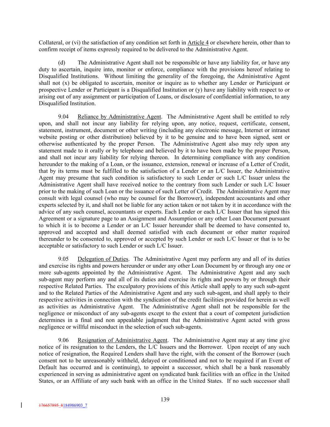 Collateral, or (vi) the satisfaction of any condition set forth in Article 4 or elsewhere herein, other than to confirm receipt of items expressly required to be delivered to the Administrative Agent. (d) The Administrative Agent shall not be responsible or have any liability for, or have any duty to ascertain, inquire into, monitor or enforce, compliance with the provisions hereof relating to Disqualified Institutions. Without limiting the generality of the foregoing, the Administrative Agent shall not (x) be obligated to ascertain, monitor or inquire as to whether any Lender or Participant or prospective Lender or Participant is a Disqualified Institution or (y) have any liability with respect to or arising out of any assignment or participation of Loans, or disclosure of confidential information, to any Disqualified Institution. 9.04 Reliance by Administrative Agent. The Administrative Agent shall be entitled to rely upon, and shall not incur any liability for relying upon, any notice, request, certificate, consent, statement, instrument, document or other writing (including any electronic message, Internet or intranet website posting or other distribution) believed by it to be genuine and to have been signed, sent or otherwise authenticated by the proper Person. The Administrative Agent also may rely upon any statement made to it orally or by telephone and believed by it to have been made by the proper Person, and shall not incur any liability for relying thereon. In determining compliance with any condition hereunder to the making of a Loan, or the issuance, extension, renewal or increase of a Letter of Credit, that by its terms must be fulfilled to the satisfaction of a Lender or an L/C Issuer, the Administrative Agent may presume that such condition is satisfactory to such Lender or such L/C Issuer unless the Administrative Agent shall have received notice to the contrary from such Lender or such L/C Issuer prior to the making of such Loan or the issuance of such Letter of Credit. The Administrative Agent may consult with legal counsel (who may be counsel for the Borrower), independent accountants and other experts selected by it, and shall not be liable for any action taken or not taken by it in accordance with the advice of any such counsel, accountants or experts. Each Lender or each L/C Issuer that has signed this Agreement or a signature page to an Assignment and Assumption or any other Loan Document pursuant to which it is to become a Lender or an L/C Issuer hereunder shall be deemed to have consented to, approved and accepted and shall deemed satisfied with each document or other matter required thereunder to be consented to, approved or accepted by such Lender or such L/C Issuer or that is to be acceptable or satisfactory to such Lender or such L/C Issuer. 9.05 Delegation of Duties. The Administrative Agent may perform any and all of its duties and exercise its rights and powers hereunder or under any other Loan Document by or through any one or more sub-agents appointed by the Administrative Agent. The Administrative Agent and any such sub-agent may perform any and all of its duties and exercise its rights and powers by or through their respective Related Parties. The exculpatory provisions of this Article shall apply to any such sub-agent and to the Related Parties of the Administrative Agent and any such sub-agent, and shall apply to their respective activities in connection with the syndication of the credit facilities provided for herein as well as activities as Administrative Agent. The Administrative Agent shall not be responsible for the negligence or misconduct of any sub-agents except to the extent that a court of competent jurisdiction determines in a final and non appealable judgment that the Administrative Agent acted with gross negligence or willful misconduct in the selection of such sub-agents. 9.06 Resignation of Administrative Agent. The Administrative Agent may at any time give notice of its resignation to the Lenders, the L/C Issuers and the Borrower. Upon receipt of any such notice of resignation, the Required Lenders shall have the right, with the consent of the Borrower (such consent not to be unreasonably withheld, delayed or conditioned and not to be required if an Event of Default has occurred and is continuing), to appoint a successor, which shall be a bank reasonably experienced in serving as administrative agent on syndicated bank facilities with an office in the United States, or an Affiliate of any such bank with an office in the United States. If no such successor shall 139 176657895_8184986903_7