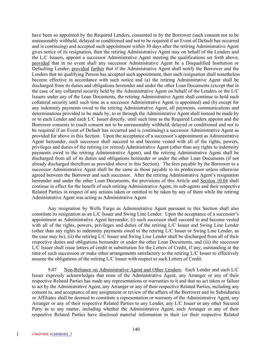 have been so appointed by the Required Lenders, consented to by the Borrower (such consent not to be unreasonably withheld, delayed or conditioned and not to be required if an Event of Default has occurred and is continuing) and accepted such appointment within 30 days after the retiring Administrative Agent gives notice of its resignation, then the retiring Administrative Agent may on behalf of the Lenders and the L/C Issuers, appoint a successor Administrative Agent meeting the qualifications set forth above; provided that in no event shall any successor Administrative Agent be a Disqualified Institution or Defaulting Lender; provided further that if the Administrative Agent shall notify the Borrower and the Lenders that no qualifying Person has accepted such appointment, then such resignation shall nonetheless become effective in accordance with such notice and (a) the retiring Administrative Agent shall be discharged from its duties and obligations hereunder and under the other Loan Documents (except that in the case of any collateral security held by the Administrative Agent on behalf of the Lenders or the L/C Issuers under any of the Loan Documents, the retiring Administrative Agent shall continue to hold such collateral security until such time as a successor Administrative Agent is appointed) and (b) except for any indemnity payments owed to the retiring Administrative Agent, all payments, communications and determinations provided to be made by, to or through the Administrative Agent shall instead be made by or to each Lender and each L/C Issuer directly, until such time as the Required Lenders appoint and the Borrower consents to (such consent not to be unreasonably withheld, delayed or conditioned and not to be required if an Event of Default has occurred and is continuing) a successor Administrative Agent as provided for above in this Section. Upon the acceptance of a successor’s appointment as Administrative Agent hereunder, such successor shall succeed to and become vested with all of the rights, powers, privileges and duties of the retiring (or retired) Administrative Agent (other than any rights to indemnity payments owed to the retiring Administrative Agent), and the retiring Administrative Agent shall be discharged from all of its duties and obligations hereunder or under the other Loan Documents (if not already discharged therefrom as provided above in this Section). The fees payable by the Borrower to a successor Administrative Agent shall be the same as those payable to its predecessor unless otherwise agreed between the Borrower and such successor. After the retiring Administrative Agent’s resignation hereunder and under the other Loan Documents, the provisions of this Article and Section 10.04 shall continue in effect for the benefit of such retiring Administrative Agent, its sub-agents and their respective Related Parties in respect of any actions taken or omitted to be taken by any of them while the retiring Administrative Agent was acting as Administrative Agent. Any resignation by Wells Fargo as Administrative Agent pursuant to this Section shall also constitute its resignation as an L/C Issuer and Swing Line Lender. Upon the acceptance of a successor’s appointment as Administrative Agent hereunder, (i) such successor shall succeed to and become vested with all of the rights, powers, privileges and duties of the retiring L/C Issuer and Swing Line Lender (other than any rights to indemnity payments owed to the retiring L/C Issuer or Swing Line Lender, as the case may be), (ii) the retiring L/C Issuer and Swing Line Lender shall be discharged from all of their respective duties and obligations hereunder or under the other Loan Documents, and (iii) the successor L/C Issuer shall issue letters of credit in substitution for the Letters of Credit, if any, outstanding at the time of such succession or make other arrangements satisfactory to the retiring L/C Issuer to effectively assume the obligations of the retiring L/C Issuer with respect to such Letters of Credit. 9.07 Non-Reliance on Administrative Agent and Other Lenders. Each Lender and each L/C Issuer expressly acknowledges that none of the Administrative Agent, any Arranger or any of their respective Related Parties has made any representations or warranties to it and that no act taken or failure to act by the Administrative Agent, any Arranger or any of their respective Related Parties, including any consent to, and acceptance of any assignment or review of the affairs of the Borrower and its Subsidiaries or Affiliates shall be deemed to constitute a representation or warranty of the Administrative Agent, any Arranger or any of their respective Related Parties to any Lender, any L/C Issuer or any other Secured Party as to any matter, including whether the Administrative Agent, such Arranger or any of their respective Related Parties have disclosed material information in their (or their respective Related 140 176657895_8184986903_7