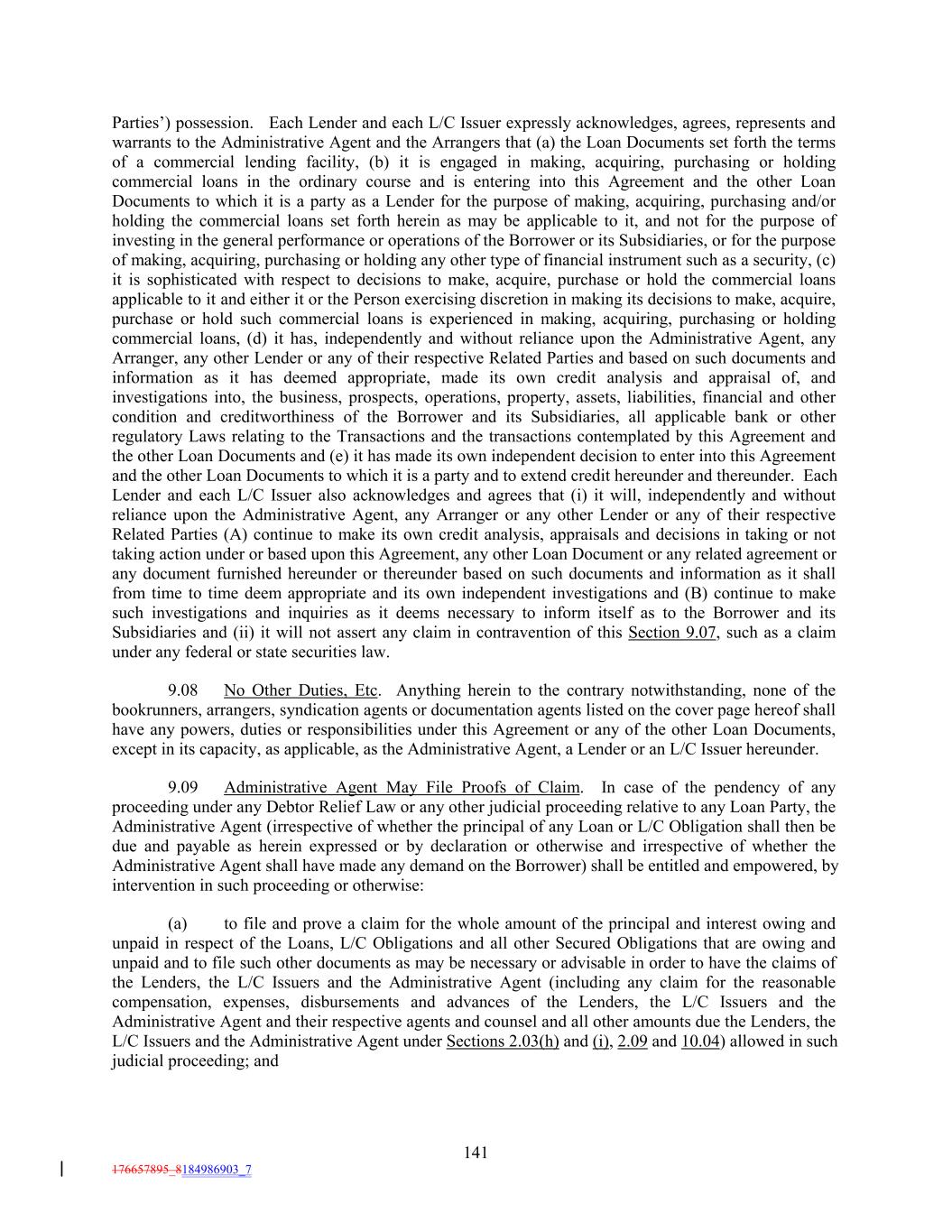 Parties’) possession. Each Lender and each L/C Issuer expressly acknowledges, agrees, represents and warrants to the Administrative Agent and the Arrangers that (a) the Loan Documents set forth the terms of a commercial lending facility, (b) it is engaged in making, acquiring, purchasing or holding commercial loans in the ordinary course and is entering into this Agreement and the other Loan Documents to which it is a party as a Lender for the purpose of making, acquiring, purchasing and/or holding the commercial loans set forth herein as may be applicable to it, and not for the purpose of investing in the general performance or operations of the Borrower or its Subsidiaries, or for the purpose of making, acquiring, purchasing or holding any other type of financial instrument such as a security, (c) it is sophisticated with respect to decisions to make, acquire, purchase or hold the commercial loans applicable to it and either it or the Person exercising discretion in making its decisions to make, acquire, purchase or hold such commercial loans is experienced in making, acquiring, purchasing or holding commercial loans, (d) it has, independently and without reliance upon the Administrative Agent, any Arranger, any other Lender or any of their respective Related Parties and based on such documents and information as it has deemed appropriate, made its own credit analysis and appraisal of, and investigations into, the business, prospects, operations, property, assets, liabilities, financial and other condition and creditworthiness of the Borrower and its Subsidiaries, all applicable bank or other regulatory Laws relating to the Transactions and the transactions contemplated by this Agreement and the other Loan Documents and (e) it has made its own independent decision to enter into this Agreement and the other Loan Documents to which it is a party and to extend credit hereunder and thereunder. Each Lender and each L/C Issuer also acknowledges and agrees that (i) it will, independently and without reliance upon the Administrative Agent, any Arranger or any other Lender or any of their respective Related Parties (A) continue to make its own credit analysis, appraisals and decisions in taking or not taking action under or based upon this Agreement, any other Loan Document or any related agreement or any document furnished hereunder or thereunder based on such documents and information as it shall from time to time deem appropriate and its own independent investigations and (B) continue to make such investigations and inquiries as it deems necessary to inform itself as to the Borrower and its Subsidiaries and (ii) it will not assert any claim in contravention of this Section 9.07, such as a claim under any federal or state securities law. 9.08 No Other Duties, Etc. Anything herein to the contrary notwithstanding, none of the bookrunners, arrangers, syndication agents or documentation agents listed on the cover page hereof shall have any powers, duties or responsibilities under this Agreement or any of the other Loan Documents, except in its capacity, as applicable, as the Administrative Agent, a Lender or an L/C Issuer hereunder. 9.09 Administrative Agent May File Proofs of Claim. In case of the pendency of any proceeding under any Debtor Relief Law or any other judicial proceeding relative to any Loan Party, the Administrative Agent (irrespective of whether the principal of any Loan or L/C Obligation shall then be due and payable as herein expressed or by declaration or otherwise and irrespective of whether the Administrative Agent shall have made any demand on the Borrower) shall be entitled and empowered, by intervention in such proceeding or otherwise: (a) to file and prove a claim for the whole amount of the principal and interest owing and unpaid in respect of the Loans, L/C Obligations and all other Secured Obligations that are owing and unpaid and to file such other documents as may be necessary or advisable in order to have the claims of the Lenders, the L/C Issuers and the Administrative Agent (including any claim for the reasonable compensation, expenses, disbursements and advances of the Lenders, the L/C Issuers and the Administrative Agent and their respective agents and counsel and all other amounts due the Lenders, the L/C Issuers and the Administrative Agent under Sections 2.03(h) and (i), 2.09 and 10.04) allowed in such judicial proceeding; and 141 176657895_8184986903_7