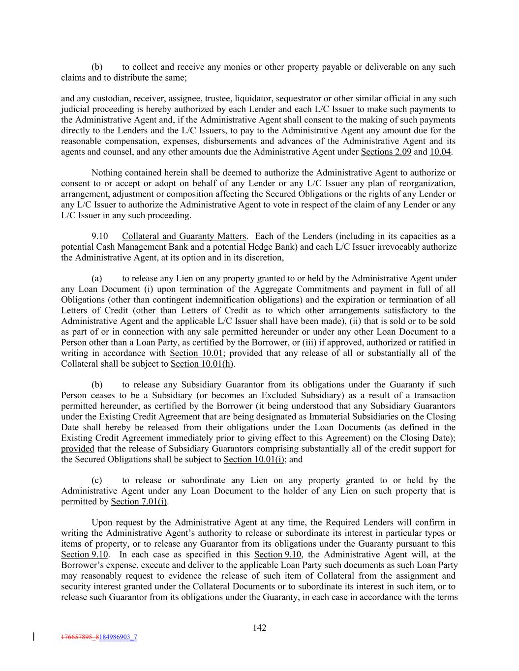 (b) to collect and receive any monies or other property payable or deliverable on any such claims and to distribute the same; and any custodian, receiver, assignee, trustee, liquidator, sequestrator or other similar official in any such judicial proceeding is hereby authorized by each Lender and each L/C Issuer to make such payments to the Administrative Agent and, if the Administrative Agent shall consent to the making of such payments directly to the Lenders and the L/C Issuers, to pay to the Administrative Agent any amount due for the reasonable compensation, expenses, disbursements and advances of the Administrative Agent and its agents and counsel, and any other amounts due the Administrative Agent under Sections 2.09 and 10.04. Nothing contained herein shall be deemed to authorize the Administrative Agent to authorize or consent to or accept or adopt on behalf of any Lender or any L/C Issuer any plan of reorganization, arrangement, adjustment or composition affecting the Secured Obligations or the rights of any Lender or any L/C Issuer to authorize the Administrative Agent to vote in respect of the claim of any Lender or any L/C Issuer in any such proceeding. 9.10 Collateral and Guaranty Matters. Each of the Lenders (including in its capacities as a potential Cash Management Bank and a potential Hedge Bank) and each L/C Issuer irrevocably authorize the Administrative Agent, at its option and in its discretion, (a) to release any Lien on any property granted to or held by the Administrative Agent under any Loan Document (i) upon termination of the Aggregate Commitments and payment in full of all Obligations (other than contingent indemnification obligations) and the expiration or termination of all Letters of Credit (other than Letters of Credit as to which other arrangements satisfactory to the Administrative Agent and the applicable L/C Issuer shall have been made), (ii) that is sold or to be sold as part of or in connection with any sale permitted hereunder or under any other Loan Document to a Person other than a Loan Party, as certified by the Borrower, or (iii) if approved, authorized or ratified in writing in accordance with Section 10.01; provided that any release of all or substantially all of the Collateral shall be subject to Section 10.01(h). (b) to release any Subsidiary Guarantor from its obligations under the Guaranty if such Person ceases to be a Subsidiary (or becomes an Excluded Subsidiary) as a result of a transaction permitted hereunder, as certified by the Borrower (it being understood that any Subsidiary Guarantors under the Existing Credit Agreement that are being designated as Immaterial Subsidiaries on the Closing Date shall hereby be released from their obligations under the Loan Documents (as defined in the Existing Credit Agreement immediately prior to giving effect to this Agreement) on the Closing Date); provided that the release of Subsidiary Guarantors comprising substantially all of the credit support for the Secured Obligations shall be subject to Section 10.01(i); and (c) to release or subordinate any Lien on any property granted to or held by the Administrative Agent under any Loan Document to the holder of any Lien on such property that is permitted by Section 7.01(i). Upon request by the Administrative Agent at any time, the Required Lenders will confirm in writing the Administrative Agent’s authority to release or subordinate its interest in particular types or items of property, or to release any Guarantor from its obligations under the Guaranty pursuant to this Section 9.10. In each case as specified in this Section 9.10, the Administrative Agent will, at the Borrower’s expense, execute and deliver to the applicable Loan Party such documents as such Loan Party may reasonably request to evidence the release of such item of Collateral from the assignment and security interest granted under the Collateral Documents or to subordinate its interest in such item, or to release such Guarantor from its obligations under the Guaranty, in each case in accordance with the terms 142 176657895_8184986903_7