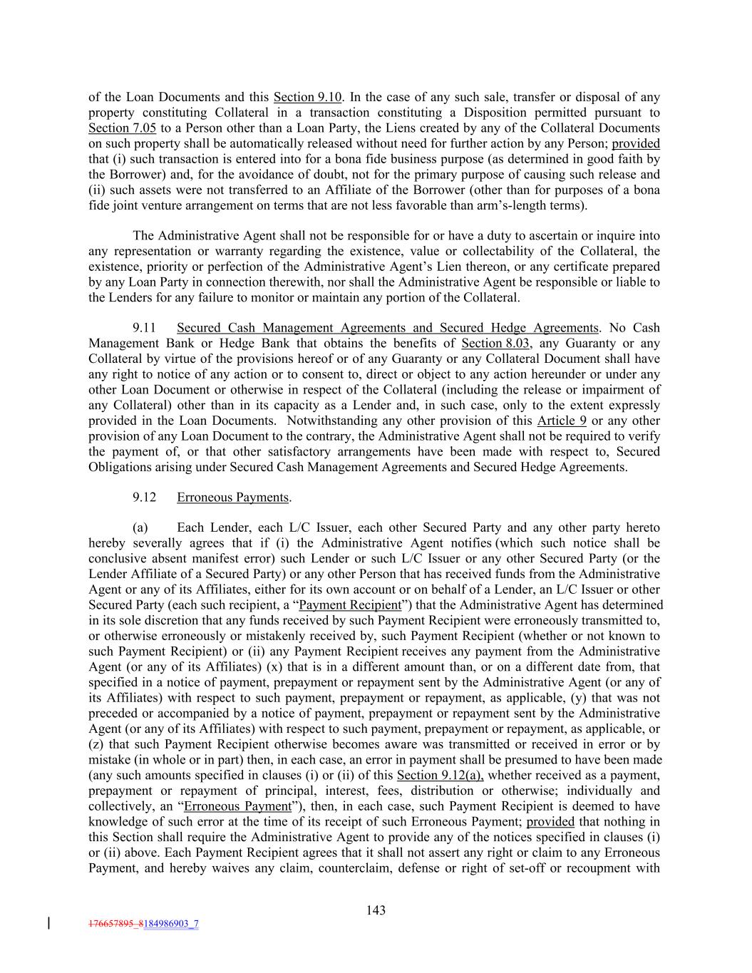 of the Loan Documents and this Section 9.10. In the case of any such sale, transfer or disposal of any property constituting Collateral in a transaction constituting a Disposition permitted pursuant to Section 7.05 to a Person other than a Loan Party, the Liens created by any of the Collateral Documents on such property shall be automatically released without need for further action by any Person; provided that (i) such transaction is entered into for a bona fide business purpose (as determined in good faith by the Borrower) and, for the avoidance of doubt, not for the primary purpose of causing such release and (ii) such assets were not transferred to an Affiliate of the Borrower (other than for purposes of a bona fide joint venture arrangement on terms that are not less favorable than arm’s-length terms). The Administrative Agent shall not be responsible for or have a duty to ascertain or inquire into any representation or warranty regarding the existence, value or collectability of the Collateral, the existence, priority or perfection of the Administrative Agent’s Lien thereon, or any certificate prepared by any Loan Party in connection therewith, nor shall the Administrative Agent be responsible or liable to the Lenders for any failure to monitor or maintain any portion of the Collateral. 9.11 Secured Cash Management Agreements and Secured Hedge Agreements. No Cash Management Bank or Hedge Bank that obtains the benefits of Section 8.03, any Guaranty or any Collateral by virtue of the provisions hereof or of any Guaranty or any Collateral Document shall have any right to notice of any action or to consent to, direct or object to any action hereunder or under any other Loan Document or otherwise in respect of the Collateral (including the release or impairment of any Collateral) other than in its capacity as a Lender and, in such case, only to the extent expressly provided in the Loan Documents. Notwithstanding any other provision of this Article 9 or any other provision of any Loan Document to the contrary, the Administrative Agent shall not be required to verify the payment of, or that other satisfactory arrangements have been made with respect to, Secured Obligations arising under Secured Cash Management Agreements and Secured Hedge Agreements. 9.12 Erroneous Payments. (a) Each Lender, each L/C Issuer, each other Secured Party and any other party hereto hereby severally agrees that if (i) the Administrative Agent notifies (which such notice shall be conclusive absent manifest error) such Lender or such L/C Issuer or any other Secured Party (or the Lender Affiliate of a Secured Party) or any other Person that has received funds from the Administrative Agent or any of its Affiliates, either for its own account or on behalf of a Lender, an L/C Issuer or other Secured Party (each such recipient, a “Payment Recipient”) that the Administrative Agent has determined in its sole discretion that any funds received by such Payment Recipient were erroneously transmitted to, or otherwise erroneously or mistakenly received by, such Payment Recipient (whether or not known to such Payment Recipient) or (ii) any Payment Recipient receives any payment from the Administrative Agent (or any of its Affiliates) (x) that is in a different amount than, or on a different date from, that specified in a notice of payment, prepayment or repayment sent by the Administrative Agent (or any of its Affiliates) with respect to such payment, prepayment or repayment, as applicable, (y) that was not preceded or accompanied by a notice of payment, prepayment or repayment sent by the Administrative Agent (or any of its Affiliates) with respect to such payment, prepayment or repayment, as applicable, or (z) that such Payment Recipient otherwise becomes aware was transmitted or received in error or by mistake (in whole or in part) then, in each case, an error in payment shall be presumed to have been made (any such amounts specified in clauses (i) or (ii) of this Section 9.12(a), whether received as a payment, prepayment or repayment of principal, interest, fees, distribution or otherwise; individually and collectively, an “Erroneous Payment”), then, in each case, such Payment Recipient is deemed to have knowledge of such error at the time of its receipt of such Erroneous Payment; provided that nothing in this Section shall require the Administrative Agent to provide any of the notices specified in clauses (i) or (ii) above. Each Payment Recipient agrees that it shall not assert any right or claim to any Erroneous Payment, and hereby waives any claim, counterclaim, defense or right of set-off or recoupment with 143 176657895_8184986903_7