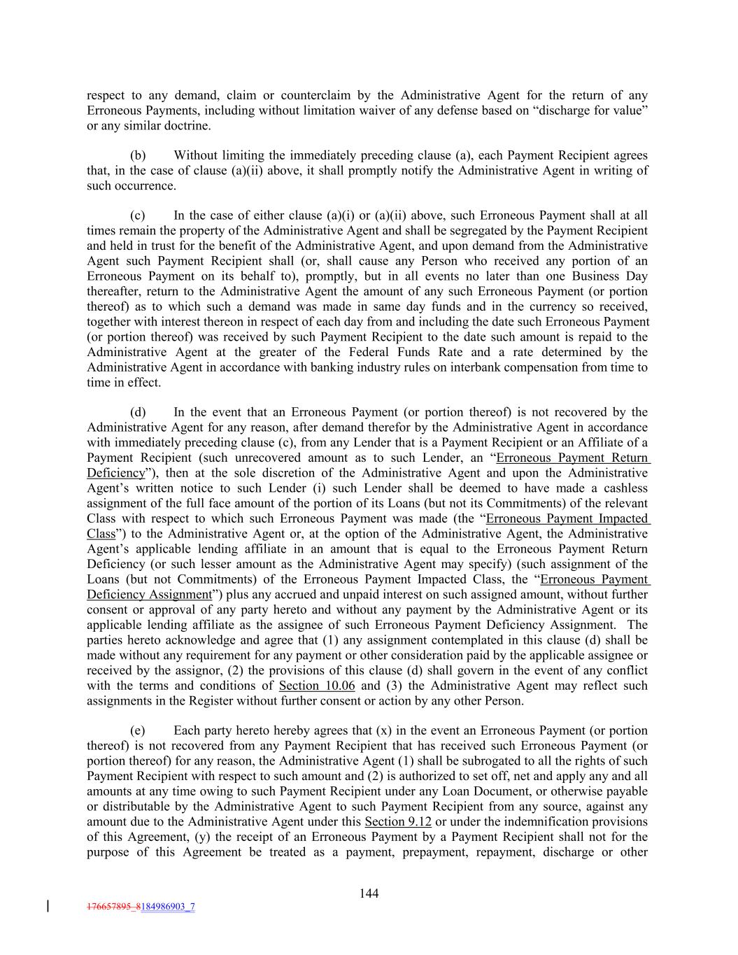 respect to any demand, claim or counterclaim by the Administrative Agent for the return of any Erroneous Payments, including without limitation waiver of any defense based on “discharge for value” or any similar doctrine. (b) Without limiting the immediately preceding clause (a), each Payment Recipient agrees that, in the case of clause (a)(ii) above, it shall promptly notify the Administrative Agent in writing of such occurrence. (c) In the case of either clause (a)(i) or (a)(ii) above, such Erroneous Payment shall at all times remain the property of the Administrative Agent and shall be segregated by the Payment Recipient and held in trust for the benefit of the Administrative Agent, and upon demand from the Administrative Agent such Payment Recipient shall (or, shall cause any Person who received any portion of an Erroneous Payment on its behalf to), promptly, but in all events no later than one Business Day thereafter, return to the Administrative Agent the amount of any such Erroneous Payment (or portion thereof) as to which such a demand was made in same day funds and in the currency so received, together with interest thereon in respect of each day from and including the date such Erroneous Payment (or portion thereof) was received by such Payment Recipient to the date such amount is repaid to the Administrative Agent at the greater of the Federal Funds Rate and a rate determined by the Administrative Agent in accordance with banking industry rules on interbank compensation from time to time in effect. (d) In the event that an Erroneous Payment (or portion thereof) is not recovered by the Administrative Agent for any reason, after demand therefor by the Administrative Agent in accordance with immediately preceding clause (c), from any Lender that is a Payment Recipient or an Affiliate of a Payment Recipient (such unrecovered amount as to such Lender, an “Erroneous Payment Return Deficiency”), then at the sole discretion of the Administrative Agent and upon the Administrative Agent’s written notice to such Lender (i) such Lender shall be deemed to have made a cashless assignment of the full face amount of the portion of its Loans (but not its Commitments) of the relevant Class with respect to which such Erroneous Payment was made (the “Erroneous Payment Impacted Class”) to the Administrative Agent or, at the option of the Administrative Agent, the Administrative Agent’s applicable lending affiliate in an amount that is equal to the Erroneous Payment Return Deficiency (or such lesser amount as the Administrative Agent may specify) (such assignment of the Loans (but not Commitments) of the Erroneous Payment Impacted Class, the “Erroneous Payment Deficiency Assignment”) plus any accrued and unpaid interest on such assigned amount, without further consent or approval of any party hereto and without any payment by the Administrative Agent or its applicable lending affiliate as the assignee of such Erroneous Payment Deficiency Assignment. The parties hereto acknowledge and agree that (1) any assignment contemplated in this clause (d) shall be made without any requirement for any payment or other consideration paid by the applicable assignee or received by the assignor, (2) the provisions of this clause (d) shall govern in the event of any conflict with the terms and conditions of Section 10.06 and (3) the Administrative Agent may reflect such assignments in the Register without further consent or action by any other Person. (e) Each party hereto hereby agrees that (x) in the event an Erroneous Payment (or portion thereof) is not recovered from any Payment Recipient that has received such Erroneous Payment (or portion thereof) for any reason, the Administrative Agent (1) shall be subrogated to all the rights of such Payment Recipient with respect to such amount and (2) is authorized to set off, net and apply any and all amounts at any time owing to such Payment Recipient under any Loan Document, or otherwise payable or distributable by the Administrative Agent to such Payment Recipient from any source, against any amount due to the Administrative Agent under this Section 9.12 or under the indemnification provisions of this Agreement, (y) the receipt of an Erroneous Payment by a Payment Recipient shall not for the purpose of this Agreement be treated as a payment, prepayment, repayment, discharge or other 144 176657895_8184986903_7