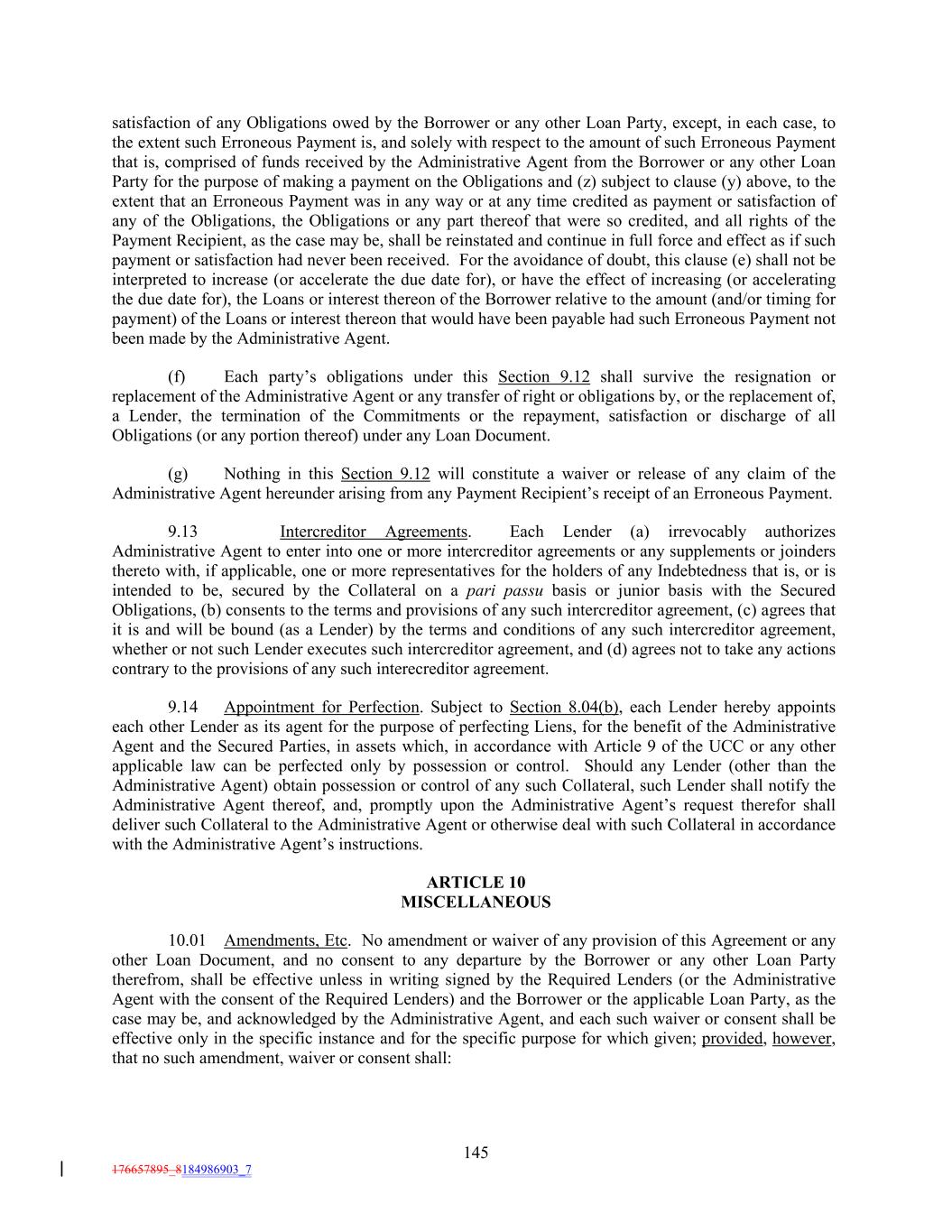 satisfaction of any Obligations owed by the Borrower or any other Loan Party, except, in each case, to the extent such Erroneous Payment is, and solely with respect to the amount of such Erroneous Payment that is, comprised of funds received by the Administrative Agent from the Borrower or any other Loan Party for the purpose of making a payment on the Obligations and (z) subject to clause (y) above, to the extent that an Erroneous Payment was in any way or at any time credited as payment or satisfaction of any of the Obligations, the Obligations or any part thereof that were so credited, and all rights of the Payment Recipient, as the case may be, shall be reinstated and continue in full force and effect as if such payment or satisfaction had never been received. For the avoidance of doubt, this clause (e) shall not be interpreted to increase (or accelerate the due date for), or have the effect of increasing (or accelerating the due date for), the Loans or interest thereon of the Borrower relative to the amount (and/or timing for payment) of the Loans or interest thereon that would have been payable had such Erroneous Payment not been made by the Administrative Agent. (f) Each party’s obligations under this Section 9.12 shall survive the resignation or replacement of the Administrative Agent or any transfer of right or obligations by, or the replacement of, a Lender, the termination of the Commitments or the repayment, satisfaction or discharge of all Obligations (or any portion thereof) under any Loan Document. (g) Nothing in this Section 9.12 will constitute a waiver or release of any claim of the Administrative Agent hereunder arising from any Payment Recipient’s receipt of an Erroneous Payment. 9.13 Intercreditor Agreements. Each Lender (a) irrevocably authorizes Administrative Agent to enter into one or more intercreditor agreements or any supplements or joinders thereto with, if applicable, one or more representatives for the holders of any Indebtedness that is, or is intended to be, secured by the Collateral on a pari passu basis or junior basis with the Secured Obligations, (b) consents to the terms and provisions of any such intercreditor agreement, (c) agrees that it is and will be bound (as a Lender) by the terms and conditions of any such intercreditor agreement, whether or not such Lender executes such intercreditor agreement, and (d) agrees not to take any actions contrary to the provisions of any such interecreditor agreement. 9.14 Appointment for Perfection. Subject to Section 8.04(b), each Lender hereby appoints each other Lender as its agent for the purpose of perfecting Liens, for the benefit of the Administrative Agent and the Secured Parties, in assets which, in accordance with Article 9 of the UCC or any other applicable law can be perfected only by possession or control. Should any Lender (other than the Administrative Agent) obtain possession or control of any such Collateral, such Lender shall notify the Administrative Agent thereof, and, promptly upon the Administrative Agent’s request therefor shall deliver such Collateral to the Administrative Agent or otherwise deal with such Collateral in accordance with the Administrative Agent’s instructions. ARTICLE 10 MISCELLANEOUS 10.01 Amendments, Etc. No amendment or waiver of any provision of this Agreement or any other Loan Document, and no consent to any departure by the Borrower or any other Loan Party therefrom, shall be effective unless in writing signed by the Required Lenders (or the Administrative Agent with the consent of the Required Lenders) and the Borrower or the applicable Loan Party, as the case may be, and acknowledged by the Administrative Agent, and each such waiver or consent shall be effective only in the specific instance and for the specific purpose for which given; provided, however, that no such amendment, waiver or consent shall: 145 176657895_8184986903_7