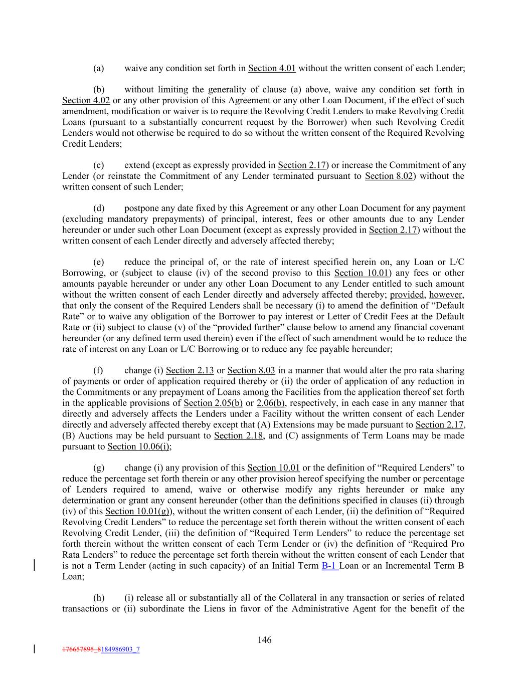 (a) waive any condition set forth in Section 4.01 without the written consent of each Lender; (b) without limiting the generality of clause (a) above, waive any condition set forth in Section 4.02 or any other provision of this Agreement or any other Loan Document, if the effect of such amendment, modification or waiver is to require the Revolving Credit Lenders to make Revolving Credit Loans (pursuant to a substantially concurrent request by the Borrower) when such Revolving Credit Lenders would not otherwise be required to do so without the written consent of the Required Revolving Credit Lenders; (c) extend (except as expressly provided in Section 2.17) or increase the Commitment of any Lender (or reinstate the Commitment of any Lender terminated pursuant to Section 8.02) without the written consent of such Lender; (d) postpone any date fixed by this Agreement or any other Loan Document for any payment (excluding mandatory prepayments) of principal, interest, fees or other amounts due to any Lender hereunder or under such other Loan Document (except as expressly provided in Section 2.17) without the written consent of each Lender directly and adversely affected thereby; (e) reduce the principal of, or the rate of interest specified herein on, any Loan or L/C Borrowing, or (subject to clause (iv) of the second proviso to this Section 10.01) any fees or other amounts payable hereunder or under any other Loan Document to any Lender entitled to such amount without the written consent of each Lender directly and adversely affected thereby; provided, however, that only the consent of the Required Lenders shall be necessary (i) to amend the definition of “Default Rate” or to waive any obligation of the Borrower to pay interest or Letter of Credit Fees at the Default Rate or (ii) subject to clause (v) of the “provided further” clause below to amend any financial covenant hereunder (or any defined term used therein) even if the effect of such amendment would be to reduce the rate of interest on any Loan or L/C Borrowing or to reduce any fee payable hereunder; (f) change (i) Section 2.13 or Section 8.03 in a manner that would alter the pro rata sharing of payments or order of application required thereby or (ii) the order of application of any reduction in the Commitments or any prepayment of Loans among the Facilities from the application thereof set forth in the applicable provisions of Section 2.05(b) or 2.06(b), respectively, in each case in any manner that directly and adversely affects the Lenders under a Facility without the written consent of each Lender directly and adversely affected thereby except that (A) Extensions may be made pursuant to Section 2.17, (B) Auctions may be held pursuant to Section 2.18, and (C) assignments of Term Loans may be made pursuant to Section 10.06(i); (g) change (i) any provision of this Section 10.01 or the definition of “Required Lenders” to reduce the percentage set forth therein or any other provision hereof specifying the number or percentage of Lenders required to amend, waive or otherwise modify any rights hereunder or make any determination or grant any consent hereunder (other than the definitions specified in clauses (ii) through (iv) of this Section 10.01(g)), without the written consent of each Lender, (ii) the definition of “Required Revolving Credit Lenders” to reduce the percentage set forth therein without the written consent of each Revolving Credit Lender, (iii) the definition of “Required Term Lenders” to reduce the percentage set forth therein without the written consent of each Term Lender or (iv) the definition of “Required Pro Rata Lenders” to reduce the percentage set forth therein without the written consent of each Lender that is not a Term Lender (acting in such capacity) of an Initial Term B-1 Loan or an Incremental Term B Loan; (h) (i) release all or substantially all of the Collateral in any transaction or series of related transactions or (ii) subordinate the Liens in favor of the Administrative Agent for the benefit of the 146 176657895_8184986903_7