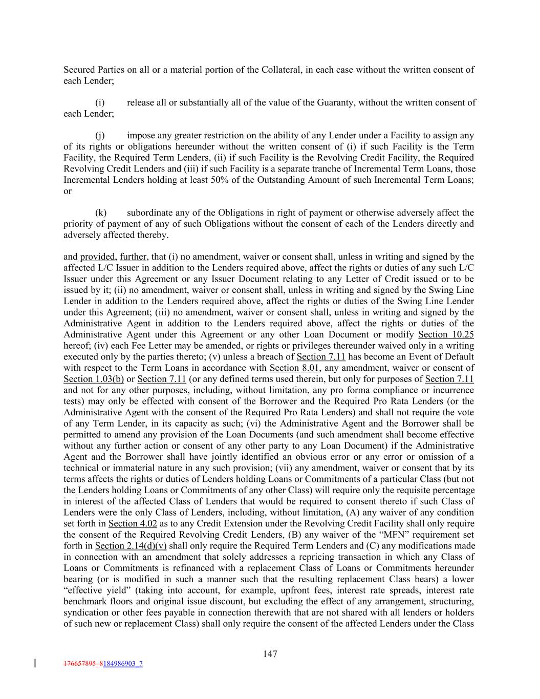 Secured Parties on all or a material portion of the Collateral, in each case without the written consent of each Lender; (i) release all or substantially all of the value of the Guaranty, without the written consent of each Lender; (j) impose any greater restriction on the ability of any Lender under a Facility to assign any of its rights or obligations hereunder without the written consent of (i) if such Facility is the Term Facility, the Required Term Lenders, (ii) if such Facility is the Revolving Credit Facility, the Required Revolving Credit Lenders and (iii) if such Facility is a separate tranche of Incremental Term Loans, those Incremental Lenders holding at least 50% of the Outstanding Amount of such Incremental Term Loans; or (k) subordinate any of the Obligations in right of payment or otherwise adversely affect the priority of payment of any of such Obligations without the consent of each of the Lenders directly and adversely affected thereby. and provided, further, that (i) no amendment, waiver or consent shall, unless in writing and signed by the affected L/C Issuer in addition to the Lenders required above, affect the rights or duties of any such L/C Issuer under this Agreement or any Issuer Document relating to any Letter of Credit issued or to be issued by it; (ii) no amendment, waiver or consent shall, unless in writing and signed by the Swing Line Lender in addition to the Lenders required above, affect the rights or duties of the Swing Line Lender under this Agreement; (iii) no amendment, waiver or consent shall, unless in writing and signed by the Administrative Agent in addition to the Lenders required above, affect the rights or duties of the Administrative Agent under this Agreement or any other Loan Document or modify Section 10.25 hereof; (iv) each Fee Letter may be amended, or rights or privileges thereunder waived only in a writing executed only by the parties thereto; (v) unless a breach of Section 7.11 has become an Event of Default with respect to the Term Loans in accordance with Section 8.01, any amendment, waiver or consent of Section 1.03(b) or Section 7.11 (or any defined terms used therein, but only for purposes of Section 7.11 and not for any other purposes, including, without limitation, any pro forma compliance or incurrence tests) may only be effected with consent of the Borrower and the Required Pro Rata Lenders (or the Administrative Agent with the consent of the Required Pro Rata Lenders) and shall not require the vote of any Term Lender, in its capacity as such; (vi) the Administrative Agent and the Borrower shall be permitted to amend any provision of the Loan Documents (and such amendment shall become effective without any further action or consent of any other party to any Loan Document) if the Administrative Agent and the Borrower shall have jointly identified an obvious error or any error or omission of a technical or immaterial nature in any such provision; (vii) any amendment, waiver or consent that by its terms affects the rights or duties of Lenders holding Loans or Commitments of a particular Class (but not the Lenders holding Loans or Commitments of any other Class) will require only the requisite percentage in interest of the affected Class of Lenders that would be required to consent thereto if such Class of Lenders were the only Class of Lenders, including, without limitation, (A) any waiver of any condition set forth in Section 4.02 as to any Credit Extension under the Revolving Credit Facility shall only require the consent of the Required Revolving Credit Lenders, (B) any waiver of the “MFN” requirement set forth in Section 2.14(d)(v) shall only require the Required Term Lenders and (C) any modifications made in connection with an amendment that solely addresses a repricing transaction in which any Class of Loans or Commitments is refinanced with a replacement Class of Loans or Commitments hereunder bearing (or is modified in such a manner such that the resulting replacement Class bears) a lower “effective yield” (taking into account, for example, upfront fees, interest rate spreads, interest rate benchmark floors and original issue discount, but excluding the effect of any arrangement, structuring, syndication or other fees payable in connection therewith that are not shared with all lenders or holders of such new or replacement Class) shall only require the consent of the affected Lenders under the Class 147 176657895_8184986903_7