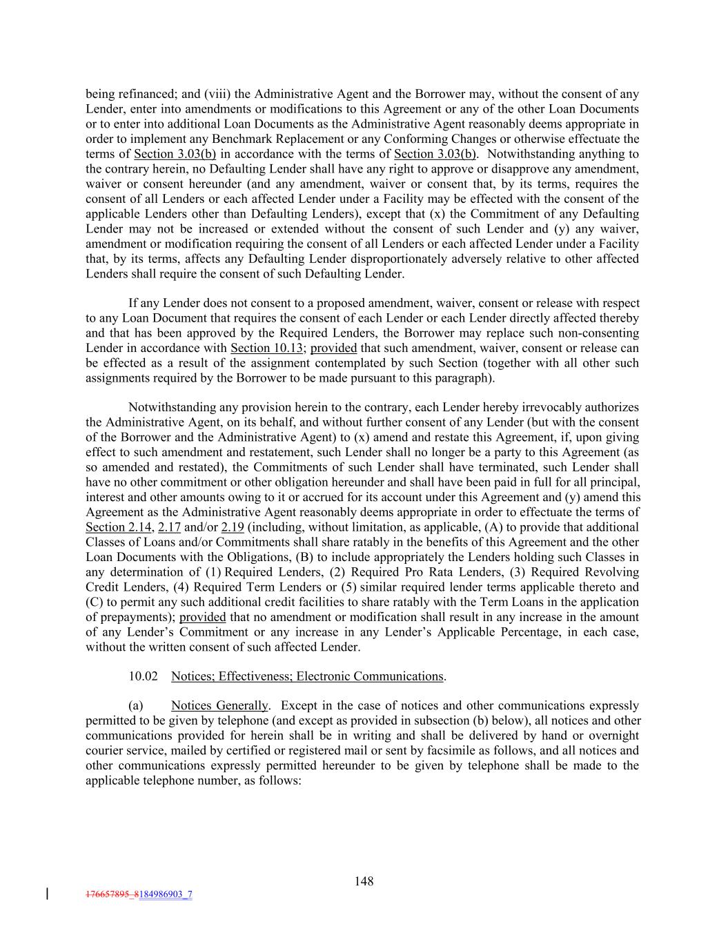 being refinanced; and (viii) the Administrative Agent and the Borrower may, without the consent of any Lender, enter into amendments or modifications to this Agreement or any of the other Loan Documents or to enter into additional Loan Documents as the Administrative Agent reasonably deems appropriate in order to implement any Benchmark Replacement or any Conforming Changes or otherwise effectuate the terms of Section 3.03(b) in accordance with the terms of Section 3.03(b). Notwithstanding anything to the contrary herein, no Defaulting Lender shall have any right to approve or disapprove any amendment, waiver or consent hereunder (and any amendment, waiver or consent that, by its terms, requires the consent of all Lenders or each affected Lender under a Facility may be effected with the consent of the applicable Lenders other than Defaulting Lenders), except that (x) the Commitment of any Defaulting Lender may not be increased or extended without the consent of such Lender and (y) any waiver, amendment or modification requiring the consent of all Lenders or each affected Lender under a Facility that, by its terms, affects any Defaulting Lender disproportionately adversely relative to other affected Lenders shall require the consent of such Defaulting Lender. If any Lender does not consent to a proposed amendment, waiver, consent or release with respect to any Loan Document that requires the consent of each Lender or each Lender directly affected thereby and that has been approved by the Required Lenders, the Borrower may replace such non-consenting Lender in accordance with Section 10.13; provided that such amendment, waiver, consent or release can be effected as a result of the assignment contemplated by such Section (together with all other such assignments required by the Borrower to be made pursuant to this paragraph). Notwithstanding any provision herein to the contrary, each Lender hereby irrevocably authorizes the Administrative Agent, on its behalf, and without further consent of any Lender (but with the consent of the Borrower and the Administrative Agent) to (x) amend and restate this Agreement, if, upon giving effect to such amendment and restatement, such Lender shall no longer be a party to this Agreement (as so amended and restated), the Commitments of such Lender shall have terminated, such Lender shall have no other commitment or other obligation hereunder and shall have been paid in full for all principal, interest and other amounts owing to it or accrued for its account under this Agreement and (y) amend this Agreement as the Administrative Agent reasonably deems appropriate in order to effectuate the terms of Section 2.14, 2.17 and/or 2.19 (including, without limitation, as applicable, (A) to provide that additional Classes of Loans and/or Commitments shall share ratably in the benefits of this Agreement and the other Loan Documents with the Obligations, (B) to include appropriately the Lenders holding such Classes in any determination of (1) Required Lenders, (2) Required Pro Rata Lenders, (3) Required Revolving Credit Lenders, (4) Required Term Lenders or (5) similar required lender terms applicable thereto and (C) to permit any such additional credit facilities to share ratably with the Term Loans in the application of prepayments); provided that no amendment or modification shall result in any increase in the amount of any Lender’s Commitment or any increase in any Lender’s Applicable Percentage, in each case, without the written consent of such affected Lender. 10.02 Notices; Effectiveness; Electronic Communications. (a) Notices Generally. Except in the case of notices and other communications expressly permitted to be given by telephone (and except as provided in subsection (b) below), all notices and other communications provided for herein shall be in writing and shall be delivered by hand or overnight courier service, mailed by certified or registered mail or sent by facsimile as follows, and all notices and other communications expressly permitted hereunder to be given by telephone shall be made to the applicable telephone number, as follows: 148 176657895_8184986903_7