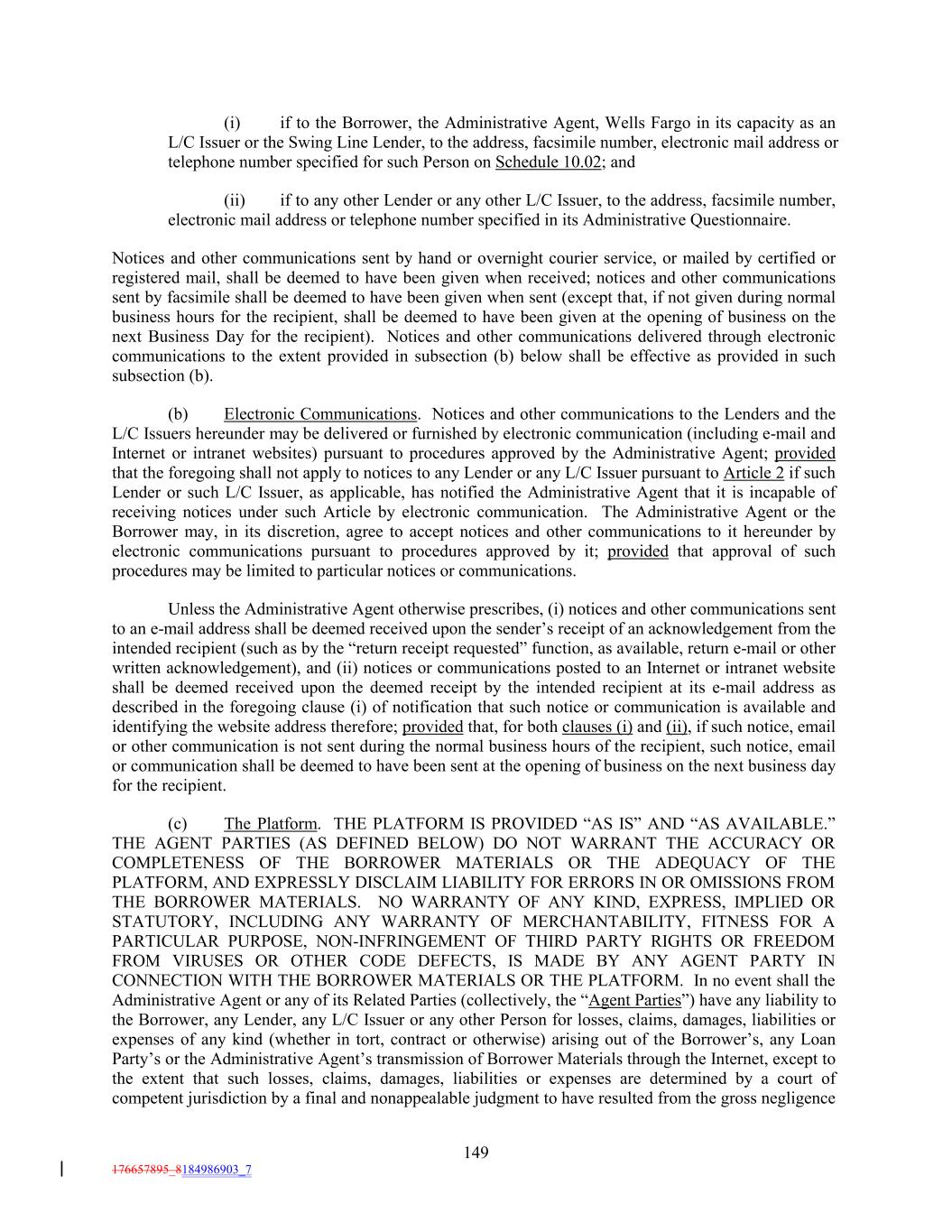 (i) if to the Borrower, the Administrative Agent, Wells Fargo in its capacity as an L/C Issuer or the Swing Line Lender, to the address, facsimile number, electronic mail address or telephone number specified for such Person on Schedule 10.02; and (ii) if to any other Lender or any other L/C Issuer, to the address, facsimile number, electronic mail address or telephone number specified in its Administrative Questionnaire. Notices and other communications sent by hand or overnight courier service, or mailed by certified or registered mail, shall be deemed to have been given when received; notices and other communications sent by facsimile shall be deemed to have been given when sent (except that, if not given during normal business hours for the recipient, shall be deemed to have been given at the opening of business on the next Business Day for the recipient). Notices and other communications delivered through electronic communications to the extent provided in subsection (b) below shall be effective as provided in such subsection (b). (b) Electronic Communications. Notices and other communications to the Lenders and the L/C Issuers hereunder may be delivered or furnished by electronic communication (including e-mail and Internet or intranet websites) pursuant to procedures approved by the Administrative Agent; provided that the foregoing shall not apply to notices to any Lender or any L/C Issuer pursuant to Article 2 if such Lender or such L/C Issuer, as applicable, has notified the Administrative Agent that it is incapable of receiving notices under such Article by electronic communication. The Administrative Agent or the Borrower may, in its discretion, agree to accept notices and other communications to it hereunder by electronic communications pursuant to procedures approved by it; provided that approval of such procedures may be limited to particular notices or communications. Unless the Administrative Agent otherwise prescribes, (i) notices and other communications sent to an e-mail address shall be deemed received upon the sender’s receipt of an acknowledgement from the intended recipient (such as by the “return receipt requested” function, as available, return e-mail or other written acknowledgement), and (ii) notices or communications posted to an Internet or intranet website shall be deemed received upon the deemed receipt by the intended recipient at its e-mail address as described in the foregoing clause (i) of notification that such notice or communication is available and identifying the website address therefore; provided that, for both clauses (i) and (ii), if such notice, email or other communication is not sent during the normal business hours of the recipient, such notice, email or communication shall be deemed to have been sent at the opening of business on the next business day for the recipient. (c) The Platform. THE PLATFORM IS PROVIDED “AS IS” AND “AS AVAILABLE.” THE AGENT PARTIES (AS DEFINED BELOW) DO NOT WARRANT THE ACCURACY OR COMPLETENESS OF THE BORROWER MATERIALS OR THE ADEQUACY OF THE PLATFORM, AND EXPRESSLY DISCLAIM LIABILITY FOR ERRORS IN OR OMISSIONS FROM THE BORROWER MATERIALS. NO WARRANTY OF ANY KIND, EXPRESS, IMPLIED OR STATUTORY, INCLUDING ANY WARRANTY OF MERCHANTABILITY, FITNESS FOR A PARTICULAR PURPOSE, NON-INFRINGEMENT OF THIRD PARTY RIGHTS OR FREEDOM FROM VIRUSES OR OTHER CODE DEFECTS, IS MADE BY ANY AGENT PARTY IN CONNECTION WITH THE BORROWER MATERIALS OR THE PLATFORM. In no event shall the Administrative Agent or any of its Related Parties (collectively, the “Agent Parties”) have any liability to the Borrower, any Lender, any L/C Issuer or any other Person for losses, claims, damages, liabilities or expenses of any kind (whether in tort, contract or otherwise) arising out of the Borrower’s, any Loan Party’s or the Administrative Agent’s transmission of Borrower Materials through the Internet, except to the extent that such losses, claims, damages, liabilities or expenses are determined by a court of competent jurisdiction by a final and nonappealable judgment to have resulted from the gross negligence 149 176657895_8184986903_7