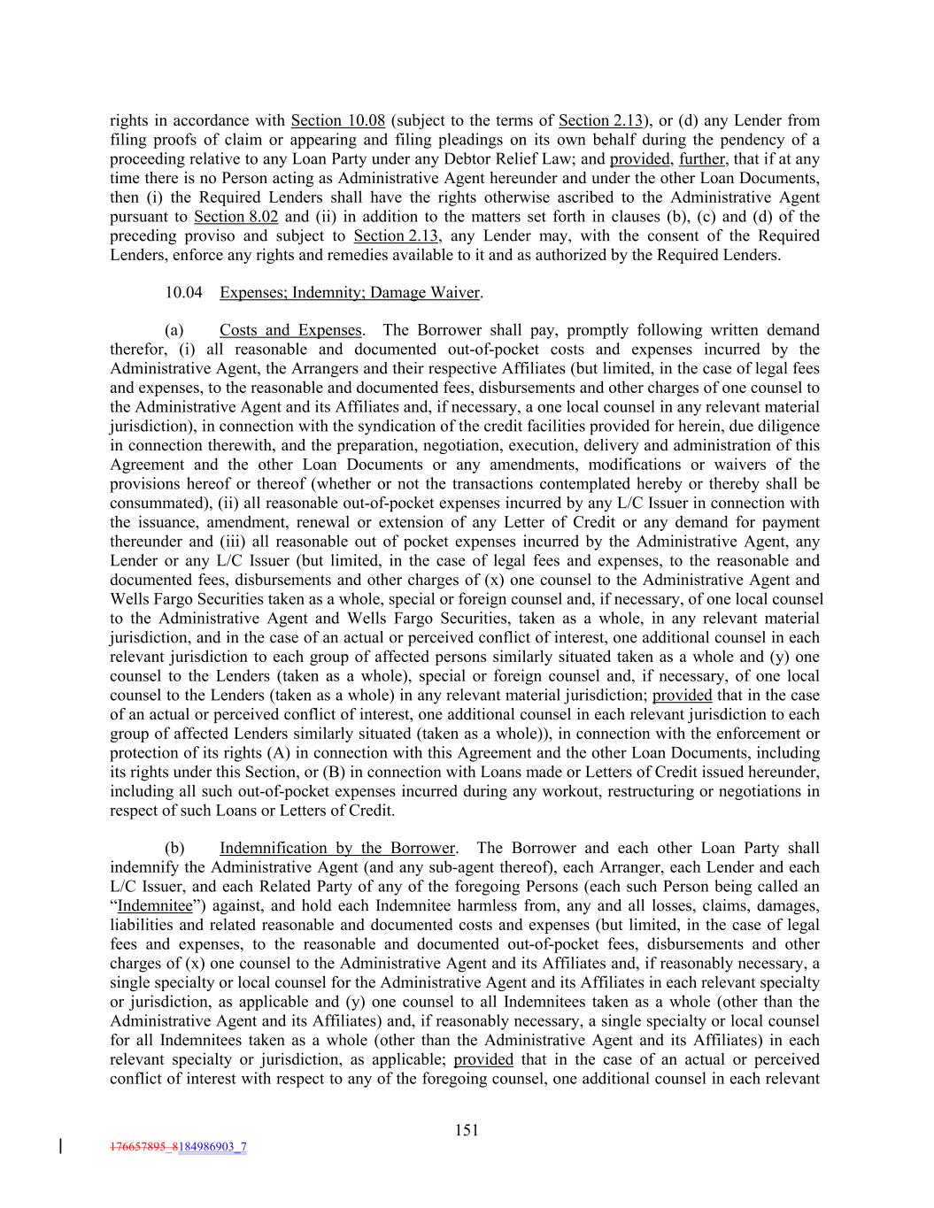 rights in accordance with Section 10.08 (subject to the terms of Section 2.13), or (d) any Lender from filing proofs of claim or appearing and filing pleadings on its own behalf during the pendency of a proceeding relative to any Loan Party under any Debtor Relief Law; and provided, further, that if at any time there is no Person acting as Administrative Agent hereunder and under the other Loan Documents, then (i) the Required Lenders shall have the rights otherwise ascribed to the Administrative Agent pursuant to Section 8.02 and (ii) in addition to the matters set forth in clauses (b), (c) and (d) of the preceding proviso and subject to Section 2.13, any Lender may, with the consent of the Required Lenders, enforce any rights and remedies available to it and as authorized by the Required Lenders. 10.04 Expenses; Indemnity; Damage Waiver. (a) Costs and Expenses. The Borrower shall pay, promptly following written demand therefor, (i) all reasonable and documented out-of-pocket costs and expenses incurred by the Administrative Agent, the Arrangers and their respective Affiliates (but limited, in the case of legal fees and expenses, to the reasonable and documented fees, disbursements and other charges of one counsel to the Administrative Agent and its Affiliates and, if necessary, a one local counsel in any relevant material jurisdiction), in connection with the syndication of the credit facilities provided for herein, due diligence in connection therewith, and the preparation, negotiation, execution, delivery and administration of this Agreement and the other Loan Documents or any amendments, modifications or waivers of the provisions hereof or thereof (whether or not the transactions contemplated hereby or thereby shall be consummated), (ii) all reasonable out-of-pocket expenses incurred by any L/C Issuer in connection with the issuance, amendment, renewal or extension of any Letter of Credit or any demand for payment thereunder and (iii) all reasonable out of pocket expenses incurred by the Administrative Agent, any Lender or any L/C Issuer (but limited, in the case of legal fees and expenses, to the reasonable and documented fees, disbursements and other charges of (x) one counsel to the Administrative Agent and Wells Fargo Securities taken as a whole, special or foreign counsel and, if necessary, of one local counsel to the Administrative Agent and Wells Fargo Securities, taken as a whole, in any relevant material jurisdiction, and in the case of an actual or perceived conflict of interest, one additional counsel in each relevant jurisdiction to each group of affected persons similarly situated taken as a whole and (y) one counsel to the Lenders (taken as a whole), special or foreign counsel and, if necessary, of one local counsel to the Lenders (taken as a whole) in any relevant material jurisdiction; provided that in the case of an actual or perceived conflict of interest, one additional counsel in each relevant jurisdiction to each group of affected Lenders similarly situated (taken as a whole)), in connection with the enforcement or protection of its rights (A) in connection with this Agreement and the other Loan Documents, including its rights under this Section, or (B) in connection with Loans made or Letters of Credit issued hereunder, including all such out-of-pocket expenses incurred during any workout, restructuring or negotiations in respect of such Loans or Letters of Credit. (b) Indemnification by the Borrower. The Borrower and each other Loan Party shall indemnify the Administrative Agent (and any sub-agent thereof), each Arranger, each Lender and each L/C Issuer, and each Related Party of any of the foregoing Persons (each such Person being called an “Indemnitee”) against, and hold each Indemnitee harmless from, any and all losses, claims, damages, liabilities and related reasonable and documented costs and expenses (but limited, in the case of legal fees and expenses, to the reasonable and documented out-of-pocket fees, disbursements and other charges of (x) one counsel to the Administrative Agent and its Affiliates and, if reasonably necessary, a single specialty or local counsel for the Administrative Agent and its Affiliates in each relevant specialty or jurisdiction, as applicable and (y) one counsel to all Indemnitees taken as a whole (other than the Administrative Agent and its Affiliates) and, if reasonably necessary, a single specialty or local counsel for all Indemnitees taken as a whole (other than the Administrative Agent and its Affiliates) in each relevant specialty or jurisdiction, as applicable; provided that in the case of an actual or perceived conflict of interest with respect to any of the foregoing counsel, one additional counsel in each relevant 151 176657895_8184986903_7