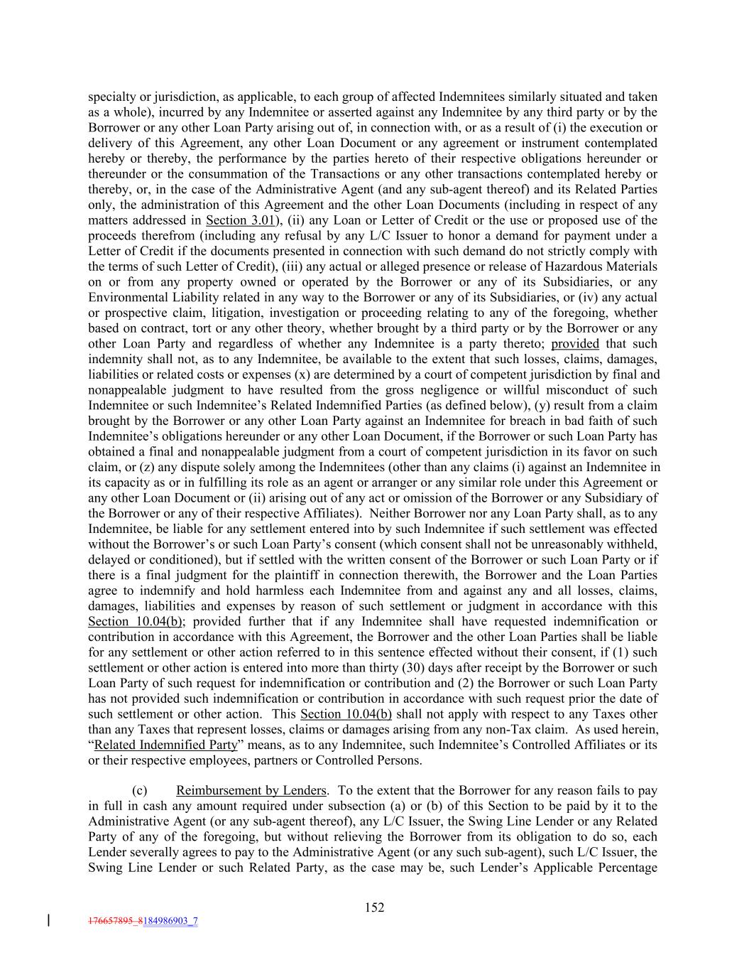 specialty or jurisdiction, as applicable, to each group of affected Indemnitees similarly situated and taken as a whole), incurred by any Indemnitee or asserted against any Indemnitee by any third party or by the Borrower or any other Loan Party arising out of, in connection with, or as a result of (i) the execution or delivery of this Agreement, any other Loan Document or any agreement or instrument contemplated hereby or thereby, the performance by the parties hereto of their respective obligations hereunder or thereunder or the consummation of the Transactions or any other transactions contemplated hereby or thereby, or, in the case of the Administrative Agent (and any sub-agent thereof) and its Related Parties only, the administration of this Agreement and the other Loan Documents (including in respect of any matters addressed in Section 3.01), (ii) any Loan or Letter of Credit or the use or proposed use of the proceeds therefrom (including any refusal by any L/C Issuer to honor a demand for payment under a Letter of Credit if the documents presented in connection with such demand do not strictly comply with the terms of such Letter of Credit), (iii) any actual or alleged presence or release of Hazardous Materials on or from any property owned or operated by the Borrower or any of its Subsidiaries, or any Environmental Liability related in any way to the Borrower or any of its Subsidiaries, or (iv) any actual or prospective claim, litigation, investigation or proceeding relating to any of the foregoing, whether based on contract, tort or any other theory, whether brought by a third party or by the Borrower or any other Loan Party and regardless of whether any Indemnitee is a party thereto; provided that such indemnity shall not, as to any Indemnitee, be available to the extent that such losses, claims, damages, liabilities or related costs or expenses (x) are determined by a court of competent jurisdiction by final and nonappealable judgment to have resulted from the gross negligence or willful misconduct of such Indemnitee or such Indemnitee’s Related Indemnified Parties (as defined below), (y) result from a claim brought by the Borrower or any other Loan Party against an Indemnitee for breach in bad faith of such Indemnitee’s obligations hereunder or any other Loan Document, if the Borrower or such Loan Party has obtained a final and nonappealable judgment from a court of competent jurisdiction in its favor on such claim, or (z) any dispute solely among the Indemnitees (other than any claims (i) against an Indemnitee in its capacity as or in fulfilling its role as an agent or arranger or any similar role under this Agreement or any other Loan Document or (ii) arising out of any act or omission of the Borrower or any Subsidiary of the Borrower or any of their respective Affiliates). Neither Borrower nor any Loan Party shall, as to any Indemnitee, be liable for any settlement entered into by such Indemnitee if such settlement was effected without the Borrower’s or such Loan Party’s consent (which consent shall not be unreasonably withheld, delayed or conditioned), but if settled with the written consent of the Borrower or such Loan Party or if there is a final judgment for the plaintiff in connection therewith, the Borrower and the Loan Parties agree to indemnify and hold harmless each Indemnitee from and against any and all losses, claims, damages, liabilities and expenses by reason of such settlement or judgment in accordance with this Section 10.04(b); provided further that if any Indemnitee shall have requested indemnification or contribution in accordance with this Agreement, the Borrower and the other Loan Parties shall be liable for any settlement or other action referred to in this sentence effected without their consent, if (1) such settlement or other action is entered into more than thirty (30) days after receipt by the Borrower or such Loan Party of such request for indemnification or contribution and (2) the Borrower or such Loan Party has not provided such indemnification or contribution in accordance with such request prior the date of such settlement or other action. This Section 10.04(b) shall not apply with respect to any Taxes other than any Taxes that represent losses, claims or damages arising from any non-Tax claim. As used herein, “Related Indemnified Party” means, as to any Indemnitee, such Indemnitee’s Controlled Affiliates or its or their respective employees, partners or Controlled Persons. (c) Reimbursement by Lenders. To the extent that the Borrower for any reason fails to pay in full in cash any amount required under subsection (a) or (b) of this Section to be paid by it to the Administrative Agent (or any sub-agent thereof), any L/C Issuer, the Swing Line Lender or any Related Party of any of the foregoing, but without relieving the Borrower from its obligation to do so, each Lender severally agrees to pay to the Administrative Agent (or any such sub-agent), such L/C Issuer, the Swing Line Lender or such Related Party, as the case may be, such Lender’s Applicable Percentage 152 176657895_8184986903_7