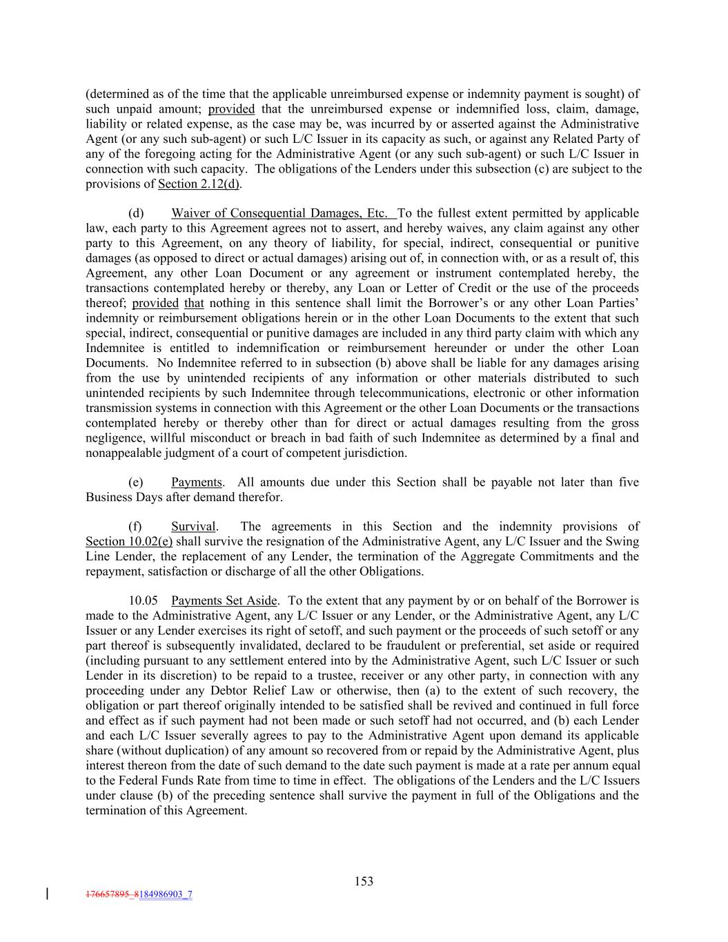 (determined as of the time that the applicable unreimbursed expense or indemnity payment is sought) of such unpaid amount; provided that the unreimbursed expense or indemnified loss, claim, damage, liability or related expense, as the case may be, was incurred by or asserted against the Administrative Agent (or any such sub-agent) or such L/C Issuer in its capacity as such, or against any Related Party of any of the foregoing acting for the Administrative Agent (or any such sub-agent) or such L/C Issuer in connection with such capacity. The obligations of the Lenders under this subsection (c) are subject to the provisions of Section 2.12(d). (d) Waiver of Consequential Damages, Etc. To the fullest extent permitted by applicable law, each party to this Agreement agrees not to assert, and hereby waives, any claim against any other party to this Agreement, on any theory of liability, for special, indirect, consequential or punitive damages (as opposed to direct or actual damages) arising out of, in connection with, or as a result of, this Agreement, any other Loan Document or any agreement or instrument contemplated hereby, the transactions contemplated hereby or thereby, any Loan or Letter of Credit or the use of the proceeds thereof; provided that nothing in this sentence shall limit the Borrower’s or any other Loan Parties’ indemnity or reimbursement obligations herein or in the other Loan Documents to the extent that such special, indirect, consequential or punitive damages are included in any third party claim with which any Indemnitee is entitled to indemnification or reimbursement hereunder or under the other Loan Documents. No Indemnitee referred to in subsection (b) above shall be liable for any damages arising from the use by unintended recipients of any information or other materials distributed to such unintended recipients by such Indemnitee through telecommunications, electronic or other information transmission systems in connection with this Agreement or the other Loan Documents or the transactions contemplated hereby or thereby other than for direct or actual damages resulting from the gross negligence, willful misconduct or breach in bad faith of such Indemnitee as determined by a final and nonappealable judgment of a court of competent jurisdiction. (e) Payments. All amounts due under this Section shall be payable not later than five Business Days after demand therefor. (f) Survival. The agreements in this Section and the indemnity provisions of Section 10.02(e) shall survive the resignation of the Administrative Agent, any L/C Issuer and the Swing Line Lender, the replacement of any Lender, the termination of the Aggregate Commitments and the repayment, satisfaction or discharge of all the other Obligations. 10.05 Payments Set Aside. To the extent that any payment by or on behalf of the Borrower is made to the Administrative Agent, any L/C Issuer or any Lender, or the Administrative Agent, any L/C Issuer or any Lender exercises its right of setoff, and such payment or the proceeds of such setoff or any part thereof is subsequently invalidated, declared to be fraudulent or preferential, set aside or required (including pursuant to any settlement entered into by the Administrative Agent, such L/C Issuer or such Lender in its discretion) to be repaid to a trustee, receiver or any other party, in connection with any proceeding under any Debtor Relief Law or otherwise, then (a) to the extent of such recovery, the obligation or part thereof originally intended to be satisfied shall be revived and continued in full force and effect as if such payment had not been made or such setoff had not occurred, and (b) each Lender and each L/C Issuer severally agrees to pay to the Administrative Agent upon demand its applicable share (without duplication) of any amount so recovered from or repaid by the Administrative Agent, plus interest thereon from the date of such demand to the date such payment is made at a rate per annum equal to the Federal Funds Rate from time to time in effect. The obligations of the Lenders and the L/C Issuers under clause (b) of the preceding sentence shall survive the payment in full of the Obligations and the termination of this Agreement. 153 176657895_8184986903_7