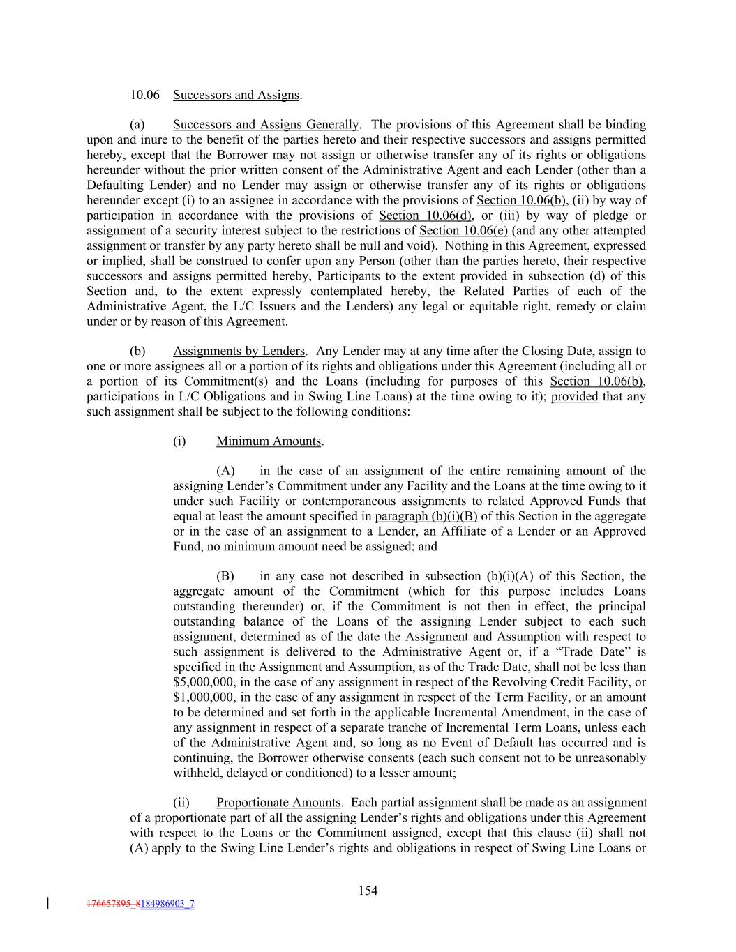 10.06 Successors and Assigns. (a) Successors and Assigns Generally. The provisions of this Agreement shall be binding upon and inure to the benefit of the parties hereto and their respective successors and assigns permitted hereby, except that the Borrower may not assign or otherwise transfer any of its rights or obligations hereunder without the prior written consent of the Administrative Agent and each Lender (other than a Defaulting Lender) and no Lender may assign or otherwise transfer any of its rights or obligations hereunder except (i) to an assignee in accordance with the provisions of Section 10.06(b), (ii) by way of participation in accordance with the provisions of Section 10.06(d), or (iii) by way of pledge or assignment of a security interest subject to the restrictions of Section 10.06(e) (and any other attempted assignment or transfer by any party hereto shall be null and void). Nothing in this Agreement, expressed or implied, shall be construed to confer upon any Person (other than the parties hereto, their respective successors and assigns permitted hereby, Participants to the extent provided in subsection (d) of this Section and, to the extent expressly contemplated hereby, the Related Parties of each of the Administrative Agent, the L/C Issuers and the Lenders) any legal or equitable right, remedy or claim under or by reason of this Agreement. (b) Assignments by Lenders. Any Lender may at any time after the Closing Date, assign to one or more assignees all or a portion of its rights and obligations under this Agreement (including all or a portion of its Commitment(s) and the Loans (including for purposes of this Section 10.06(b), participations in L/C Obligations and in Swing Line Loans) at the time owing to it); provided that any such assignment shall be subject to the following conditions: (i) Minimum Amounts. (A) in the case of an assignment of the entire remaining amount of the assigning Lender’s Commitment under any Facility and the Loans at the time owing to it under such Facility or contemporaneous assignments to related Approved Funds that equal at least the amount specified in paragraph (b)(i)(B) of this Section in the aggregate or in the case of an assignment to a Lender, an Affiliate of a Lender or an Approved Fund, no minimum amount need be assigned; and (B) in any case not described in subsection (b)(i)(A) of this Section, the aggregate amount of the Commitment (which for this purpose includes Loans outstanding thereunder) or, if the Commitment is not then in effect, the principal outstanding balance of the Loans of the assigning Lender subject to each such assignment, determined as of the date the Assignment and Assumption with respect to such assignment is delivered to the Administrative Agent or, if a “Trade Date” is specified in the Assignment and Assumption, as of the Trade Date, shall not be less than $5,000,000, in the case of any assignment in respect of the Revolving Credit Facility, or $1,000,000, in the case of any assignment in respect of the Term Facility, or an amount to be determined and set forth in the applicable Incremental Amendment, in the case of any assignment in respect of a separate tranche of Incremental Term Loans, unless each of the Administrative Agent and, so long as no Event of Default has occurred and is continuing, the Borrower otherwise consents (each such consent not to be unreasonably withheld, delayed or conditioned) to a lesser amount; (ii) Proportionate Amounts. Each partial assignment shall be made as an assignment of a proportionate part of all the assigning Lender’s rights and obligations under this Agreement with respect to the Loans or the Commitment assigned, except that this clause (ii) shall not (A) apply to the Swing Line Lender’s rights and obligations in respect of Swing Line Loans or 154 176657895_8184986903_7