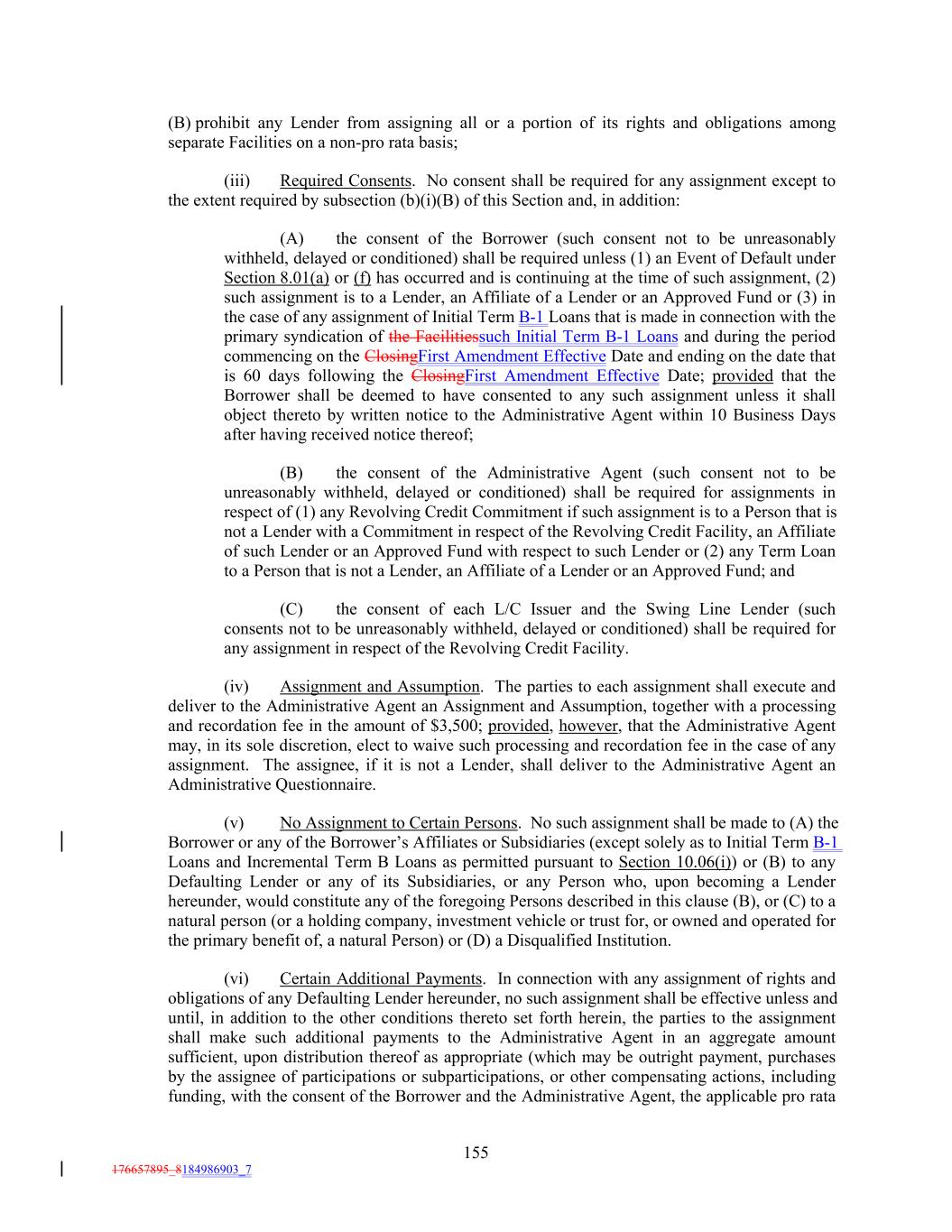 (B) prohibit any Lender from assigning all or a portion of its rights and obligations among separate Facilities on a non-pro rata basis; (iii) Required Consents. No consent shall be required for any assignment except to the extent required by subsection (b)(i)(B) of this Section and, in addition: (A) the consent of the Borrower (such consent not to be unreasonably withheld, delayed or conditioned) shall be required unless (1) an Event of Default under Section 8.01(a) or (f) has occurred and is continuing at the time of such assignment, (2) such assignment is to a Lender, an Affiliate of a Lender or an Approved Fund or (3) in the case of any assignment of Initial Term B-1 Loans that is made in connection with the primary syndication of the Facilitiessuch Initial Term B-1 Loans and during the period commencing on the ClosingFirst Amendment Effective Date and ending on the date that is 60 days following the ClosingFirst Amendment Effective Date; provided that the Borrower shall be deemed to have consented to any such assignment unless it shall object thereto by written notice to the Administrative Agent within 10 Business Days after having received notice thereof; (B) the consent of the Administrative Agent (such consent not to be unreasonably withheld, delayed or conditioned) shall be required for assignments in respect of (1) any Revolving Credit Commitment if such assignment is to a Person that is not a Lender with a Commitment in respect of the Revolving Credit Facility, an Affiliate of such Lender or an Approved Fund with respect to such Lender or (2) any Term Loan to a Person that is not a Lender, an Affiliate of a Lender or an Approved Fund; and (C) the consent of each L/C Issuer and the Swing Line Lender (such consents not to be unreasonably withheld, delayed or conditioned) shall be required for any assignment in respect of the Revolving Credit Facility. (iv) Assignment and Assumption. The parties to each assignment shall execute and deliver to the Administrative Agent an Assignment and Assumption, together with a processing and recordation fee in the amount of $3,500; provided, however, that the Administrative Agent may, in its sole discretion, elect to waive such processing and recordation fee in the case of any assignment. The assignee, if it is not a Lender, shall deliver to the Administrative Agent an Administrative Questionnaire. (v) No Assignment to Certain Persons. No such assignment shall be made to (A) the Borrower or any of the Borrower’s Affiliates or Subsidiaries (except solely as to Initial Term B-1 Loans and Incremental Term B Loans as permitted pursuant to Section 10.06(i)) or (B) to any Defaulting Lender or any of its Subsidiaries, or any Person who, upon becoming a Lender hereunder, would constitute any of the foregoing Persons described in this clause (B), or (C) to a natural person (or a holding company, investment vehicle or trust for, or owned and operated for the primary benefit of, a natural Person) or (D) a Disqualified Institution. (vi) Certain Additional Payments. In connection with any assignment of rights and obligations of any Defaulting Lender hereunder, no such assignment shall be effective unless and until, in addition to the other conditions thereto set forth herein, the parties to the assignment shall make such additional payments to the Administrative Agent in an aggregate amount sufficient, upon distribution thereof as appropriate (which may be outright payment, purchases by the assignee of participations or subparticipations, or other compensating actions, including funding, with the consent of the Borrower and the Administrative Agent, the applicable pro rata 155 176657895_8184986903_7