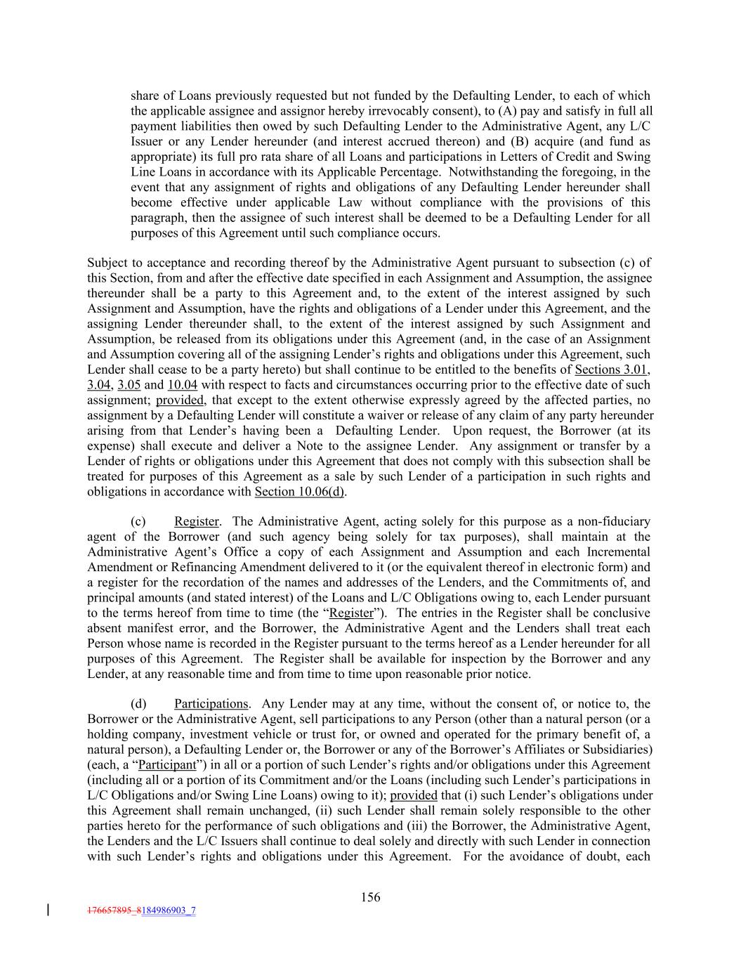 share of Loans previously requested but not funded by the Defaulting Lender, to each of which the applicable assignee and assignor hereby irrevocably consent), to (A) pay and satisfy in full all payment liabilities then owed by such Defaulting Lender to the Administrative Agent, any L/C Issuer or any Lender hereunder (and interest accrued thereon) and (B) acquire (and fund as appropriate) its full pro rata share of all Loans and participations in Letters of Credit and Swing Line Loans in accordance with its Applicable Percentage. Notwithstanding the foregoing, in the event that any assignment of rights and obligations of any Defaulting Lender hereunder shall become effective under applicable Law without compliance with the provisions of this paragraph, then the assignee of such interest shall be deemed to be a Defaulting Lender for all purposes of this Agreement until such compliance occurs. Subject to acceptance and recording thereof by the Administrative Agent pursuant to subsection (c) of this Section, from and after the effective date specified in each Assignment and Assumption, the assignee thereunder shall be a party to this Agreement and, to the extent of the interest assigned by such Assignment and Assumption, have the rights and obligations of a Lender under this Agreement, and the assigning Lender thereunder shall, to the extent of the interest assigned by such Assignment and Assumption, be released from its obligations under this Agreement (and, in the case of an Assignment and Assumption covering all of the assigning Lender’s rights and obligations under this Agreement, such Lender shall cease to be a party hereto) but shall continue to be entitled to the benefits of Sections 3.01, 3.04, 3.05 and 10.04 with respect to facts and circumstances occurring prior to the effective date of such assignment; provided, that except to the extent otherwise expressly agreed by the affected parties, no assignment by a Defaulting Lender will constitute a waiver or release of any claim of any party hereunder arising from that Lender’s having been a Defaulting Lender. Upon request, the Borrower (at its expense) shall execute and deliver a Note to the assignee Lender. Any assignment or transfer by a Lender of rights or obligations under this Agreement that does not comply with this subsection shall be treated for purposes of this Agreement as a sale by such Lender of a participation in such rights and obligations in accordance with Section 10.06(d). (c) Register. The Administrative Agent, acting solely for this purpose as a non-fiduciary agent of the Borrower (and such agency being solely for tax purposes), shall maintain at the Administrative Agent’s Office a copy of each Assignment and Assumption and each Incremental Amendment or Refinancing Amendment delivered to it (or the equivalent thereof in electronic form) and a register for the recordation of the names and addresses of the Lenders, and the Commitments of, and principal amounts (and stated interest) of the Loans and L/C Obligations owing to, each Lender pursuant to the terms hereof from time to time (the “Register”). The entries in the Register shall be conclusive absent manifest error, and the Borrower, the Administrative Agent and the Lenders shall treat each Person whose name is recorded in the Register pursuant to the terms hereof as a Lender hereunder for all purposes of this Agreement. The Register shall be available for inspection by the Borrower and any Lender, at any reasonable time and from time to time upon reasonable prior notice. (d) Participations. Any Lender may at any time, without the consent of, or notice to, the Borrower or the Administrative Agent, sell participations to any Person (other than a natural person (or a holding company, investment vehicle or trust for, or owned and operated for the primary benefit of, a natural person), a Defaulting Lender or, the Borrower or any of the Borrower’s Affiliates or Subsidiaries) (each, a “Participant”) in all or a portion of such Lender’s rights and/or obligations under this Agreement (including all or a portion of its Commitment and/or the Loans (including such Lender’s participations in L/C Obligations and/or Swing Line Loans) owing to it); provided that (i) such Lender’s obligations under this Agreement shall remain unchanged, (ii) such Lender shall remain solely responsible to the other parties hereto for the performance of such obligations and (iii) the Borrower, the Administrative Agent, the Lenders and the L/C Issuers shall continue to deal solely and directly with such Lender in connection with such Lender’s rights and obligations under this Agreement. For the avoidance of doubt, each 156 176657895_8184986903_7