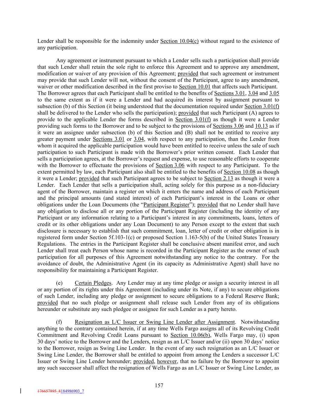 Lender shall be responsible for the indemnity under Section 10.04(c) without regard to the existence of any participation. Any agreement or instrument pursuant to which a Lender sells such a participation shall provide that such Lender shall retain the sole right to enforce this Agreement and to approve any amendment, modification or waiver of any provision of this Agreement; provided that such agreement or instrument may provide that such Lender will not, without the consent of the Participant, agree to any amendment, waiver or other modification described in the first proviso to Section 10.01 that affects such Participant. The Borrower agrees that each Participant shall be entitled to the benefits of Sections 3.01, 3.04 and 3.05 to the same extent as if it were a Lender and had acquired its interest by assignment pursuant to subsection (b) of this Section (it being understood that the documentation required under Section 3.01(f) shall be delivered to the Lender who sells the participation); provided that such Participant (A) agrees to provide to the applicable Lender the forms described in Section 3.01(f) as though it were a Lender providing such forms to the Borrower and to be subject to the provisions of Sections 3.06 and 10.13 as if it were an assignee under subsection (b) of this Section and (B) shall not be entitled to receive any greater payment under Sections 3.01 or 3.04, with respect to any participation, than the Lender from whom it acquired the applicable participation would have been entitled to receive unless the sale of such participation to such Participant is made with the Borrower’s prior written consent. Each Lender that sells a participation agrees, at the Borrower’s request and expense, to use reasonable efforts to cooperate with the Borrower to effectuate the provisions of Section 3.06 with respect to any Participant. To the extent permitted by law, each Participant also shall be entitled to the benefits of Section 10.08 as though it were a Lender; provided that such Participant agrees to be subject to Section 2.13 as though it were a Lender. Each Lender that sells a participation shall, acting solely for this purpose as a non-fiduciary agent of the Borrower, maintain a register on which it enters the name and address of each Participant and the principal amounts (and stated interest) of each Participant’s interest in the Loans or other obligations under the Loan Documents (the “Participant Register”); provided that no Lender shall have any obligation to disclose all or any portion of the Participant Register (including the identity of any Participant or any information relating to a Participant’s interest in any commitments, loans, letters of credit or its other obligations under any Loan Document) to any Person except to the extent that such disclosure is necessary to establish that such commitment, loan, letter of credit or other obligation is in registered form under Section 5f.103-1(c) or proposed Section 1.163-5(b) of the United States Treasury Regulations. The entries in the Participant Register shall be conclusive absent manifest error, and such Lender shall treat each Person whose name is recorded in the Participant Register as the owner of such participation for all purposes of this Agreement notwithstanding any notice to the contrary. For the avoidance of doubt, the Administrative Agent (in its capacity as Administrative Agent) shall have no responsibility for maintaining a Participant Register. (e) Certain Pledges. Any Lender may at any time pledge or assign a security interest in all or any portion of its rights under this Agreement (including under its Note, if any) to secure obligations of such Lender, including any pledge or assignment to secure obligations to a Federal Reserve Bank; provided that no such pledge or assignment shall release such Lender from any of its obligations hereunder or substitute any such pledgee or assignee for such Lender as a party hereto. (f) Resignation as L/C Issuer or Swing Line Lender after Assignment. Notwithstanding anything to the contrary contained herein, if at any time Wells Fargo assigns all of its Revolving Credit Commitment and Revolving Credit Loans pursuant to Section 10.06(b), Wells Fargo may, (i) upon 30 days’ notice to the Borrower and the Lenders, resign as an L/C Issuer and/or (ii) upon 30 days’ notice to the Borrower, resign as Swing Line Lender. In the event of any such resignation as an L/C Issuer or Swing Line Lender, the Borrower shall be entitled to appoint from among the Lenders a successor L/C Issuer or Swing Line Lender hereunder; provided, however, that no failure by the Borrower to appoint any such successor shall affect the resignation of Wells Fargo as an L/C Issuer or Swing Line Lender, as 157 176657895_8184986903_7