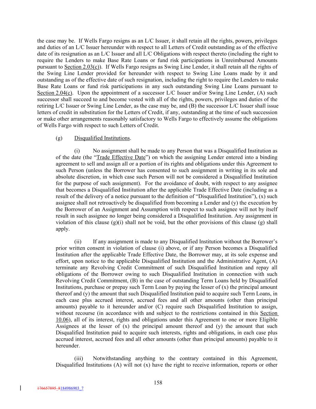 the case may be. If Wells Fargo resigns as an L/C Issuer, it shall retain all the rights, powers, privileges and duties of an L/C Issuer hereunder with respect to all Letters of Credit outstanding as of the effective date of its resignation as an L/C Issuer and all L/C Obligations with respect thereto (including the right to require the Lenders to make Base Rate Loans or fund risk participations in Unreimbursed Amounts pursuant to Section 2.03(c)). If Wells Fargo resigns as Swing Line Lender, it shall retain all the rights of the Swing Line Lender provided for hereunder with respect to Swing Line Loans made by it and outstanding as of the effective date of such resignation, including the right to require the Lenders to make Base Rate Loans or fund risk participations in any such outstanding Swing Line Loans pursuant to Section 2.04(c). Upon the appointment of a successor L/C Issuer and/or Swing Line Lender, (A) such successor shall succeed to and become vested with all of the rights, powers, privileges and duties of the retiring L/C Issuer or Swing Line Lender, as the case may be, and (B) the successor L/C Issuer shall issue letters of credit in substitution for the Letters of Credit, if any, outstanding at the time of such succession or make other arrangements reasonably satisfactory to Wells Fargo to effectively assume the obligations of Wells Fargo with respect to such Letters of Credit. (g) Disqualified Institutions. (i) No assignment shall be made to any Person that was a Disqualified Institution as of the date (the “Trade Effective Date”) on which the assigning Lender entered into a binding agreement to sell and assign all or a portion of its rights and obligations under this Agreement to such Person (unless the Borrower has consented to such assignment in writing in its sole and absolute discretion, in which case such Person will not be considered a Disqualified Institution for the purpose of such assignment). For the avoidance of doubt, with respect to any assignee that becomes a Disqualified Institution after the applicable Trade Effective Date (including as a result of the delivery of a notice pursuant to the definition of “Disqualified Institution”), (x) such assignee shall not retroactively be disqualified from becoming a Lender and (y) the execution by the Borrower of an Assignment and Assumption with respect to such assignee will not by itself result in such assignee no longer being considered a Disqualified Institution. Any assignment in violation of this clause (g)(i) shall not be void, but the other provisions of this clause (g) shall apply. (ii) If any assignment is made to any Disqualified Institution without the Borrower’s prior written consent in violation of clause (i) above, or if any Person becomes a Disqualified Institution after the applicable Trade Effective Date, the Borrower may, at its sole expense and effort, upon notice to the applicable Disqualified Institution and the Administrative Agent, (A) terminate any Revolving Credit Commitment of such Disqualified Institution and repay all obligations of the Borrower owing to such Disqualified Institution in connection with such Revolving Credit Commitment, (B) in the case of outstanding Term Loans held by Disqualified Institutions, purchase or prepay such Term Loan by paying the lesser of (x) the principal amount thereof and (y) the amount that such Disqualified Institution paid to acquire such Term Loans, in each case plus accrued interest, accrued fees and all other amounts (other than principal amounts) payable to it hereunder and/or (C) require such Disqualified Institution to assign, without recourse (in accordance with and subject to the restrictions contained in this Section 10.06), all of its interest, rights and obligations under this Agreement to one or more Eligible Assignees at the lesser of (x) the principal amount thereof and (y) the amount that such Disqualified Institution paid to acquire such interests, rights and obligations, in each case plus accrued interest, accrued fees and all other amounts (other than principal amounts) payable to it hereunder. (iii) Notwithstanding anything to the contrary contained in this Agreement, Disqualified Institutions (A) will not (x) have the right to receive information, reports or other 158 176657895_8184986903_7