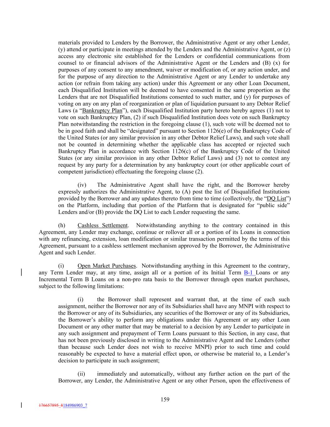 materials provided to Lenders by the Borrower, the Administrative Agent or any other Lender, (y) attend or participate in meetings attended by the Lenders and the Administrative Agent, or (z) access any electronic site established for the Lenders or confidential communications from counsel to or financial advisors of the Administrative Agent or the Lenders and (B) (x) for purposes of any consent to any amendment, waiver or modification of, or any action under, and for the purpose of any direction to the Administrative Agent or any Lender to undertake any action (or refrain from taking any action) under this Agreement or any other Loan Document, each Disqualified Institution will be deemed to have consented in the same proportion as the Lenders that are not Disqualified Institutions consented to such matter, and (y) for purposes of voting on any on any plan of reorganization or plan of liquidation pursuant to any Debtor Relief Laws (a “Bankruptcy Plan”), each Disqualified Institution party hereto hereby agrees (1) not to vote on such Bankruptcy Plan, (2) if such Disqualified Institution does vote on such Bankruptcy Plan notwithstanding the restriction in the foregoing clause (1), such vote will be deemed not to be in good faith and shall be “designated” pursuant to Section 1126(e) of the Bankruptcy Code of the United States (or any similar provision in any other Debtor Relief Laws), and such vote shall not be counted in determining whether the applicable class has accepted or rejected such Bankruptcy Plan in accordance with Section 1126(c) of the Bankruptcy Code of the United States (or any similar provision in any other Debtor Relief Laws) and (3) not to contest any request by any party for a determination by any bankruptcy court (or other applicable court of competent jurisdiction) effectuating the foregoing clause (2). (iv) The Administrative Agent shall have the right, and the Borrower hereby expressly authorizes the Administrative Agent, to (A) post the list of Disqualified Institutions provided by the Borrower and any updates thereto from time to time (collectively, the “DQ List”) on the Platform, including that portion of the Platform that is designated for “public side” Lenders and/or (B) provide the DQ List to each Lender requesting the same. (h) Cashless Settlement. Notwithstanding anything to the contrary contained in this Agreement, any Lender may exchange, continue or rollover all or a portion of its Loans in connection with any refinancing, extension, loan modification or similar transaction permitted by the terms of this Agreement, pursuant to a cashless settlement mechanism approved by the Borrower, the Administrative Agent and such Lender. (i) Open Market Purchases. Notwithstanding anything in this Agreement to the contrary, any Term Lender may, at any time, assign all or a portion of its Initial Term B-1 Loans or any Incremental Term B Loans on a non-pro rata basis to the Borrower through open market purchases, subject to the following limitations: (i) the Borrower shall represent and warrant that, at the time of each such assignment, neither the Borrower nor any of its Subsidiaries shall have any MNPI with respect to the Borrower or any of its Subsidiaries, any securities of the Borrower or any of its Subsidiaries, the Borrower’s ability to perform any obligations under this Agreement or any other Loan Document or any other matter that may be material to a decision by any Lender to participate in any such assignment and prepayment of Term Loans pursuant to this Section, in any case, that has not been previously disclosed in writing to the Administrative Agent and the Lenders (other than because such Lender does not wish to receive MNPI) prior to such time and could reasonably be expected to have a material effect upon, or otherwise be material to, a Lender’s decision to participate in such assignment; (ii) immediately and automatically, without any further action on the part of the Borrower, any Lender, the Administrative Agent or any other Person, upon the effectiveness of 159 176657895_8184986903_7