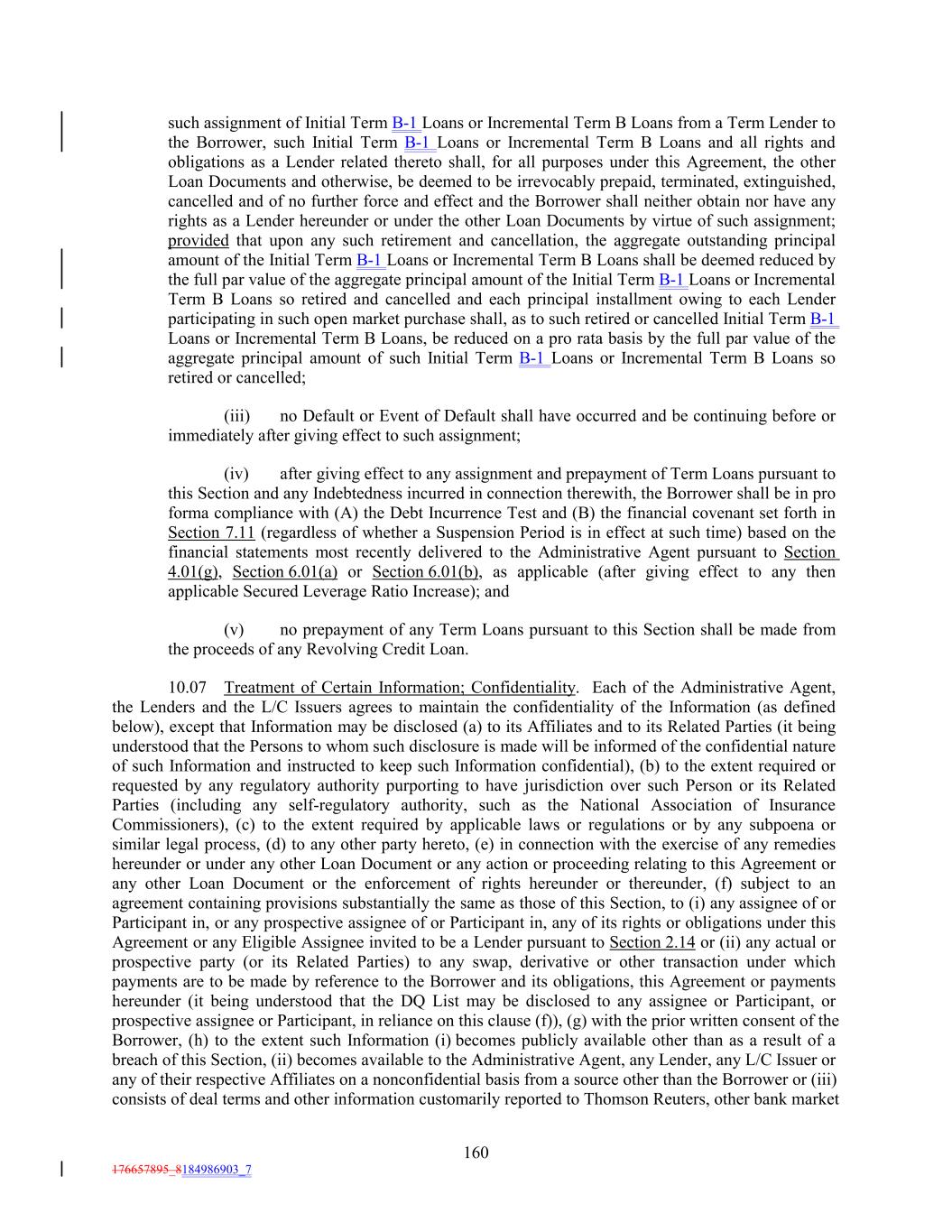 such assignment of Initial Term B-1 Loans or Incremental Term B Loans from a Term Lender to the Borrower, such Initial Term B-1 Loans or Incremental Term B Loans and all rights and obligations as a Lender related thereto shall, for all purposes under this Agreement, the other Loan Documents and otherwise, be deemed to be irrevocably prepaid, terminated, extinguished, cancelled and of no further force and effect and the Borrower shall neither obtain nor have any rights as a Lender hereunder or under the other Loan Documents by virtue of such assignment; provided that upon any such retirement and cancellation, the aggregate outstanding principal amount of the Initial Term B-1 Loans or Incremental Term B Loans shall be deemed reduced by the full par value of the aggregate principal amount of the Initial Term B-1 Loans or Incremental Term B Loans so retired and cancelled and each principal installment owing to each Lender participating in such open market purchase shall, as to such retired or cancelled Initial Term B-1 Loans or Incremental Term B Loans, be reduced on a pro rata basis by the full par value of the aggregate principal amount of such Initial Term B-1 Loans or Incremental Term B Loans so retired or cancelled; (iii) no Default or Event of Default shall have occurred and be continuing before or immediately after giving effect to such assignment; (iv) after giving effect to any assignment and prepayment of Term Loans pursuant to this Section and any Indebtedness incurred in connection therewith, the Borrower shall be in pro forma compliance with (A) the Debt Incurrence Test and (B) the financial covenant set forth in Section 7.11 (regardless of whether a Suspension Period is in effect at such time) based on the financial statements most recently delivered to the Administrative Agent pursuant to Section 4.01(g), Section 6.01(a) or Section 6.01(b), as applicable (after giving effect to any then applicable Secured Leverage Ratio Increase); and (v) no prepayment of any Term Loans pursuant to this Section shall be made from the proceeds of any Revolving Credit Loan. 10.07 Treatment of Certain Information; Confidentiality. Each of the Administrative Agent, the Lenders and the L/C Issuers agrees to maintain the confidentiality of the Information (as defined below), except that Information may be disclosed (a) to its Affiliates and to its Related Parties (it being understood that the Persons to whom such disclosure is made will be informed of the confidential nature of such Information and instructed to keep such Information confidential), (b) to the extent required or requested by any regulatory authority purporting to have jurisdiction over such Person or its Related Parties (including any self-regulatory authority, such as the National Association of Insurance Commissioners), (c) to the extent required by applicable laws or regulations or by any subpoena or similar legal process, (d) to any other party hereto, (e) in connection with the exercise of any remedies hereunder or under any other Loan Document or any action or proceeding relating to this Agreement or any other Loan Document or the enforcement of rights hereunder or thereunder, (f) subject to an agreement containing provisions substantially the same as those of this Section, to (i) any assignee of or Participant in, or any prospective assignee of or Participant in, any of its rights or obligations under this Agreement or any Eligible Assignee invited to be a Lender pursuant to Section 2.14 or (ii) any actual or prospective party (or its Related Parties) to any swap, derivative or other transaction under which payments are to be made by reference to the Borrower and its obligations, this Agreement or payments hereunder (it being understood that the DQ List may be disclosed to any assignee or Participant, or prospective assignee or Participant, in reliance on this clause (f)), (g) with the prior written consent of the Borrower, (h) to the extent such Information (i) becomes publicly available other than as a result of a breach of this Section, (ii) becomes available to the Administrative Agent, any Lender, any L/C Issuer or any of their respective Affiliates on a nonconfidential basis from a source other than the Borrower or (iii) consists of deal terms and other information customarily reported to Thomson Reuters, other bank market 160 176657895_8184986903_7